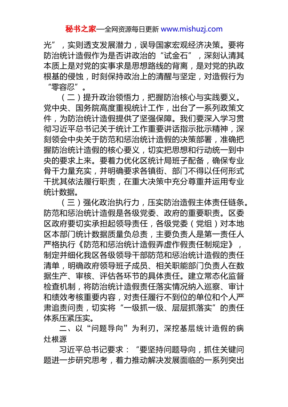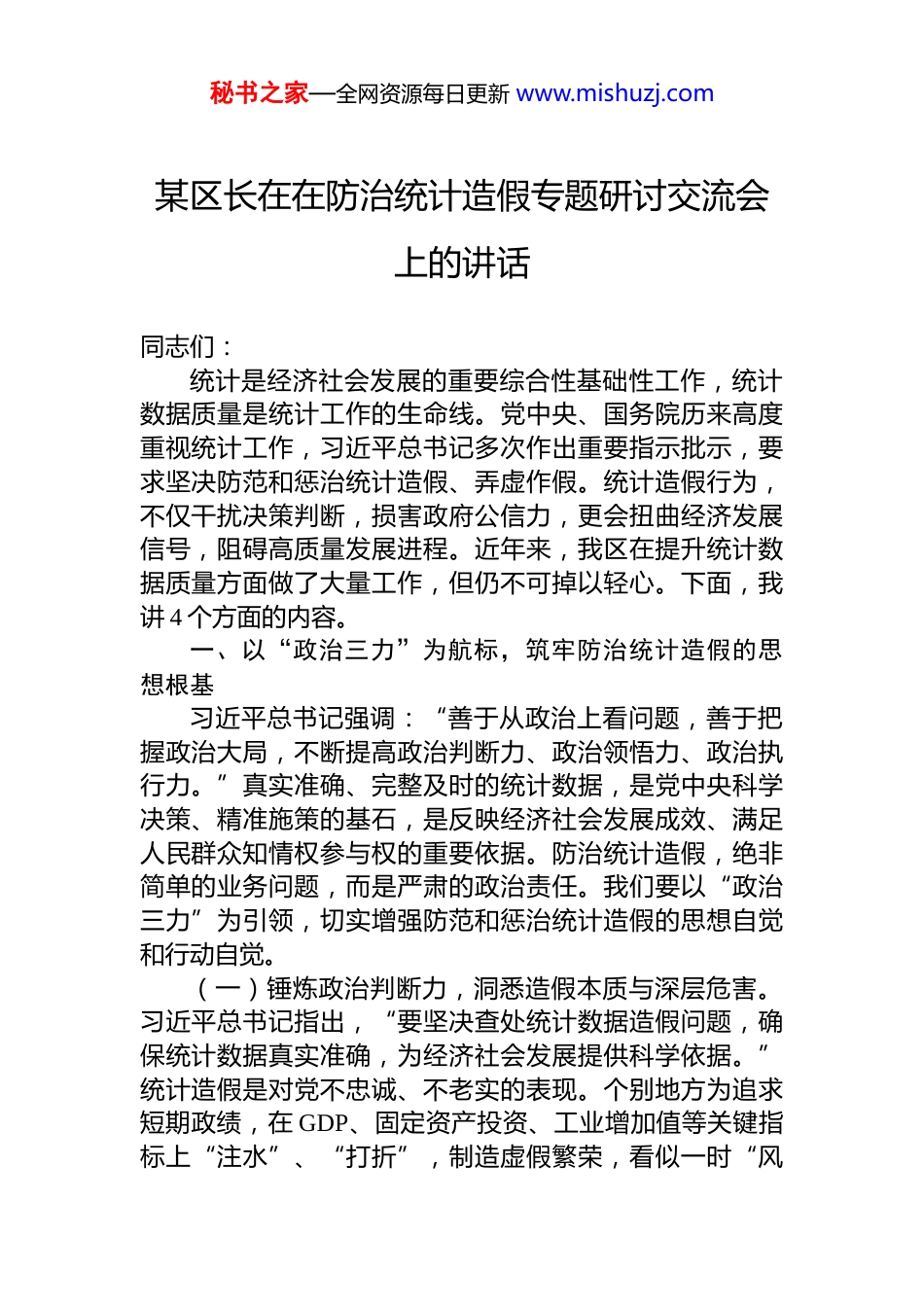 秘书之家—全网资源每日更新 www.mishuzj.com某区长在在防治统计造假专题研讨交流会上的讲话同志们:统计是经济社会发展的重要综合性基础性工作,统计数据质量是统计工作的生命线。党中央、国务院历来高度重视统计工作,习近平总书记多次作出重要指示批示,要求坚决防范和惩治统计造假、弄虚作假。统计造假行为,不仅干扰决策判断,损害政府公信力,更会扭曲经济发展信号,阻碍高质量发展进程。近年来,我区在提升统计数据质量方面做了大量工作,但仍不可掉以轻心。下面,我讲 4 个方面的内容。一、以“政治三力”为航标,筑牢防治统计造假的思想根基习近平总书记强调:“善于从政治上看问题,善于把握政治大局,不断提高政治判断力、政治领悟力、政治执行力。”真实准确、完整及时的统计数据,是党中央科学决策、精准施策的基石,是反映经济社会发展成效、满足人民群众知情权参与权的重要依据。防治统计造假,绝非简单的业务问题,而是严肃的政治责任。我们要以“政治三力”为引领,切实增强防范和惩治统计造假的思想自觉和行动自觉。(一)锤炼政治判断力,洞悉造假本质与深层危害。习近平总书记指出,“要坚决查处统计数据造假问题,确保统计数据真实准确,为经济社会发展提供科学依据。”统计造假是对党不忠诚、不老实的表现。个别地方为追求短期政绩,在 GDP、固定资产投资、工业增加值等关键指标上“注水”、“打折”,制造虚假繁荣,看似一时“风秘书之家—全网资源每日更新 www.mishuzj.com光”,实则透支发展潜力,误导国家宏观经济决策。要将防治统计造假作为是否讲政治的“试金石”,深刻认清其本质上是对党的实事求是思想路线的背离,是对党的执政根基的侵蚀,时刻保持政治上的清醒与坚定,对造假行为“零容忍”。(二)提升政治领悟力,把握防治核心与实践要义。党中央、国务院高度重视统计工作,出台了一系列政策文件,为防治统计造假提供了坚强保障。我们要深入学习贯彻习近平总书记关于统计工作重要讲话指示批示精神,深刻领会中央关于防范和惩治统计造假的决策部署,准确把握防治统计造假的核心要义,切实把思想和行动统一到中央的要求上来。要着力优化区统计局班子配备,确保专业骨干力量充实,并明确要求各镇街、部门不得以任何形式干扰其依法履行职责,在重大决策中充分尊重并运用专业统计数据。(三)强化政治执行力,压实防治造假主体责任链条。防范和惩治统计造假是各级党委、政府的重要职责。区委区政府要切实承担起领导责任,各级党委(党组)对本地区本部门统计数据质量负总责,主要负责人是第一责任人严格执行《防范和惩治统计造假弄虚作假责任制规定》,制定并细化我区各级领导干部防范和惩治统计造假的责任清单,明确政府领导班子成员、相关职能部门负责人在数据生产、审核、评估各环节的具体责任。建立常态化监督检查机制,将防治统计造假责任落实情况纳入巡察、审计和绩效考核重要内容,对责任履行不到位的单位和个人严肃追责问责,切实将“一级抓一级、层层抓落实”的责任体系压紧压实。二、以“问题导向”为利刃,深挖基层统计造假的病灶根源习近平总书记要求:“要坚持问题导向,抓住关键问题进一步研究思考,着力推动解决发展面临的一系列突出秘书之家—全网资源每日更新 www.mishuzj.com矛盾和问题。”防治统计造假,必须奔着问题去、对着问题改。当前,基层仍是统计造假易发高发地带,其背后有着复杂、交织的深层次原因。我们要以 “问题导向” 为突破,深挖基层统计造假的 “病灶源”,采取有效措施加以解决。(一)考核指挥棒“变形”催生造假动机。“上面千条线,下面一根针”,部分考核评价体系未能完全适应新发展理念要求,过度依赖单一经济增速指标、层层加码下达指标任务、重“显绩”轻“潜绩”的考核倾向,给基层造成不当压力。为了不被“一票否决”,或者为了在评比中“胜出”,一些地方就可能铤而走险,“数据出官”的异化思想在一定范围内存在。这就要求我们改进完善高质量发展的政绩考核体系,突出质量效益、结构优化、民生改善、生态环保、风险防范等内涵式指标,合理设置目标值,杜绝不切实际的“加码”和简单的“一...