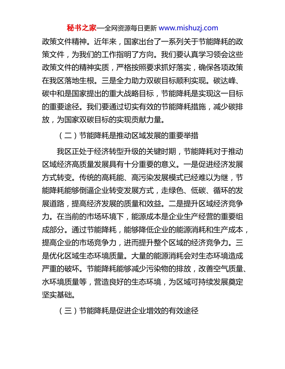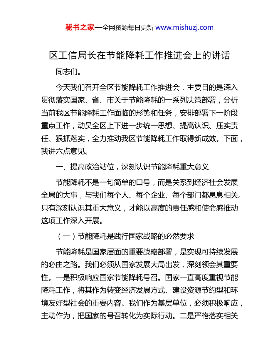 秘书之家—全网资源每日更新 www.mishuzj.com区工信局长在节能降耗工作推进会上的讲话同志们。今天我们召开全区节能降耗工作推进会,主要目的是深入贯彻落实国家、省、市关于节能降耗的一系列决策部署,分析当前我区节能降耗工作面临的形势和任务,安排部署下一阶段重点工作,动员全区上下进一步统一思想、提高认识、压实责任、狠抓落实,全力推动我区节能降耗工作取得新成效。下面,我讲六点意见。一、提高政治站位,深刻认识节能降耗重大意义节能降耗不是一句简单的口号,而是关系到经济社会发展全局的大事,与我们每个人、每个企业、每个部门都息息相关。只有深刻认识其重大意义,才能以高度的责任感和使命感推动这项工作深入开展。(一)节能降耗是践行国家战略的必然要求节能降耗是国家层面的重要战略部署,是实现可持续发展的必由之路。我们必须从国家发展大局出发,深刻领会其重要性。一是积极响应国家节能降耗号召。国家一直高度重视节能降耗工作,将其作为转变经济发展方式、建设资源节约型和环境友好型社会的重要内容。我们作为基层单位,必须积极响应,主动作为,把国家的号召转化为实际行动。二是严格落实相关秘书之家—全网资源每日更新 www.mishuzj.com政策文件精神。近年来,国家出台了一系列关于节能降耗的政策文件,为我们的工作指明了方向。我们要认真学习领会这些政策文件的精神实质,严格按照要求抓好落实,确保各项政策在我区落地生根。三是全力助力双碳目标顺利实现。碳达峰、碳中和是国家提出的重大战略目标,节能降耗是实现这一目标的重要途径。我们要通过切实有效的节能降耗措施,减少碳排放,为国家双碳目标的实现贡献力量。(二)节能降耗是推动区域发展的重要举措我区正处于经济转型升级的关键时期,节能降耗对于推动区域经济高质量发展具有十分重要的意义。一是促进经济发展方式转变。传统的高耗能、高污染发展模式已经难以为继,节能降耗能够倒逼企业转变发展方式,走绿色、低碳、循环的发展道路,提高经济发展的质量和效益。二是提升区域经济竞争力。在当前的市场环境下,能源成本是企业生产经营的重要组成部分。通过节能降耗,能够降低企业的能源消耗和生产成本,提高企业的市场竞争力,进而提升整个区域的经济竞争力。三是优化区域生态环境质量。大量的能源消耗会对生态环境造成严重的破坏。节能降耗能够减少污染物的排放,改善空气质量、水环境质量等,营造良好的生态环境,为区域可持续发展奠定坚实基础。(三)节能降耗是促进企业增效的有效途径秘书之家—全网资源每日更新 www.mishuzj.com企业是节能降耗的主体,开展节能降耗工作,对于企业自身的发展具有重要的现实意义。一是降低企业生产经营成本。能源消耗在企业的生产成本中占比较大,通过节能降耗措施,企业可以减少能源的使用量,降低能源采购成本,从而提高企业的经济效益。二是提高企业能源利用效率。节能降耗工作能够促使企业改进生产工艺、更新生产设备,提高能源的利用效率,实现能源的最大化利用,减少能源浪费。三是增强企业市场适应能力。随着社会对绿色发展的重视,市场对绿色产品的需求日益增加。企业开展节能降耗工作,生产绿色环保产品,能够更好地适应市场需求,拓展市场空间。四是提升企业社会形象。积极开展节能降耗工作,体现了企业的社会责任感,能够赢得社会各界的认可和好评,提升企业的社会形象和美誉度。(四)节能降耗是改善民生福祉的关键环节节能降耗与人民群众的生活息息相关,直接影响到人民群众的生活质量和幸福指数。一是减少环境污染保障群众健康。能源消耗过程中会产生大量的污染物,如二氧化硫、氮氧化物、粉尘等,这些污染物会对空气、水、土壤等造成污染,危害群众的身体健康。节能降耗能够减少污染物排放,改善环境质量,保障群众的身体健康。二是节约能源资源惠及子孙后代。能源资源是有限的,过度消耗会导致能源资源短缺,影响子孙后代的生存和发展。节能降耗能够节约能源资源,实现能源资源的可持续利用,为子孙后代留下宝贵的财富。三是降低能源费用秘书之家—全网资源每日更新 www.mishuzj.com减轻群众负担。随着能源价格的不断上涨,群众...