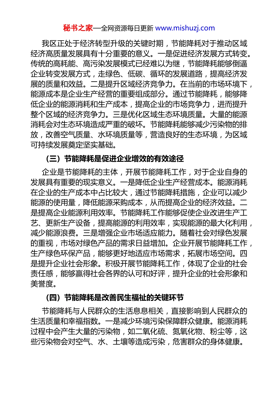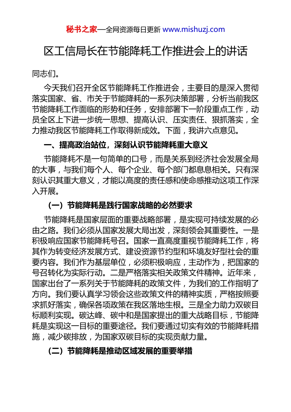 秘书之家—全网资源每日更新 www.mishuzj.com区工信局长在节能降耗工作推进会上的讲话同志们。今天我们召开全区节能降耗工作推进会,主要目的是深入贯彻落实国家、省、市关于节能降耗的一系列决策部署,分析当前我区节能降耗工作面临的形势和任务,安排部署下一阶段重点工作,动员全区上下进一步统一思想、提高认识、压实责任、狠抓落实,全力推动我区节能降耗工作取得新成效。下面,我讲六点意见。一、提高政治站位,深刻认识节能降耗重大意义节能降耗不是一句简单的口号,而是关系到经济社会发展全局的大事,与我们每个人、每个企业、每个部门都息息相关。只有深刻认识其重大意义,才能以高度的责任感和使命感推动这项工作深入开展。(一)节能降耗是践行国家战略的必然要求节能降耗是国家层面的重要战略部署,是实现可持续发展的必由之路。我们必须从国家发展大局出发,深刻领会其重要性。一是积极响应国家节能降耗号召。国家一直高度重视节能降耗工作,将其作为转变经济发展方式、建设资源节约型和环境友好型社会的重要内容。我们作为基层单位,必须积极响应,主动作为,把国家的号召转化为实际行动。二是严格落实相关政策文件精神。近年来,国家出台了一系列关于节能降耗的政策文件,为我们的工作指明了方向。我们要认真学习领会这些政策文件的精神实质,严格按照要求抓好落实,确保各项政策在我区落地生根。三是全力助力双碳目标顺利实现。碳达峰、碳中和是国家提出的重大战略目标,节能降耗是实现这一目标的重要途径。我们要通过切实有效的节能降耗措施,减少碳排放,为国家双碳目标的实现贡献力量。(二)节能降耗是推动区域发展的重要举措秘书之家—全网资源每日更新 www.mishuzj.com我区正处于经济转型升级的关键时期,节能降耗对于推动区域经济高质量发展具有十分重要的意义。一是促进经济发展方式转变。传统的高耗能、高污染发展模式已经难以为继,节能降耗能够倒逼企业转变发展方式,走绿色、低碳、循环的发展道路,提高经济发展的质量和效益。二是提升区域经济竞争力。在当前的市场环境下,能源成本是企业生产经营的重要组成部分。通过节能降耗,能够降低企业的能源消耗和生产成本,提高企业的市场竞争力,进而提升整个区域的经济竞争力。三是优化区域生态环境质量。大量的能源消耗会对生态环境造成严重的破坏。节能降耗能够减少污染物的排放,改善空气质量、水环境质量等,营造良好的生态环境,为区域可持续发展奠定坚实基础。(三)节能降耗是促进企业增效的有效途径企业是节能降耗的主体,开展节能降耗工作,对于企业自身的发展具有重要的现实意义。一是降低企业生产经营成本。能源消耗在企业的生产成本中占比较大,通过节能降耗措施,企业可以减少能源的使用量,降低能源采购成本,从而提高企业的经济效益。二是提高企业能源利用效率。节能降耗工作能够促使企业改进生产工艺、更新生产设备,提高能源的利用效率,实现能源的最大化利用,减少能源浪费。三是增强企业市场适应能力。随着社会对绿色发展的重视,市场对绿色产品的需求日益增加。企业开展节能降耗工作,生产绿色环保产品,能够更好地适应市场需求,拓展市场空间。四是提升企业社会形象。积极开展节能降耗工作,体现了企业的社会责任感,能够赢得社会各界的认可和好评,提升企业的社会形象和美誉度。(四)节能降耗是改善民生福祉的关键环节节能降耗与人民群众的生活息息相关,直接影响到人民群众的生活质量和幸福指数。一是减少环境污染保障群众健康。能源消耗过程中会产生大量的污染物,如二氧化硫、氮氧化物、粉尘等,这些污染物会对空气、水、土壤等造成污染,危害群众的身体健康。秘书之家—全网资源每日更新 www.mishuzj.com节能降耗能够减少污染物排放,改善环境质量,保障群众的身体健康。二是节约能源资源惠及子孙后代。能源资源是有限的,过度消耗会导致能源资源短缺,影响子孙后代的生存和发展。节能降耗能够节约能源资源,实现能源资源的可持续利用,为子孙后代留下宝贵的财富。三是降低能源费用减轻群众负担。随着能源价格的不断上涨,群众的能源费用支出也在不断增加。节能降耗能够提...
