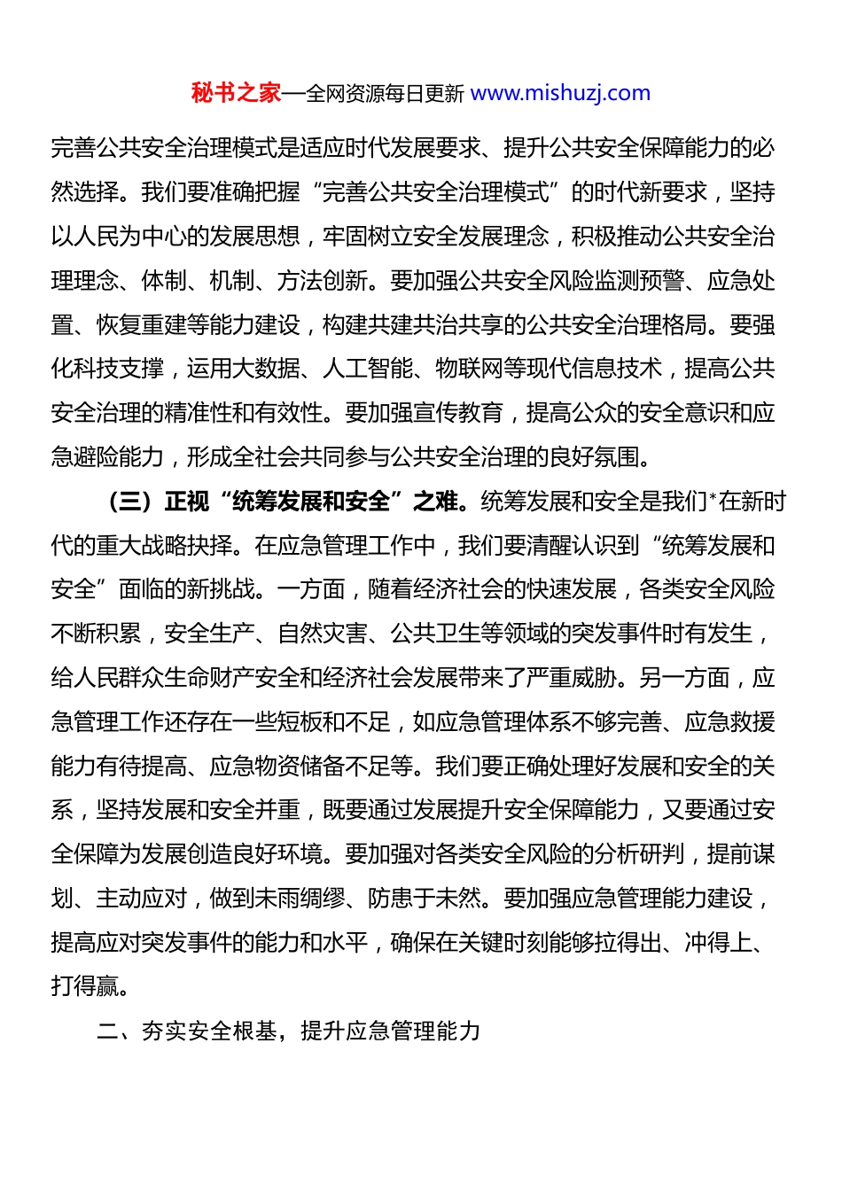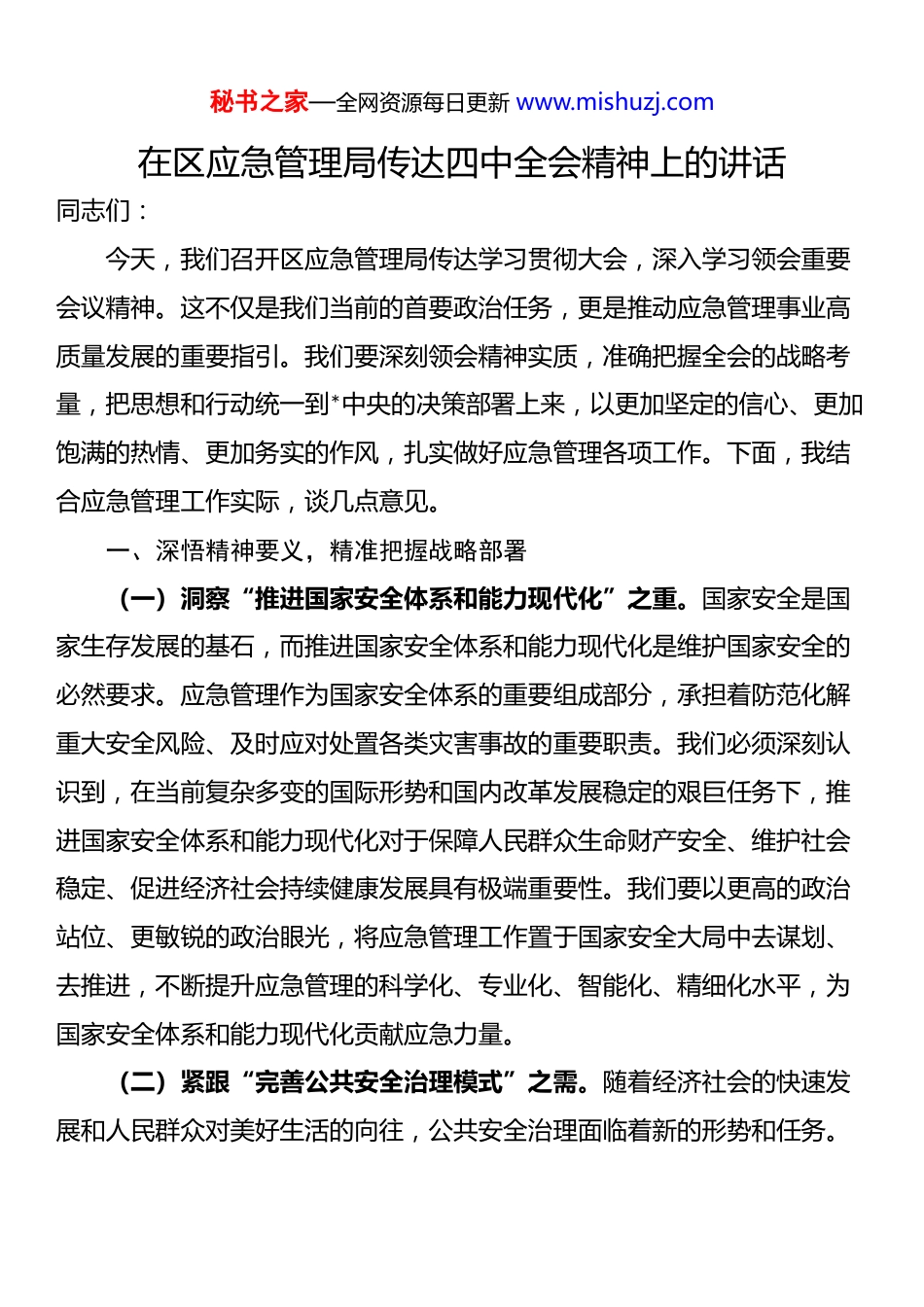 秘书之家—全网资源每日更新 www.mishuzj.com在区应急管理局传达四中全会精神上的讲话同志们:今天,我们召开区应急管理局传达学习贯彻大会,深入学习领会重要会议精神。这不仅是我们当前的首要政治任务,更是推动应急管理事业高质量发展的重要指引。我们要深刻领会精神实质,准确把握全会的战略考量,把思想和行动统一到*中央的决策部署上来,以更加坚定的信心、更加饱满的热情、更加务实的作风,扎实做好应急管理各项工作。下面,我结合应急管理工作实际,谈几点意见。一、深悟精神要义,精准把握战略部署(一)洞察“推进国家安全体系和能力现代化”之重。国家安全是国家生存发展的基石,而推进国家安全体系和能力现代化是维护国家安全的必然要求。应急管理作为国家安全体系的重要组成部分,承担着防范化解重大安全风险、及时应对处置各类灾害事故的重要职责。我们必须深刻认识到,在当前复杂多变的国际形势和国内改革发展稳定的艰巨任务下,推进国家安全体系和能力现代化对于保障人民群众生命财产安全、维护社会稳定、促进经济社会持续健康发展具有极端重要性。我们要以更高的政治站位、更敏锐的政治眼光,将应急管理工作置于国家安全大局中去谋划、去推进,不断提升应急管理的科学化、专业化、智能化、精细化水平,为国家安全体系和能力现代化贡献应急力量。(二)紧跟“完善公共安全治理模式”之需。随着经济社会的快速发展和人民群众对美好生活的向往,公共安全治理面临着新的形势和任务。秘书之家—全网资源每日更新 www.mishuzj.com完善公共安全治理模式是适应时代发展要求、提升公共安全保障能力的必然选择。我们要准确把握“完善公共安全治理模式”的时代新要求,坚持以人民为中心的发展思想,牢固树立安全发展理念,积极推动公共安全治理理念、体制、机制、方法创新。要加强公共安全风险监测预警、应急处置、恢复重建等能力建设,构建共建共治共享的公共安全治理格局。要强化科技支撑,运用大数据、人工智能、物联网等现代信息技术,提高公共安全治理的精准性和有效性。要加强宣传教育,提高公众的安全意识和应急避险能力,形成全社会共同参与公共安全治理的良好氛围。(三)正视“统筹发展和安全”之难。统筹发展和安全是我们*在新时代的重大战略抉择。在应急管理工作中,我们要清醒认识到“统筹发展和安全”面临的新挑战。一方面,随着经济社会的快速发展,各类安全风险不断积累,安全生产、自然灾害、公共卫生等领域的突发事件时有发生,给人民群众生命财产安全和经济社会发展带来了严重威胁。另一方面,应急管理工作还存在一些短板和不足,如应急管理体系不够完善、应急救援能力有待提高、应急物资储备不足等。我们要正确处理好发展和安全的关系,坚持发展和安全并重,既要通过发展提升安全保障能力,又要通过安全保障为发展创造良好环境。要加强对各类安全风险的分析研判,提前谋划、主动应对,做到未雨绸缪、防患于未然。要加强应急管理能力建设,提高应对突发事件的能力和水平,确保在关键时刻能够拉得出、冲得上、打得赢。二、夯实安全根基,提升应急管理能力秘书之家—全网资源每日更新 www.mishuzj.com(一)聚焦体系建设,推动应急管理系统集成。体系化建设是应急管理工作的核心。当前,应急管理工作存在着条块分割、资源分散等问题,影响了应急管理的整体效能。我们要以体系化建设为核心,推动应急管理从“条块分割”向“系统集成”转变。要加强应急管理体制机制建设,建立健全统一指挥、专常兼备、反应灵敏、上下联动的应急管理体制。要加强应急管理部门与其他部门之间的协同配合,打破部门壁垒,实现资源共享、信息互通、协同作战。要加强应急预案体系建设,完善各类应急预案,提高应急预案的科学性、实用性和可操作性。要加强应急物资储备体系建设,优化物资储备布局,提高物资储备保障能力。(二)强化科技赋能,驱动应急管理智慧升级。科技是第一生产力,也是应急管理工作的重要支撑。我们要以科技化赋能为引擎,推动应急管理从“经验主导”向“智慧驱动”转变。要加大科技投入,加强应急管理科技创新平台建设,引进和应用先进的应急管理技术和装...