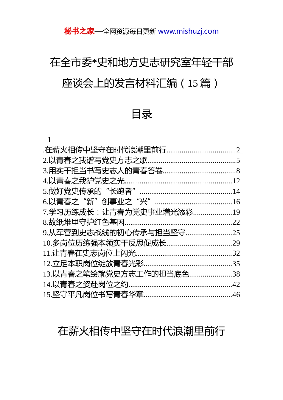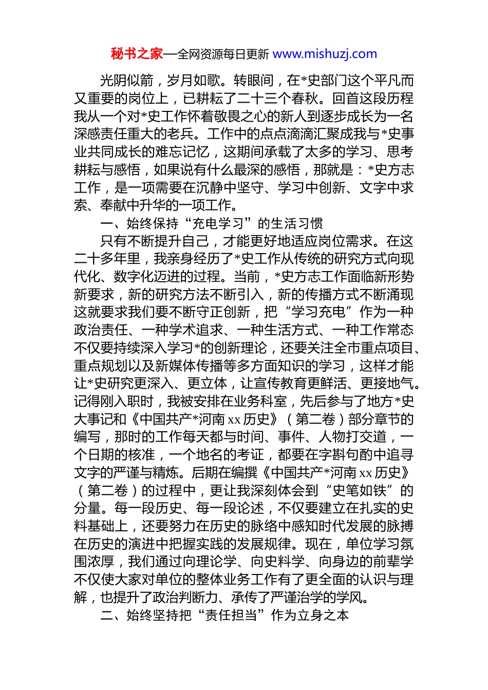 秘书之家—全网资源每日更新 www.mishuzj.com在全市委*史和地方史志研究室年轻干部座谈会上的发言材料汇编(15 篇)目录1.在薪火相传中坚守在时代浪潮里前行....................................22.以青春之我谱写党史方志之歌..............................................53.用实干担当书写史志人的青春答卷......................................84.以青春之我护党史之光........................................................125.做好党史传承的“长跑者”................................................146.以青春之“新”创事业之“兴”........................................167.学习历练成长:让青春为党史事业增光添彩....................198.故纸堆里守护红色基因........................................................229.从军营到史志战线的初心传承与担当坚守........................2510.多岗位历练强本领实干反思促成长..................................2911.让青春在史志岗位上闪光..................................................3212.立足本职岗位绽放青春光彩..............................................3513.以青春之笔绘就党史方志工作的担当底色......................3814.以青春之姿赴岗位之约......................................................4215.坚守平凡岗位书写青春华章..............................................46在薪火相传中坚守在时代浪潮里前行秘书之家—全网资源每日更新 www.mishuzj.com光阴似箭,岁月如歌。转眼间,在*史部门这个平凡而又重要的岗位上,已耕耘了二十三个春秋。回首这段历程我从一个对*史工作怀着敬畏之心的新人到逐步成长为一名深感责任重大的老兵。工作中的点点滴滴汇聚成我与*史事业共同成长的难忘记忆,这期间承载了太多的学习、思考耕耘与感悟,如果说有什么最深的感悟,那就是:*史方志工作,是一项需要在沉静中坚守、学习中创新、文字中求索、奉献中升华的一项工作。一、始终保持“充电学习”的生活习惯只有不断提升自己,才能更好地适应岗位需求。在这二十多年里,我亲身经历了*史工作从传统的研究方式向现代化、数字化迈进的过程。当前,*史方志工作面临新形势新要求,新的研究方法不断引入,新的传播方式不断涌现这就要求我们要不断守正创新,把“学习充电”作为一种政治责任、一种学术追求、一种生活方式、一种工作常态不仅要持续深入学习*的创新理论,还要关注全市重点项目、重点规划以及新媒体传播等多方面知识的学习,这样才能让*史研究更深入、更立体,让宣传教育更鲜活、更接地气。记得刚入职时,我被安排在业务科室,先后参与了地方*史大事记和《中国共产*河南 xx 历史》(第二卷)部分章节的编写,那时的工作每天都与时间、事件、人物打交道,一个日期的核准,一个地名的考证,都要在字斟句酌中追寻文字的严谨与精炼。后期在编撰《中国共产*河南 xx 历史》(第二卷)的过程中,更让我深刻体会到“史笔如铁”的分量。每一段历史、每一段论述,不仅要建立在扎实的史料基础上,还要努力在历史的脉络中感知时代发展的脉搏在历史的演进中把握实践的发展规律。现在,单位学习氛围浓厚,我们通过向理论学、向史料学、向身边的前辈学不仅使大家对单位的整体业务工作有了更全面的认识与理解,也提升了政治判断力、承传了严谨治学的学风。二、始终坚持把“责任担当”作为立身之本秘书之家—全网资源每日更新 www.mishuzj.com在工作中,我认为最重要的品质是脚踏实地把每一件事情做好的那份责任感。因为热情源于热爱、对工作价值感的认同,而责任感源于对自身工作职能的清醒认识。对此,我始终坚持树立正确的政绩观、价值观,坚持“有为才有位”的工作理念,做到干一行、爱一行、专一行,在“干中学、学中干”,把岗位作为最好的课堂。随着岗位的不断转换,我的工作也经历了从专注的“笔头”到繁杂的事务,从文稿统筹、会务安排到上传下达、内外联络等多次变换,但不管哪个岗位、哪项工作,我都随时保持“战斗”状态,经常加班加点,圆满完成承担的各项工作任务。...
