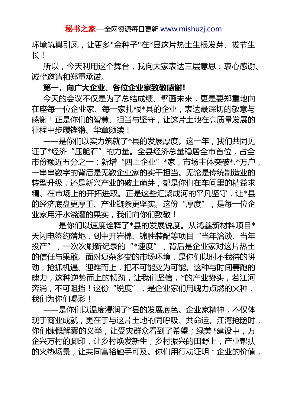 秘书之家—全网资源每日更新 www.mishuzj.com县委书记在全县 2025 年产业高质量发展暨招商大会上的讲话尊敬的各位企业家,同志们:三月春来早,人勤地生宝。今天以全体干部大会的方式共同拉开*年*县产业高质量发展暨招商大会的帷幕。今天的大会嘉宾云集,高朋满座,处处涌动着干事创业的热潮,充盈着合作共赢的期许。在此,我谨代表*县委、县政府,向莅临现场的各位企业家朋友、省市领导以及长期关心*发展的各界人士,致以最热烈的欢迎和最诚挚的感谢!回首过去的一年,我们在深化改革中突破壁垒,在创新驱动中培育动能,全年引进重大项目*个,高新技术产业产值突破*亿元,交出了一张产业筑基、聚链成势的亮眼答卷。这些成就的背后,凝结着在座各位的智慧心血,镌刻着每位奋斗者的勇毅担当。今天的*,正以"产城融合示范县"为目标,加速构建"两新一高"产业矩阵,全力打造要素完备的产业生态圈。本次大会既是分享发展机遇的开放平台,也是政企同心擘画蓝图的战略对话,我们诚意邀请大家深度参与人工智能产业园、绿色能源基地等*个重大项目建设,携手在数字经济赛道、绿色低碳转型中抢占先机。让我们以今天的相聚为新起点,共同浇筑高质量发展的坚实根基,谱写合作共赢的时代新篇!省委、省政府连续三年,以"新春第一会"擂响战鼓。当前,全球产业链深度重构,新质生产力加速崛起。我们清醒认识到,唯有以"十年磨一剑"的定力深耕产业沃土,以"敢为天下先"的胆识抢占发展制高点,才能在激烈竞争中突围制胜。今年,我们将紧扣"强链补链延链"主线,实施"产业能级跃升三年行动",重点打造*大千亿级产业集群,培育*家链主企业,建设*个创新联合体,推动传统产业"老树发新枝"、新兴产业"小苗成大树"、未来产业"新芽结硕果"。今天的招商大会,就是要以全球视野链接高端资源,以最优秘书之家—全网资源每日更新 www.mishuzj.com环境筑巢引凤,让更多"金种子"在*县这片热土生根发芽、拔节生长!所以,今天利用这个舞台,我向大家表达三层意思:衷心感谢、诚挚邀请和郑重承诺。第一,向广大企业、各位企业家致敬感谢!今天的会议不仅是为了总结成绩、擘画未来,更是要郑重地向在座每一位企业家、每一家扎根*县的企业,表达最深切的敬意与感谢!正是你们的智慧、担当与坚守,让这片土地在高质量发展的征程中步履铿锵、华章频续!——是你们以实力筑就了*县的发展厚度。这一年,我们共同见证了*经济“压舱石”的力量。全县经济总量稳居全市首位,占全市份额近五分之一;新增“四上企业”*家,市场主体突破*.*万户,一串串数字的背后是无数企业家的实干担当。无论是传统制造业的转型升级,还是新兴产业的破土萌芽,都是你们在车间里的精益求精、在市场上的开拓进取。正是这些汇聚成河的平凡坚守,让*县的经济底盘更厚重、产业链条更坚实。这份“厚度”,是每一位企业家用汗水浇灌的果实,我们向你们致敬!——是你们以速度诠释了*县的发展锐度。从鸿鑫新材料项目*天闪电签约落地,到中开岩棉、锦胜装配等项目“当年洽谈、当年投产”,一次次刷新纪录的“*速度”,背后是企业家对这片热土的信任与果敢。面对复杂多变的市场环境,是你们以时不我待的拼劲,抢抓机遇、迎难而上,把不可能变为可能。这种与时间赛跑的魄力,这种逆势而上的韧劲,让我们坚信,*的产业势头,若江河奔涌,不可阻挡!这份“锐度”,是企业家们用魄力点燃的火种,我们为你们喝彩!——是你们以温度浸润了*县的发展底色。企业家精神,不仅体现于商业成就,更在于与这片土地的同呼吸、共命运。江湾抢险时,你们慷慨解囊的义举,让受灾群众看到了希望;绿美*建设中,万企兴万村的脚印,让乡村焕发新生;乡村振兴的田野上,产业帮扶的火热场景,让共同富裕触手可及。你们用行动证明:企业的价值,秘书之家—全网资源每日更新 www.mishuzj.com不仅在财务报表的数字里,更在万家灯火的温暖中。这份“温度”,是企业家们以大爱铸就的丰碑,我们为之动容!——是你们以亮度点亮了*县的发展未来。此时此刻,城乡融合产业园的智能生产线正轰鸣作响,实验室的灯火彻夜通明;现代农业园里的智慧大棚孕育着科技兴农的硕果,孟洲坝夜市升...