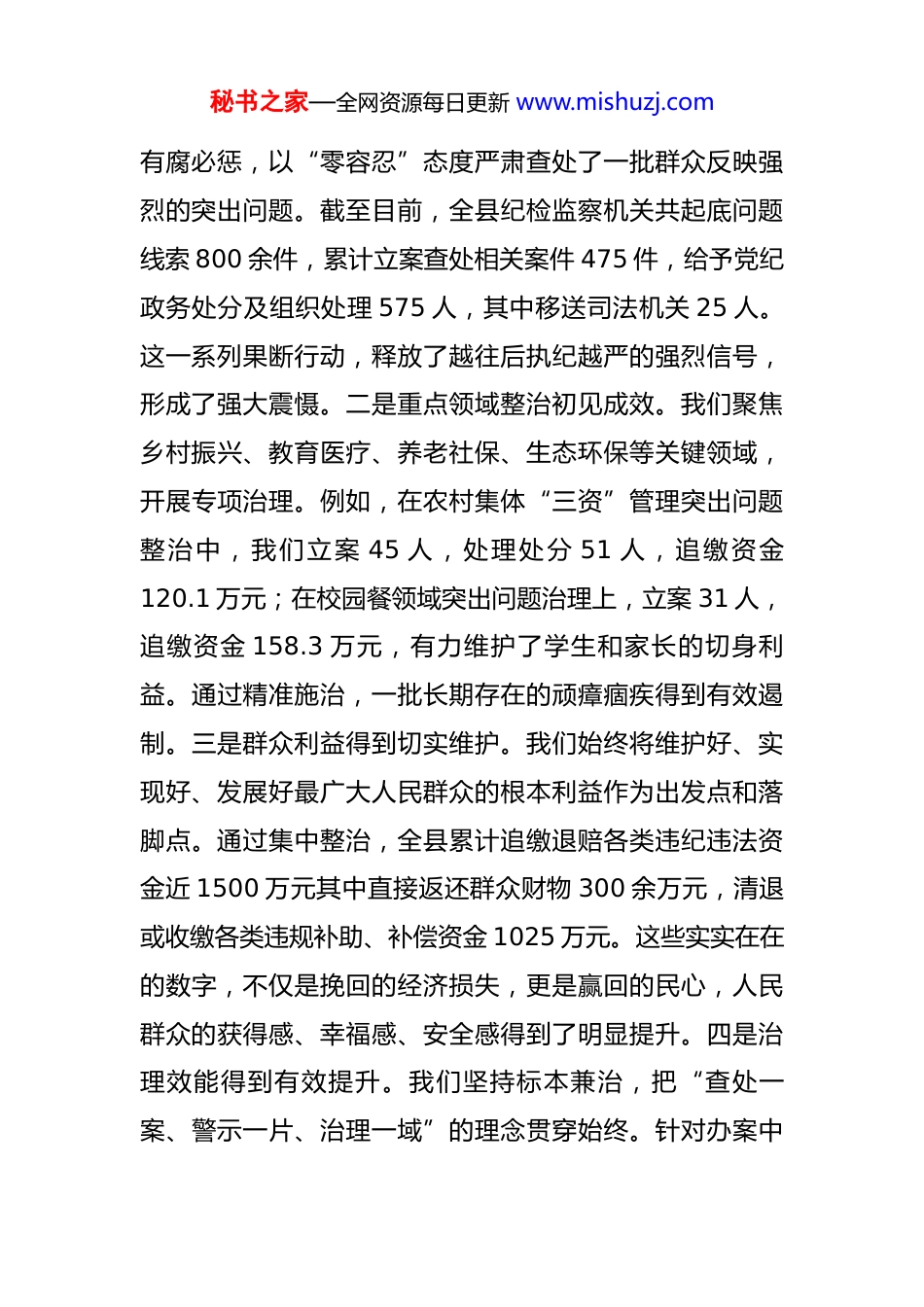 秘书之家—全网资源每日更新 www.mishuzj.com在全县 2025 年群众身边不正之风和腐败问题集中整治工作推进会上的讲话 同志们:今天我们召开全县群众身边不正之风和腐败问题集中整治工作推进会,主要任务是深入学习贯彻全省相关会议精神,总结前一阶段我县集中整治工作成效,分析当前存在的突出问题,对下一步工作进行再动员、再部署、再加压,以更坚定的决心、更有力的举措、更务实的作风,推动集中整治工作向纵深发展,坚决打赢这场正风肃纪反腐的攻坚战。刚才,会议传达了全省推进会议精神,通报了我县集中整治工作的总体情况,相关单位也汇报了重点项目和三大“突击战”的进展,讲得都很好,我完全同意。下面,我讲三点意见。一、肯定成绩,正视问题,切实增强打赢集中整治攻坚战的责任感与紧迫感自全县集中整治工作启动以来,全县上下坚决贯彻落实中央、省委、市委的决策部署,严格对标对表,实行项目化管理、清单化推进,以雷霆之势向群众身边的“蝇贪蚁腐”亮剑,取得了阶段性成效,集中整治的声势和效果初步显现。一是高压震慑持续强化。我们坚持有案必查、秘书之家—全网资源每日更新 www.mishuzj.com有腐必惩,以“零容忍”态度严肃查处了一批群众反映强烈的突出问题。截至目前,全县纪检监察机关共起底问题线索 800 余件,累计立案查处相关案件 475 件,给予党纪政务处分及组织处理 575 人,其中移送司法机关 25 人。这一系列果断行动,释放了越往后执纪越严的强烈信号,形成了强大震慑。二是重点领域整治初见成效。我们聚焦乡村振兴、教育医疗、养老社保、生态环保等关键领域,开展专项治理。例如,在农村集体“三资”管理突出问题整治中,我们立案 45 人,处理处分 51 人,追缴资金120.1 万元;在校园餐领域突出问题治理上,立案 31 人,追缴资金 158.3 万元,有力维护了学生和家长的切身利益。通过精准施治,一批长期存在的顽瘴痼疾得到有效遏制。三是群众利益得到切实维护。我们始终将维护好、实现好、发展好最广大人民群众的根本利益作为出发点和落脚点。通过集中整治,全县累计追缴退赔各类违纪违法资金近 1500 万元其中直接返还群众财物 300 余万元,清退或收缴各类违规补助、补偿资金 1025 万元。这些实实在在的数字,不仅是挽回的经济损失,更是赢回的民心,人民群众的获得感、幸福感、安全感得到了明显提升。四是治理效能得到有效提升。我们坚持标本兼治,把“查处一案、警示一片、治理一域”的理念贯穿始终。针对办案中秘书之家—全网资源每日更新 www.mishuzj.com暴露出的制度漏洞和监管短板,我们督促相关职能部门建立健全制度规范 40 余项,推动了重点领域权力运行的规范化、透明化,一体推进“三不腐”的综合效应正在逐步显现。在肯定成绩的同时,我们必须清醒地认识到,当前我县集中整治工作依然面临严峻复杂的形势,一些深层次问题尚未得到根本解决。我们必须以最清醒的头脑正视这些问题:有的地方和部门思想认识还不到位,存在“上热下冷”、行动迟缓的现象,压力传导层层递减;有的问题线索核查质量不高,满足于表面化处理,深挖彻查、追根溯源的力度不够;有的领域整改整治“走过场”,满足于建章立制,但在实际执行和长效坚持上打了折扣;有的案件查办与群众期盼还有差距,对一些隐藏深、关系复杂的“硬骨头”啃得还不够坚决。这些问题,严重影响了集中整治的整体成效,损害了党和政府的公信力。全县各级党组织和广大党员干部必须深刻认识到,群众身边的不正之风和腐败问题,是啃食群众获得感的“毒瘤”,是动摇党的执政根基的“祸水”。我们已经没有退路,必须以“背水一战、全力攻坚”的姿态,从口号转化为思想共识,从共识升华为行动自觉,以破釜沉舟的勇气和刮骨疗毒的决心,坚决打好打赢这场攻坚战,守护好我们当前来之不易秘书之家—全网资源每日更新 www.mishuzj.com的发展大局。二、聚焦关键,靶向施治,以“雷霆万钧”的态势掀起集中整治新攻势打蛇打七寸,治病要除根。推进集中整治工作走深走实,必须找准症结、抓住要害,以最硬的举措打通堵点、消除痛点。各乡镇(街道)、各部门要以最高标准对照检查,...