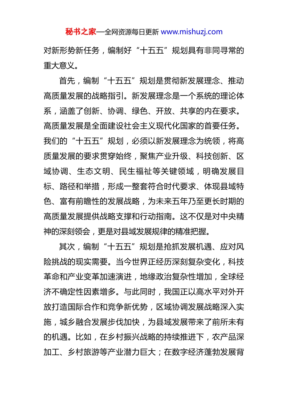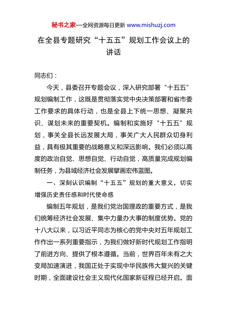 秘书之家—全网资源每日更新 www.mishuzj.com在全县专题研究“十五五”规划工作会议上的讲话 同志们:今天,县委召开专题会议,深入研究部署“十五五”规划编制工作,这既是贯彻落实党中央决策部署和省市委工作要求的具体行动,也是全县上下统一思想、凝聚共识、谋划未来的重要契机。编制和实施好“十五五”规划,事关全县长远发展大局,事关广大人民群众切身利益,具有极其重要的战略意义和深远影响。我们必须以高度的政治自觉、思想自觉、行动自觉,高质量完成规划编制任务,为县域经济社会发展擘画宏伟蓝图。一、深刻认识编制“十五五”规划的重大意义,切实增强历史责任感和时代使命感编制五年规划,是我们党治国理政的重要方式,是我们统筹经济社会发展、集中力量办大事的制度优势。党的十八大以来,以习近平同志为核心的党中央对五年规划工作作出一系列重要指示,为我们做好新时代规划工作指明了前进方向、提供了根本遵循。当前,世界百年未有之大变局加速演进,我国正处于实现中华民族伟大复兴的关键时期,全面建设社会主义现代化国家新征程已经开启。面秘书之家—全网资源每日更新 www.mishuzj.com对新形势新任务,编制好“十五五”规划具有非同寻常的重大意义。首先,编制“十五五”规划是贯彻新发展理念、推动高质量发展的战略指引。新发展理念是一个系统的理论体系,涵盖了创新、协调、绿色、开放、共享的内在要求。高质量发展是全面建设社会主义现代化国家的首要任务。我们的“十五五”规划,必须以新发展理念为统领,将高质量发展的要求贯穿始终,聚焦产业升级、科技创新、区域协调、生态文明、民生福祉等关键领域,明确发展目标、路径和举措,形成一整套符合时代要求、体现县域特色、富有前瞻性的发展战略,为未来五年乃至更长时期的高质量发展提供战略支撑和行动指南。这不仅是对中央精神的深刻领会,更是对县域发展规律的精准把握。其次,编制“十五五”规划是抢抓发展机遇、应对风险挑战的现实需要。当今世界正经历深刻复杂变化,科技革命和产业变革加速演进,地缘政治复杂性增加,全球经济不确定性因素增多。与此同时,我国正以高水平对外开放打造国际合作和竞争新优势,区域协调发展战略深入实施,城乡融合发展步伐加快,为县域发展带来了前所未有的机遇。比如,在乡村振兴战略的持续推进下,农产品深加工、乡村旅游等产业潜力巨大;在数字经济蓬勃发展背秘书之家—全网资源每日更新 www.mishuzj.com景下,智慧农业、数字乡村建设方兴未艾。我们的规划,要善于从危机中育先机、于变局中开新局,前瞻性地研判未来五年可能面临的各种机遇和挑战,积极谋划应对之策,把发展主动权牢牢掌握在自己手中。通过科学规划,能够有效规避盲目投资和低水平重复建设,引导各类资源要素向优势领域集中,提升县域经济的整体竞争力和抗风险能力。再者,编制“十五五”规划是回应人民关切、增进民生福祉的庄严承诺。我们党的一切工作都以人民为中心,为人民谋幸福、为民族谋复兴是我们的初心和使命。五年规划的编制过程,本身就是广泛听取民意、集中民智、回应民盼的过程。“十四五”时期,全县人民生活水平显著提高,公共服务能力持续增强,但群众对美好生活的向往永无止境,在教育、医疗、养老、就业、居住环境等方面仍有新的期待和更高要求。因此,“十五五”规划必须坚持以人民为中心的发展思想,聚焦人民群众最关心最直接最现实的利益问题,系统谋划一批惠民生、暖民心、顺民意的实事工程,持续提升基本公共服务均等化水平,扎实推进共同富裕,让发展成果更多更公平惠及全县人民,增强人民群众的获得感、幸福感、安全感。这不仅是一份发展蓝图,更是一份沉甸甸的民生清单。秘书之家—全网资源每日更新 www.mishuzj.com因此,全县各级各部门必须充分认识到“十五五”规划编制工作的极端重要性,以对历史负责、对人民负责、对未来负责的高度自觉,全身心投入到这项工作中来,以精益求精的态度和务实担当的作风,共同绘就县域高质量发展的新篇章。二、精准把握编制“十五五”规划的核心要义,科学谋划未来五年发展路径编制“十五五”规划,既要保持战略定力,又要富有创新...
