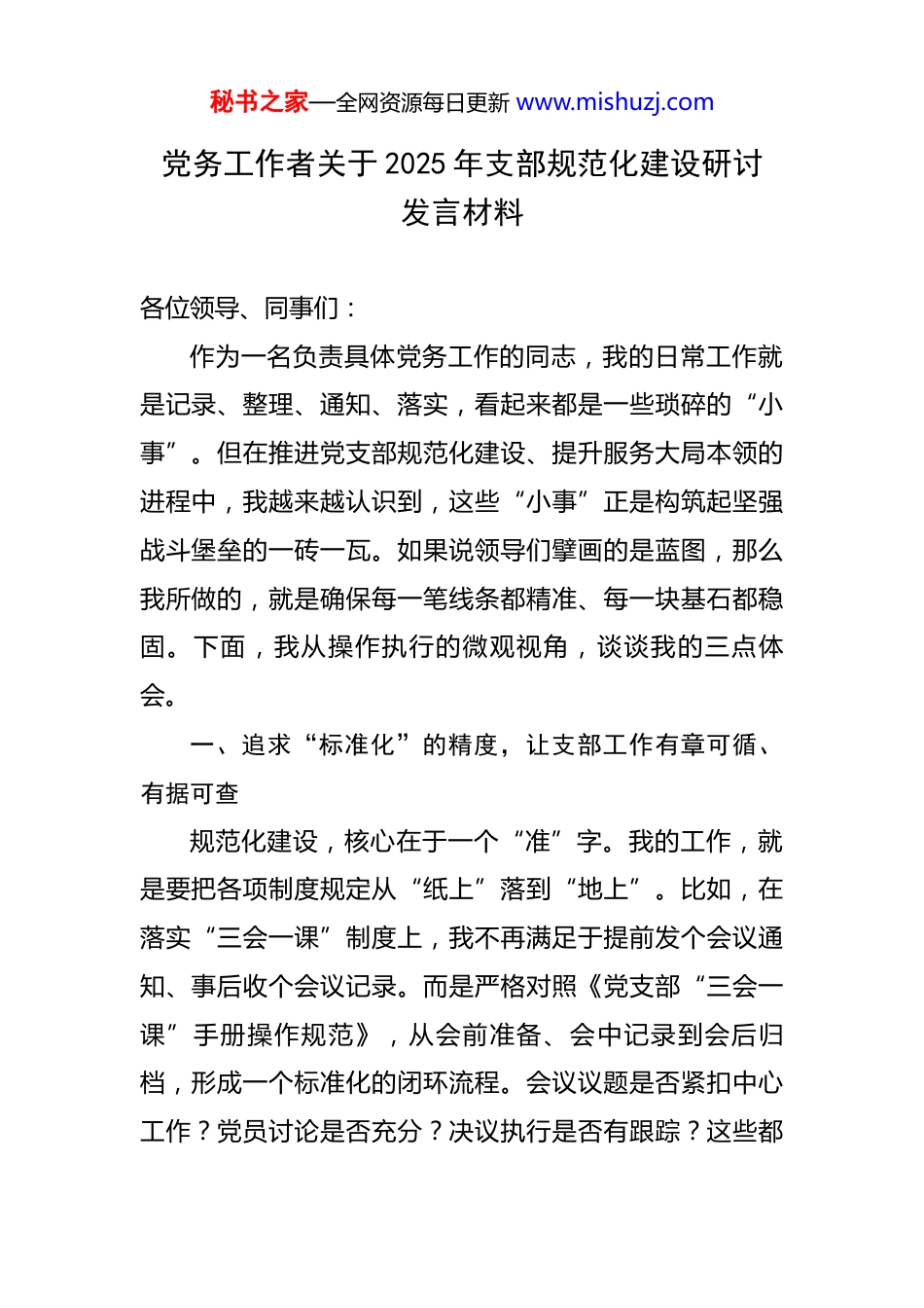 秘书之家—全网资源每日更新 www.mishuzj.com党务工作者关于 2025 年支部规范化建设研讨发言材料 各位领导、同事们:作为一名负责具体党务工作的同志,我的日常工作就是记录、整理、通知、落实,看起来都是一些琐碎的“小事”。但在推进党支部规范化建设、提升服务大局本领的进程中,我越来越认识到,这些“小事”正是构筑起坚强战斗堡垒的一砖一瓦。如果说领导们擘画的是蓝图,那么我所做的,就是确保每一笔线条都精准、每一块基石都稳固。下面,我从操作执行的微观视角,谈谈我的三点体会。一、追求“标准化”的精度,让支部工作有章可循、有据可查规范化建设,核心在于一个“准”字。我的工作,就是要把各项制度规定从“纸上”落到“地上”。比如,在落实“三会一课”制度上,我不再满足于提前发个会议通知、事后收个会议记录。而是严格对照《党支部“三会一课”手册操作规范》,从会前准备、会中记录到会后归档,形成一个标准化的闭环流程。会议议题是否紧扣中心工作?党员讨论是否充分?决议执行是否有跟踪?这些都秘书之家—全网资源每日更新 www.mishuzj.com是我要关注和记录的重点。此外,我院正在全面使用*省党建信息化平台,我负责确保平台上的信息实时更新,无论是组织换届、党员发展,还是每一次支部活动,都及时录入,确保线上与线下完全同步。截至本季度,我们支部已在平台录入各类活动记录超过 150 条。这些看似繁杂的数据,为上级党组织动态掌握支部情况提供了第一手资料,也为我们自身分析研判支部建设状况提供了科学依据,让党建工作从“凭感觉”走向“看数据”。二、倾注“人情味”的温度,让组织关怀直抵人心、凝聚力量党务工作面对的是一个个具体的党员,是有温度的工作。规范化不等于机械化,制度的刚性约束完全可以与组织的柔性关怀相结合。例如,在党费收缴这个环节,我不仅仅是每月在工作群里发一个通知。我会利用这个机会,与每一位党员进行简短的交流,特别是对那些因出差、生病等原因未能及时缴纳的同志,我会主动关心询问情况。这种“多一句嘴”的关心,往往能拉近与党员的距离,让他们感受到组织的温暖。在组织谈心谈话时,我会提前协助支部书记做好充分准备,了解谈话对象的思想动态、工作困难和家庭情况,让谈话能够真正谈到点子上、谈进心坎里,避免“走过场”。同时,我还会细心记录党员提出秘书之家—全网资源每日更新 www.mishuzj.com的意见建议和实际困难,建立一个“微心愿”台账,及时向支部委员会反馈,推动解决。通过这些充满人情味的细节,能够有效增强党员的归属感和认同感,从而将他们更紧密地团结在党支部周围,为服务大局凝聚起强大的人心力量。三、挖掘“数字化”的深度,让工作成效可量化、可评估作为新时代的党务工作者,我认为不能只做“账房先生”,满足于把各项工作记录下来,更要学会做“分析师”,从数据中发现问题、挖掘价值,为支部决策提供参考。我们支部积累了大量的党建数据,这是一座有待开发的“富矿”。我的一个想法是,探索建立一套“党支部健康指数”评估模型。具体来说,就是将党员参会率、学习时长、在“学习强国”等平台的活跃度、参与志愿服务情况、在业务工作中发挥作用的评价等数据进行量化赋分,通过信息化平台自动生成每名党员的“活力指数”,并汇总形成支部的“健康指数”。每季度,我都可以根据这个指数生成一份简报,直观反映支部当前在组织生活、党员教育、作用发挥等方面的强项和弱项。比如,如果数据显示某个阶段关于优化营商环境的专题学习参与度不高,就可以提醒支部书记需要加强这方面的引导。通过这种方秘书之家—全网资源每日更新 www.mishuzj.com式,党务工作就从简单的“记录员”,转变为提升支部建设质量和履职效能的“助推器”,以精细化的“绣花功夫”,为支部更好地服务中心大局提供精准导航。