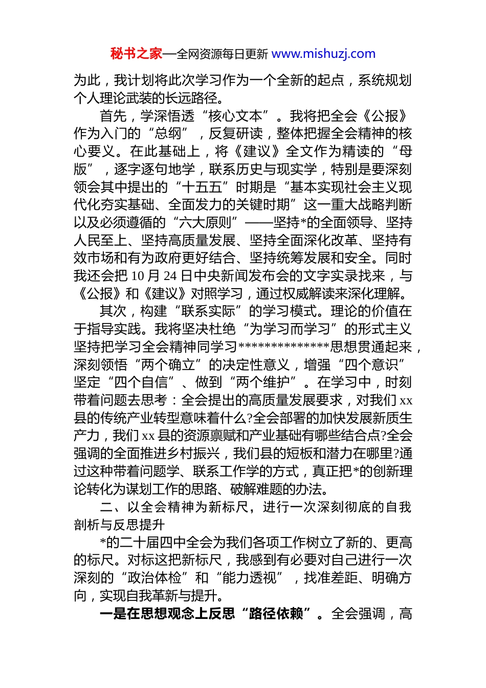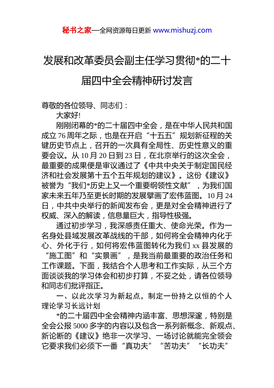 秘书之家—全网资源每日更新 www.mishuzj.com发展和改革委员会副主任学习贯彻*的二十届四中全会精神研讨发言尊敬的各位领导、同志们:大家好!刚刚闭幕的*的二十届四中全会,是在中华人民共和国成立 76 周年之际,也是在开启“十五五”规划新征程的关键历史节点上,召开的一次具有全局性、历史性意义的重要会议。从 10 月 20 日到 23 日,在北京举行的这次全会,最重要的成果便是审议通过了《中共中央关于制定国民经济和社会发展第十五个五年规划的建议》。这份《建议》被誉为“我们*历史上又一个重要纲领性文献”,为我们国家未来五年乃至更长时期的发展擘画了宏伟蓝图。10 月 24日,中共中央举行的新闻发布会,更是对全会精神进行了权威、深入的解读,信息量巨大,指导性极强。通过初步学习,我深感责任重大、使命光荣。作为一名身处县域发展改革战线的干部,如何将全会精神内化于心、外化于行,如何将宏伟蓝图转化为我们 xx 县发展的“施工图”和“实景画”,是我当前最重要的政治任务和工作课题。下面,我结合个人思考和工作实际,从三个方面谈谈我的学习体会和初步打算,不妥之处,请各位领导和同志们批评指正。一、以此次学习为新起点,制定一份持之以恒的个人理论学习长远计划*的二十届四中全会精神内涵丰富、思想深邃,特别是全会公报 5000 多字的内容以及包含一系列新概念、新观点、新论断的《建议》绝非一次学习、一场讨论就能完全领会它要求我们必须下一番“真功夫”“苦功夫”“长功夫”秘书之家—全网资源每日更新 www.mishuzj.com为此,我计划将此次学习作为一个全新的起点,系统规划个人理论武装的长远路径。首先,学深悟透“核心文本”。我将把全会《公报》作为入门的“总纲”,反复研读,整体把握全会精神的核心要义。在此基础上,将《建议》全文作为精读的“母版”,逐字逐句地学,联系历史与现实学,特别是要深刻领会其中提出的“十五五”时期是“基本实现社会主义现代化夯实基础、全面发力的关键时期”这一重大战略判断以及必须遵循的“六大原则”——坚持*的全面领导、坚持人民至上、坚持高质量发展、坚持全面深化改革、坚持有效市场和有为政府更好结合、坚持统筹发展和安全。同时我还会把 10 月 24 日中央新闻发布会的文字实录找来,与《公报》和《建议》对照学习,通过权威解读来深化理解。其次,构建“联系实际”的学习模式。理论的价值在于指导实践。我将坚决杜绝“为学习而学习”的形式主义坚持把学习全会精神同学习**************思想贯通起来,深刻领悟“两个确立”的决定性意义,增强“四个意识”坚定“四个自信”、做到“两个维护”。在学习中,时刻带着问题去思考:全会提出的高质量发展要求,对我们 xx县的传统产业转型意味着什么?全会部署的加快发展新质生产力,我们 xx 县的资源禀赋和产业基础有哪些结合点?全会强调的全面推进乡村振兴,我们县的短板和潜力在哪里?通过这种带着问题学、联系工作学的方式,真正把*的创新理论转化为谋划工作的思路、破解难题的办法。二、以全会精神为新标尺,进行一次深刻彻底的自我剖析与反思提升*的二十届四中全会为我们各项工作树立了新的、更高的标尺。对标这把新标尺,我感到有必要对自己进行一次深刻的“政治体检”和“能力透视”,找准差距、明确方向,实现自我革新与提升。一是在思想观念上反思“路径依赖”。全会强调,高秘书之家—全网资源每日更新 www.mishuzj.com质量发展是贯穿“十五五”规划的“核心”。反思自身,在日常工作中是否还存在“速度情结”和“规模崇拜”,是否在项目谋划中,有时会不自觉地把投资额、占地面积等作为首要考量,而对项目的科技含量、亩均效益、环境影响等高质量发展指标重视不够?全会提出打造包括低空经济、生物制造、氢能等在内的新兴产业和未来产业,我的知识储备和思想视野是否跟得上?面对这些新领域,是否存在畏难情绪和“看不懂、不想碰”的惰性思维?这次剖析,就是要破除这些思想壁垒,真正树立起“创新、协调、绿色、开放、共享”的新发展理念。二是在能力本领上反思“本领恐慌”。全会部署了 12项重大任务,涵盖了现代化产业体系建设、...