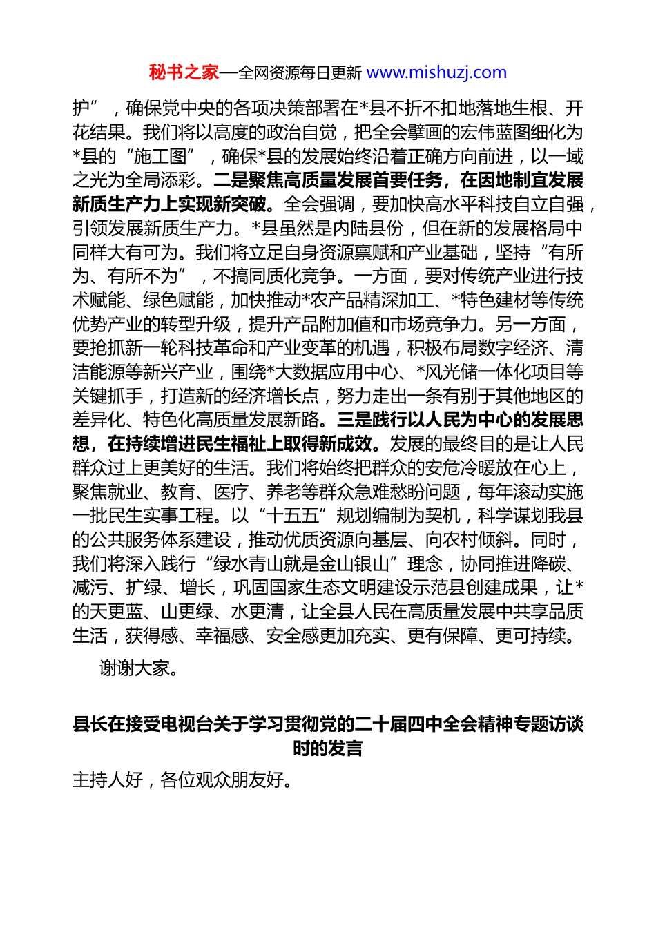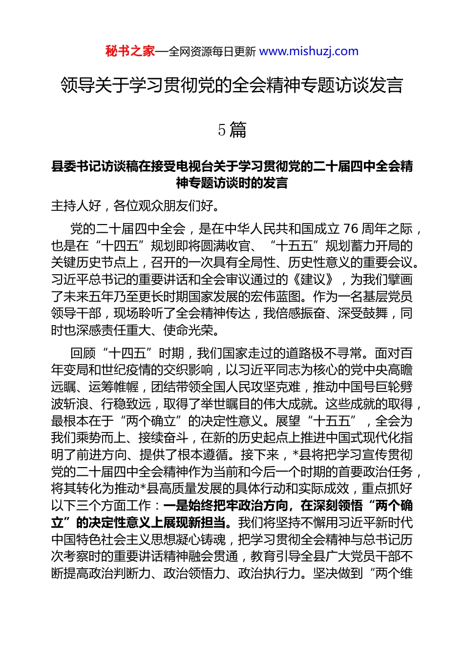 秘书之家—全网资源每日更新 www.mishuzj.com领导关于学习贯彻党的全会精神专题访谈发言5 篇县委书记访谈稿在接受电视台关于学习贯彻党的二十届四中全会精神专题访谈时的发言主持人好,各位观众朋友们好。党的二十届四中全会,是在中华人民共和国成立 76 周年之际,也是在“十四五”规划即将圆满收官、“十五五”规划蓄力开局的关键历史节点上,召开的一次具有全局性、历史性意义的重要会议。习近平总书记的重要讲话和全会审议通过的《建议》,为我们擘画了未来五年乃至更长时期国家发展的宏伟蓝图。作为一名基层党员领导干部,现场聆听了全会精神传达,我倍感振奋、深受鼓舞,同时也深感责任重大、使命光荣。回顾“十四五”时期,我们国家走过的道路极不寻常。面对百年变局和世纪疫情的交织影响,以习近平同志为核心的党中央高瞻远瞩、运筹帷幄,团结带领全国人民攻坚克难,推动中国号巨轮劈波斩浪、行稳致远,取得了举世瞩目的伟大成就。这些成就的取得,最根本在于“两个确立”的决定性意义。展望“十五五”,全会为我们乘势而上、接续奋斗,在新的历史起点上推进中国式现代化指明了前进方向、提供了根本遵循。接下来,*县将把学习宣传贯彻党的二十届四中全会精神作为当前和今后一个时期的首要政治任务,将其转化为推动*县高质量发展的具体行动和实际成效,重点抓好以下三个方面工作:一是始终把牢政治方向,在深刻领悟“两个确立”的决定性意义上展现新担当。我们将坚持不懈用习近平新时代中国特色社会主义思想凝心铸魂,把学习贯彻全会精神与总书记历次考察时的重要讲话精神融会贯通,教育引导全县广大党员干部不断提高政治判断力、政治领悟力、政治执行力。坚决做到“两个维秘书之家—全网资源每日更新 www.mishuzj.com护”,确保党中央的各项决策部署在*县不折不扣地落地生根、开花结果。我们将以高度的政治自觉,把全会擘画的宏伟蓝图细化为*县的“施工图”,确保*县的发展始终沿着正确方向前进,以一域之光为全局添彩。二是聚焦高质量发展首要任务,在因地制宜发展新质生产力上实现新突破。全会强调,要加快高水平科技自立自强,引领发展新质生产力。*县虽然是内陆县份,但在新的发展格局中同样大有可为。我们将立足自身资源禀赋和产业基础,坚持“有所为、有所不为”,不搞同质化竞争。一方面,要对传统产业进行技术赋能、绿色赋能,加快推动*农产品精深加工、*特色建材等传统优势产业的转型升级,提升产品附加值和市场竞争力。另一方面,要抢抓新一轮科技革命和产业变革的机遇,积极布局数字经济、清洁能源等新兴产业,围绕*大数据应用中心、*风光储一体化项目等关键抓手,打造新的经济增长点,努力走出一条有别于其他地区的差异化、特色化高质量发展新路。三是践行以人民为中心的发展思想,在持续增进民生福祉上取得新成效。发展的最终目的是让人民群众过上更美好的生活。我们将始终把群众的安危冷暖放在心上,聚焦就业、教育、医疗、养老等群众急难愁盼问题,每年滚动实施一批民生实事工程。以“十五五”规划编制为契机,科学谋划我县的公共服务体系建设,推动优质资源向基层、向农村倾斜。同时,我们将深入践行“绿水青山就是金山银山”理念,协同推进降碳、减污、扩绿、增长,巩固国家生态文明建设示范县创建成果,让*的天更蓝、山更绿、水更清,让全县人民在高质量发展中共享品质生活,获得感、幸福感、安全感更加充实、更有保障、更可持续。谢谢大家。县长在接受电视台关于学习贯彻党的二十届四中全会精神专题访谈时的发言主持人好,各位观众朋友好。秘书之家—全网资源每日更新 www.mishuzj.com刚刚闭幕的党的二十届四中全会,系统擘画了“十五五”时期我国经济社会发展的宏伟蓝图,是指导我们未来五年工作的纲领性文件。作为县域发展的具体组织者和推动者,我深感使命在肩,时不我待。全会精神,特别是其中关于推动高质量发展、构建新发展格局、促进区域协调发展等一系列重大部署,为我们基层政府精准施策、靶向发力提供了科学指引。“十四五”期间,*县在县委的坚强领导下,顶住了经济下行压力和各种超预期因素的冲击,经济社会发展保持了稳中有进的良好...