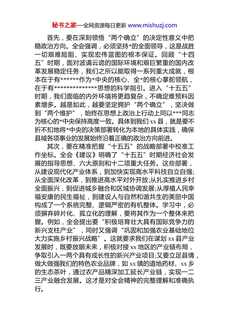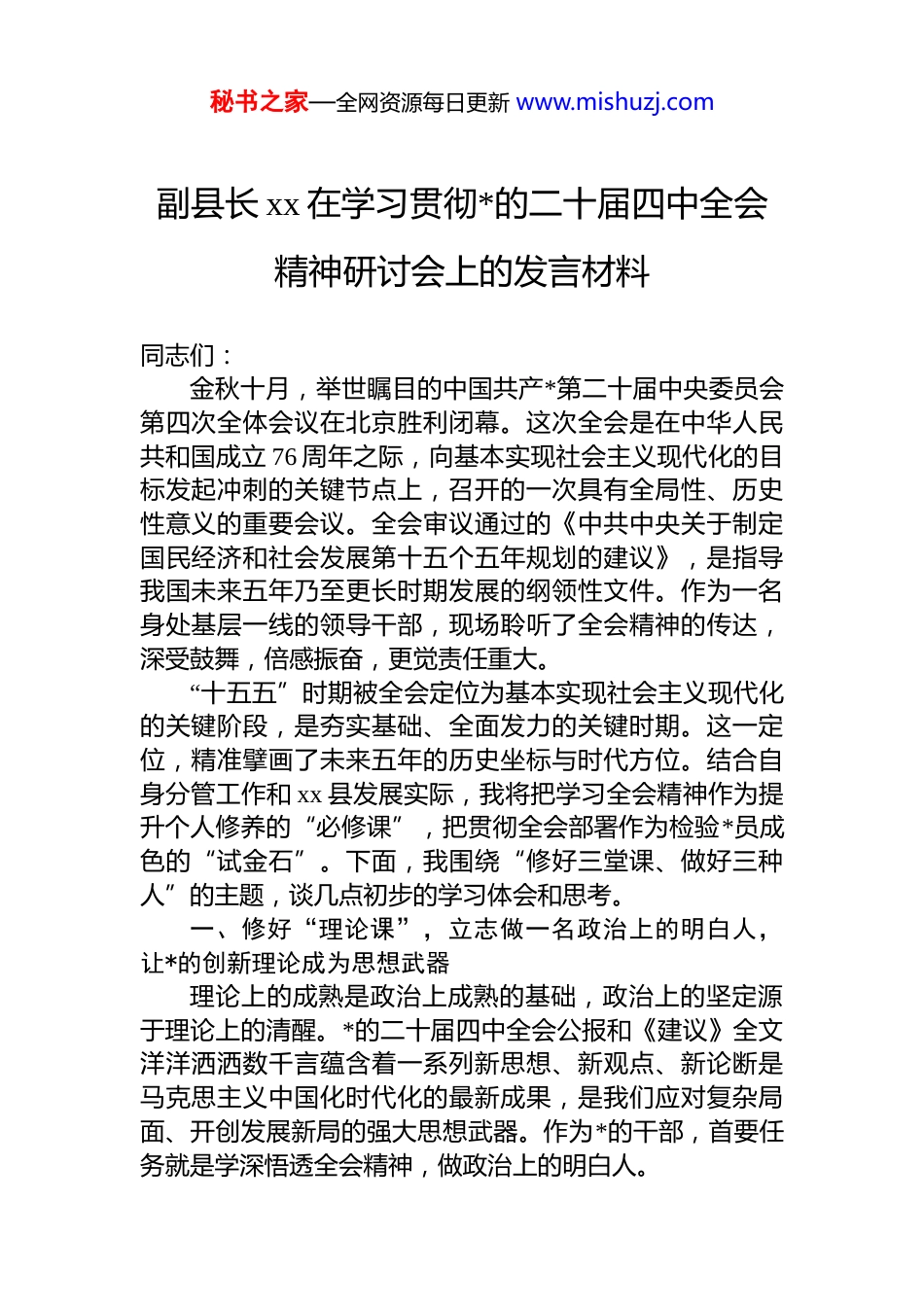 秘书之家—全网资源每日更新 www.mishuzj.com副县长 xx 在学习贯彻*的二十届四中全会精神研讨会上的发言材料同志们:金秋十月,举世瞩目的中国共产*第二十届中央委员会第四次全体会议在北京胜利闭幕。这次全会是在中华人民共和国成立 76 周年之际,向基本实现社会主义现代化的目标发起冲刺的关键节点上,召开的一次具有全局性、历史性意义的重要会议。全会审议通过的《中共中央关于制定国民经济和社会发展第十五个五年规划的建议》,是指导我国未来五年乃至更长时期发展的纲领性文件。作为一名身处基层一线的领导干部,现场聆听了全会精神的传达,深受鼓舞,倍感振奋,更觉责任重大。“十五五”时期被全会定位为基本实现社会主义现代化的关键阶段,是夯实基础、全面发力的关键时期。这一定位,精准擘画了未来五年的历史坐标与时代方位。结合自身分管工作和 xx 县发展实际,我将把学习全会精神作为提升个人修养的“必修课”,把贯彻全会部署作为检验*员成色的“试金石”。下面,我围绕“修好三堂课、做好三种人”的主题,谈几点初步的学习体会和思考。一、修好“理论课”,立志做一名政治上的明白人,让*的创新理论成为思想武器理论上的成熟是政治上成熟的基础,政治上的坚定源于理论上的清醒。*的二十届四中全会公报和《建议》全文洋洋洒洒数千言蕴含着一系列新思想、新观点、新论断是马克思主义中国化时代化的最新成果,是我们应对复杂局面、开创发展新局的强大思想武器。作为*的干部,首要任务就是学深悟透全会精神,做政治上的明白人。秘书之家—全网资源每日更新 www.mishuzj.com首先,要在深刻领悟“两个确立”的决定性意义中把稳政治方向。全会强调,必须坚持*的全面领导,这是战胜一切艰难险阻、实现宏伟蓝图的根本保证。回顾“十四五”时期,面对波谲云诡的国际环境和艰巨繁重的国内改革发展稳定任务,我们之所以能取得一系列重大成就,根本在于有******作为*中央的核心、全*的核心掌舵领航,在于有**************思想的科学指引。进入“十五五”时期,我们面临的内外环境将更趋复杂,不确定难预料因素增多。越是如此,越要坚定拥护“两个确立”,坚决做到“两个维护”,始终在思想上政治上行动上同以***同志为核心的*中央保持高度一致。具体到我们 xx 县,就是要不折不扣地将*中央的决策部署转化为本地的具体实践,确保县域各项事业的发展始终沿着正确的政治方向前进。其次,要在精准把握“十五五”的战略部署中校准工作坐标。全会《建议》明确了“十五五”时期经济社会发展的指导思想、六大原则和十二项重大任务。这些部署,从建设现代化产业体系,到加快实现高水平科技自立自强;从全面深化改革,到推进高水平对外开放;从扎实推进乡村全面振兴,到促进城乡融合和区域协调发展;从厚植人民幸福安康的民生福祉,到建设人与自然和谐共生的美丽中国构成了一个系统完整、逻辑严密的有机整体。学习中,必须摒弃碎片化、孤立化的理解,要将其作为一个整体来把握。例如,全会提出要“积极培育壮大具有国际竞争力的新兴支柱产业”,同时又强调“巩固和加强农业基础地位大力实施乡村振兴战略”。这就要求我们在谋划 xx 县产业发展时,既要放眼未来,积极对接 xx 地区的产业链布局,争取引入一两个具有成长性的新兴产业项目;又要立足县情,做大做强我们的特色农业品牌,如 xx 镇的道地药材、xx 乡的生态茶叶,通过农产品精深加工延长产业链,实现一二三产业融合发展。这才是对全会精神的完整理解和准确执行。秘书之家—全网资源每日更新 www.mishuzj.com二、修好“宗旨课”,立志做一名群众的贴心人,让人民至上的理念融入血脉江山就是人民,人民就是江山。全会公报将“坚持人民至上”作为“十五五”时期必须遵循的重要原则之一,并用大量篇幅部署了增进民生福祉、提高人民生活品质的具体任务,充分彰显了我们*以人民为中心的发展思想。作为直接服务群众的基层干部,群众的安危冷暖、急难愁盼就是我们工作的出发点和落脚点。一方面,要用脚步丈量民情,在深入基层中发现问题。群众的“表情包”就是我们工作的“晴雨表”。全会描绘的宏伟蓝图,最终要体现在千家万户...