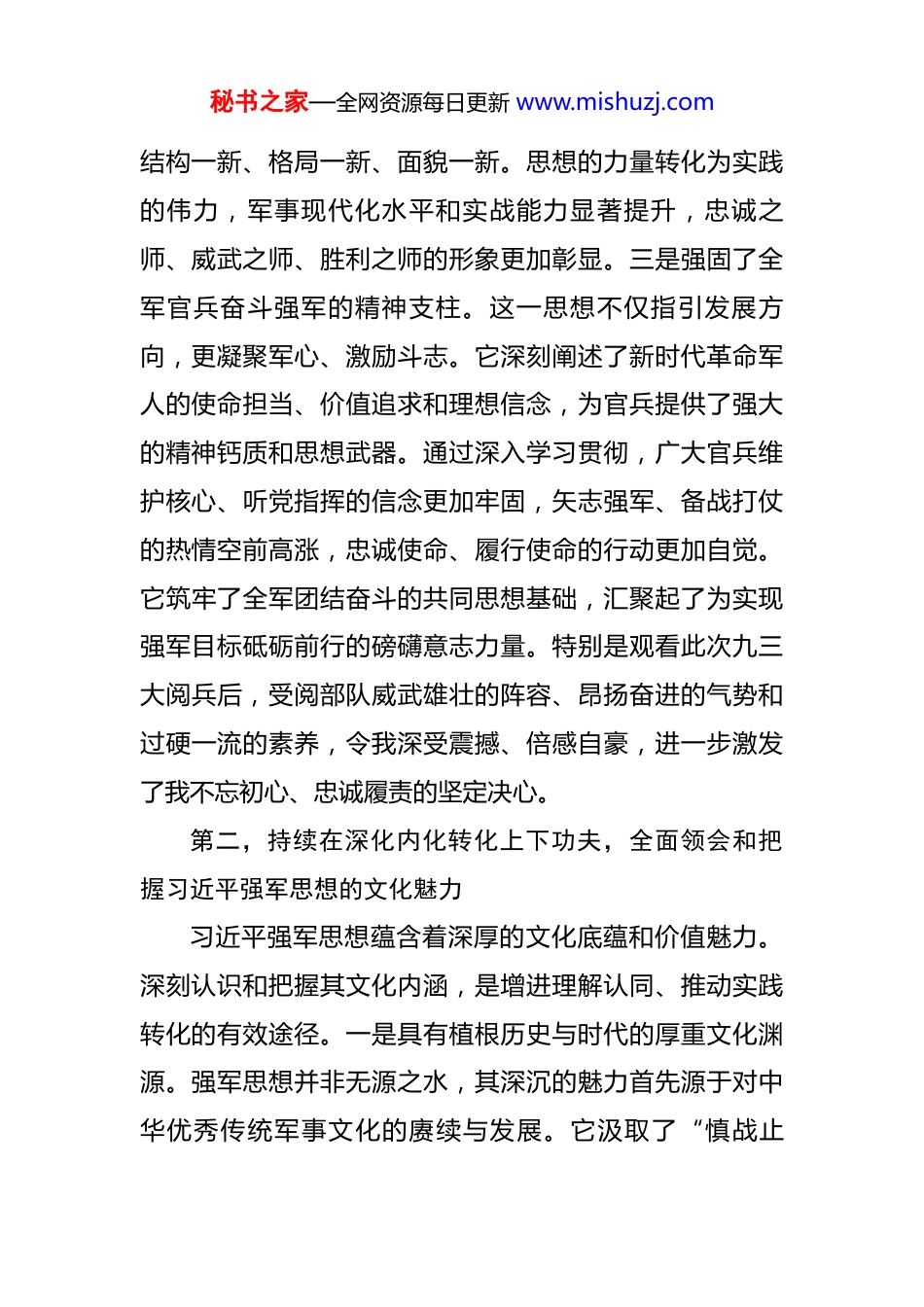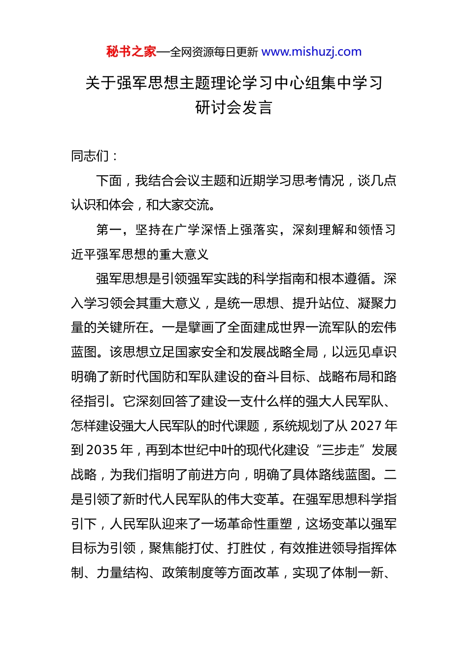 秘书之家—全网资源每日更新 www.mishuzj.com关于强军思想主题理论学习中心组集中学习研讨会发言 同志们:下面,我结合会议主题和近期学习思考情况,谈几点认识和体会,和大家交流。第一,坚持在广学深悟上强落实,深刻理解和领悟习近平强军思想的重大意义强军思想是引领强军实践的科学指南和根本遵循。深入学习领会其重大意义,是统一思想、提升站位、凝聚力量的关键所在。一是擘画了全面建成世界一流军队的宏伟蓝图。该思想立足国家安全和发展战略全局,以远见卓识明确了新时代国防和军队建设的奋斗目标、战略布局和路径指引。它深刻回答了建设一支什么样的强大人民军队、怎样建设强大人民军队的时代课题,系统规划了从 2027 年到 2035 年,再到本世纪中叶的现代化建设“三步走”发展战略,为我们指明了前进方向,明确了具体路线蓝图。二是引领了新时代人民军队的伟大变革。在强军思想科学指引下,人民军队迎来了一场革命性重塑,这场变革以强军目标为引领,聚焦能打仗、打胜仗,有效推进领导指挥体制、力量结构、政策制度等方面改革,实现了体制一新、秘书之家—全网资源每日更新 www.mishuzj.com结构一新、格局一新、面貌一新。思想的力量转化为实践的伟力,军事现代化水平和实战能力显著提升,忠诚之师、威武之师、胜利之师的形象更加彰显。三是强固了全军官兵奋斗强军的精神支柱。这一思想不仅指引发展方向,更凝聚军心、激励斗志。它深刻阐述了新时代革命军人的使命担当、价值追求和理想信念,为官兵提供了强大的精神钙质和思想武器。通过深入学习贯彻,广大官兵维护核心、听党指挥的信念更加牢固,矢志强军、备战打仗的热情空前高涨,忠诚使命、履行使命的行动更加自觉。它筑牢了全军团结奋斗的共同思想基础,汇聚起了为实现强军目标砥砺前行的磅礴意志力量。特别是观看此次九三大阅兵后,受阅部队威武雄壮的阵容、昂扬奋进的气势和过硬一流的素养,令我深受震撼、倍感自豪,进一步激发了我不忘初心、忠诚履责的坚定决心。第二,持续在深化内化转化上下功夫,全面领会和把握习近平强军思想的文化魅力习近平强军思想蕴含着深厚的文化底蕴和价值魅力。深刻认识和把握其文化内涵,是增进理解认同、推动实践转化的有效途径。一是具有植根历史与时代的厚重文化渊源。强军思想并非无源之水,其深沉的魅力首先源于对中华优秀传统军事文化的赓续与发展。它汲取了“慎战止秘书之家—全网资源每日更新 www.mishuzj.com戈”“以武止戈”等古代兵学智慧的精髓,传承了“党指挥枪”“人民战争”等红色革命文化的基因密码,并深刻融入当代以爱国主义为核心的民族精神和以改革创新为核心的时代精神。二是在传承魂脉根脉上守正创新。这一思想的文化魅力,突出体现在对中华军事文化魂脉与根脉的坚守与开拓。它始终坚持马克思主义军事理论的指导地位,牢牢守住人民军队的建军之本、强军之魂。同时,又以巨大的政治勇气和理论智慧,直面新时代带来的新挑战新机遇,对组织形态、力量体系、作战理念等进行了一系列重大理论创新和实践创造,展现出既一脉相承又与时俱进的特质。三是以独特文化力量涵养强军实践。其文化魅力绝非止于理论层面,更转化为巨大的实践指导力与精神塑造力。它所倡导的忠诚品格、担当精神、打赢导向、创新意识等,深刻融入部队建设各领域和全过程,为练兵备战、改革发展提供了丰厚的文化滋养和价值引领。这种文化力量对内凝聚了军心士气、筑牢了精神支柱,对外展现了文明之师、和平之师的良好形象,显著提升了国防事业的软实力。第三,努力在笃行实干拿举措,以实际行动推动工作落地落实一是强化思想引导。坚持将筑牢思想根基作为首要任秘书之家—全网资源每日更新 www.mishuzj.com务,依托线上线下多种形式,组织新兴领域退役军人党员持续学习党的创新理论,深刻理解国家理论方针与战略部署,引导他们正确认识自身在新经济组织、新业态中的角色定位,传承红色基因,发扬光荣传统,确保思想不迷航、行动有方向,自觉做坚定理想信念和推动行业健康发展的表率。二是加强关心关爱。主动深入新兴企业、社会组织了解退役军人实际需求,依托各单位(部门)资源,结合实...
