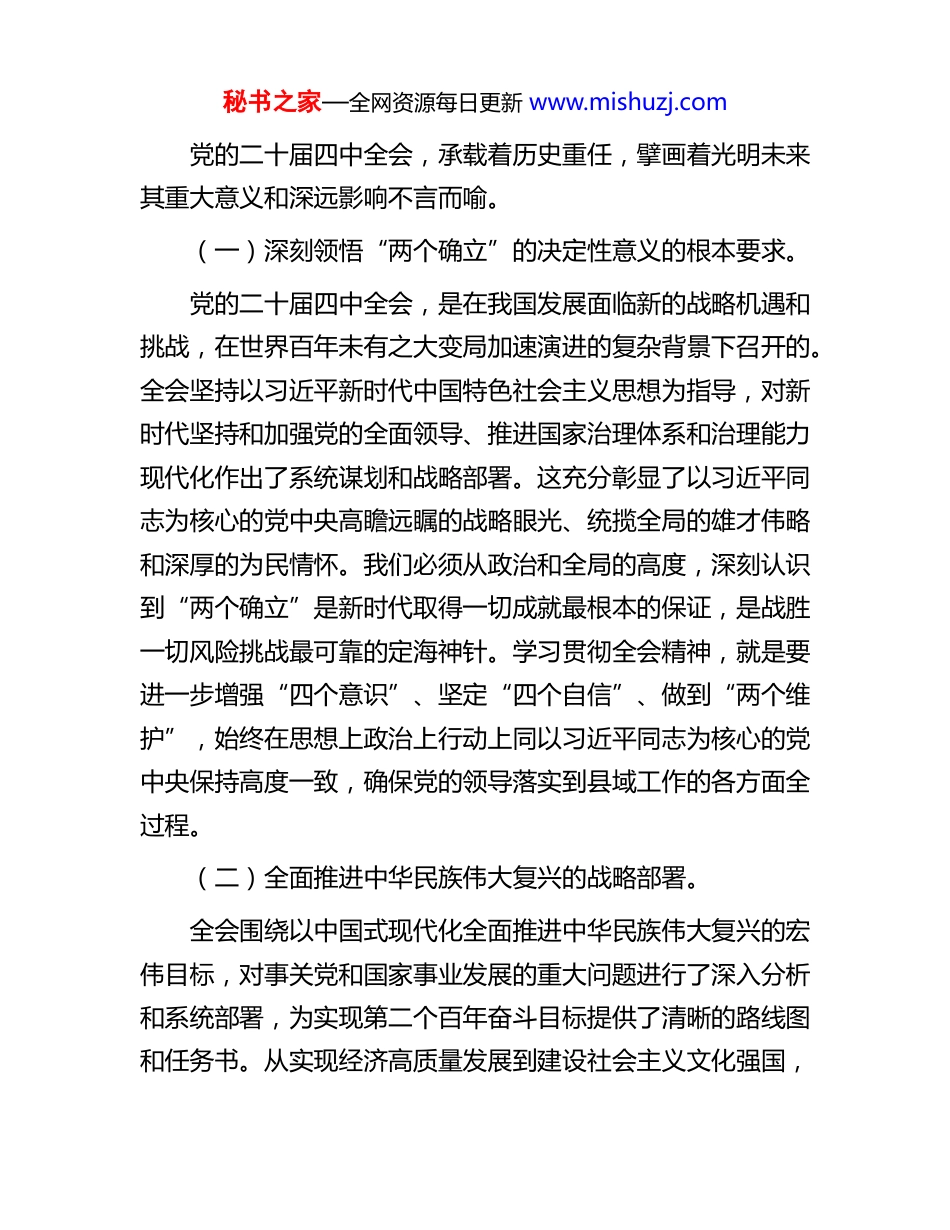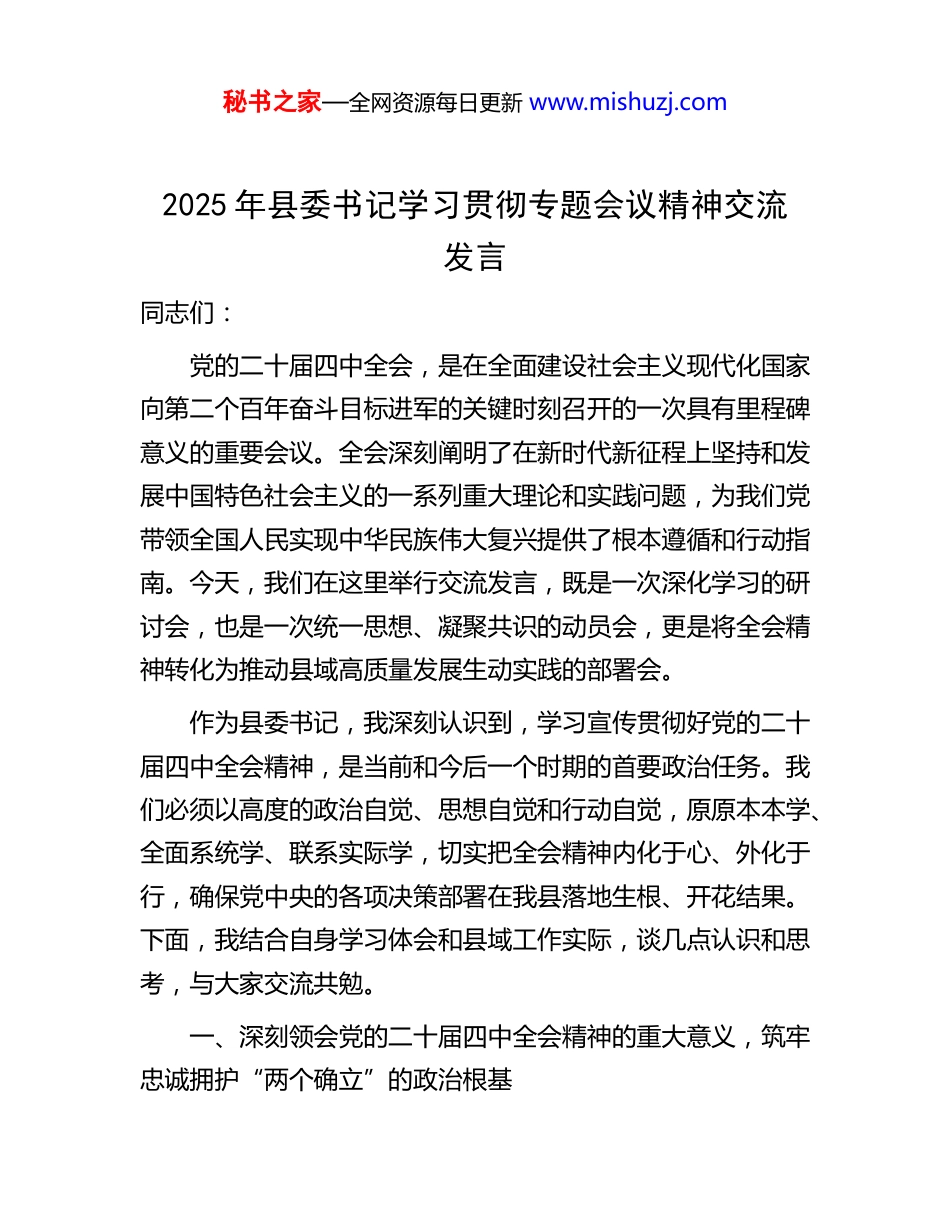 秘书之家—全网资源每日更新 www.mishuzj.com2025 年县委书记学习贯彻专题会议精神交流发言同志们:党的二十届四中全会,是在全面建设社会主义现代化国家向第二个百年奋斗目标进军的关键时刻召开的一次具有里程碑意义的重要会议。全会深刻阐明了在新时代新征程上坚持和发展中国特色社会主义的一系列重大理论和实践问题,为我们党带领全国人民实现中华民族伟大复兴提供了根本遵循和行动指南。今天,我们在这里举行交流发言,既是一次深化学习的研讨会,也是一次统一思想、凝聚共识的动员会,更是将全会精神转化为推动县域高质量发展生动实践的部署会。作为县委书记,我深刻认识到,学习宣传贯彻好党的二十届四中全会精神,是当前和今后一个时期的首要政治任务。我们必须以高度的政治自觉、思想自觉和行动自觉,原原本本学、全面系统学、联系实际学,切实把全会精神内化于心、外化于行,确保党中央的各项决策部署在我县落地生根、开花结果。下面,我结合自身学习体会和县域工作实际,谈几点认识和思考,与大家交流共勉。一、深刻领会党的二十届四中全会精神的重大意义,筑牢忠诚拥护“两个确立”的政治根基秘书之家—全网资源每日更新 www.mishuzj.com党的二十届四中全会,承载着历史重任,擘画着光明未来其重大意义和深远影响不言而喻。(一)深刻领悟“两个确立”的决定性意义的根本要求。党的二十届四中全会,是在我国发展面临新的战略机遇和挑战,在世界百年未有之大变局加速演进的复杂背景下召开的。全会坚持以习近平新时代中国特色社会主义思想为指导,对新时代坚持和加强党的全面领导、推进国家治理体系和治理能力现代化作出了系统谋划和战略部署。这充分彰显了以习近平同志为核心的党中央高瞻远瞩的战略眼光、统揽全局的雄才伟略和深厚的为民情怀。我们必须从政治和全局的高度,深刻认识到“两个确立”是新时代取得一切成就最根本的保证,是战胜一切风险挑战最可靠的定海神针。学习贯彻全会精神,就是要进一步增强“四个意识”、坚定“四个自信”、做到“两个维护”,始终在思想上政治上行动上同以习近平同志为核心的党中央保持高度一致,确保党的领导落实到县域工作的各方面全过程。(二)全面推进中华民族伟大复兴的战略部署。全会围绕以中国式现代化全面推进中华民族伟大复兴的宏伟目标,对事关党和国家事业发展的重大问题进行了深入分析和系统部署,为实现第二个百年奋斗目标提供了清晰的路线图和任务书。从实现经济高质量发展到建设社会主义文化强国,秘书之家—全网资源每日更新 www.mishuzj.com从推动全面深化改革到加强生态文明建设,从增进人民福祉到维护国家安全,全会精神覆盖了国家发展的方方面面。这要求我们必须胸怀“国之大者”,站在全国、全省、全市大局中思考和谋划县域发展,将县域的发展与国家战略紧密衔接,以一域之光为全局添彩,切实肩负起实现中华民族伟大复兴的时代重任。(三)推动县域高质量发展和现代化建设的根本遵循。当前,我县正处于转型发展的关键时期,既面临着国家战略叠加、政策红利释放的重大机遇,也面临着区域竞争激烈、自身短板突出的严峻挑战。全会精神为我们破解发展难题、增强发展动能、提升治理效能指明了方向、提供了遵循。全会强调坚持和加强党的全面领导、推进国家治理体系和治理能力现代化、推动高质量发展、坚持以人民为中心等一系列重大论断,是指导我们做好县域各项工作的根本大法。我们必须以全会精神统一思想、武装头脑,对照全会部署要求,全面审视和谋划我县发展路径,找准切入点和着力点,将国家战略转化为县域发展的具体实践,开创我县高质量发展新局面。二、准确把握党的二十届四中全会精神的核心要义和实践要求,锚定县域发展的战略方向和重点任务党的二十届四中全会内涵丰富、博大精深,我们要深刻领会其核心要义,并转化为县域发展的具体实践。秘书之家—全网资源每日更新 www.mishuzj.com(一)深刻领会坚持和加强党的全面领导的根本要求。全会强调,坚持和加强党的全面领导,是推进中国特色社会主义事业的根本保证。这深刻揭示了新时代新征程上党和国家事业发展的领导核心和根本所在。一是必须坚持党中...
