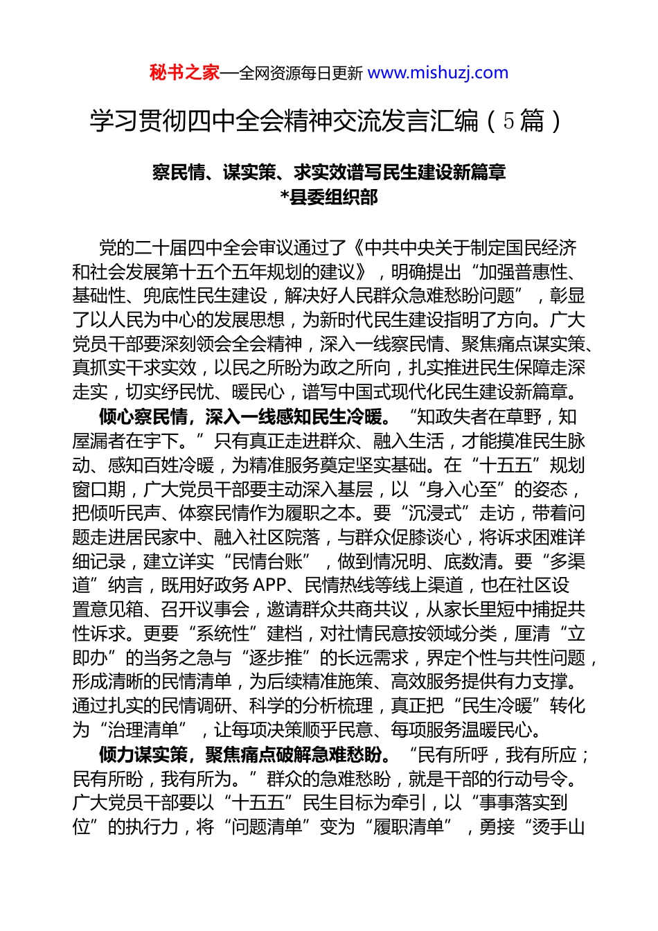 秘书之家—全网资源每日更新 www.mishuzj.com学习贯彻四中全会精神交流发言汇编(5 篇)察民情、谋实策、求实效谱写民生建设新篇章*县委组织部党的二十届四中全会审议通过了《中共中央关于制定国民经济和社会发展第十五个五年规划的建议》,明确提出“加强普惠性、基础性、兜底性民生建设,解决好人民群众急难愁盼问题”,彰显了以人民为中心的发展思想,为新时代民生建设指明了方向。广大党员干部要深刻领会全会精神,深入一线察民情、聚焦痛点谋实策、真抓实干求实效,以民之所盼为政之所向,扎实推进民生保障走深走实,切实纾民忧、暖民心,谱写中国式现代化民生建设新篇章。倾心察民情,深入一线感知民生冷暖。“知政失者在草野,知屋漏者在宇下。”只有真正走进群众、融入生活,才能摸准民生脉动、感知百姓冷暖,为精准服务奠定坚实基础。在“十五五”规划窗口期,广大党员干部要主动深入基层,以“身入心至”的姿态,把倾听民声、体察民情作为履职之本。要“沉浸式”走访,带着问题走进居民家中、融入社区院落,与群众促膝谈心,将诉求困难详细记录,建立详实“民情台账”,做到情况明、底数清。要“多渠道”纳言,既用好政务 APP、民情热线等线上渠道,也在社区设置意见箱、召开议事会,邀请群众共商共议,从家长里短中捕捉共性诉求。更要“系统性”建档,对社情民意按领域分类,厘清“立即办”的当务之急与“逐步推”的长远需求,界定个性与共性问题,形成清晰的民情清单,为后续精准施策、高效服务提供有力支撑。通过扎实的民情调研、科学的分析梳理,真正把“民生冷暖”转化为“治理清单”,让每项决策顺乎民意、每项服务温暖民心。倾力谋实策,聚焦痛点破解急难愁盼。“民有所呼,我有所应;民有所盼,我有所为。”群众的急难愁盼,就是干部的行动号令。广大党员干部要以“十五五”民生目标为牵引,以“事事落实到位”的执行力,将“问题清单”变为“履职清单”,勇接“烫手山秘书之家—全网资源每日更新 www.mishuzj.com芋”,敢啃“硬骨头”。针对群众反映的各类问题,要坚持精准把脉、靶向施治,面对管道堵塞、证件办理等即时性问题,实行“接诉即办、一次清结”,以速度传递温度;面对老旧小区改造、停车位规划等跨部门事项,推行“一事一策、专班推进”机制,打通中梗阻;面对物业服务、环境整治等共性难题,则要深挖根源、推进系统治理,实现从“解决一件事”向“办好一类事”走深走实。也要善用科技赋能治理,建设“智慧民生”平台,通过数据研判民生需求、智能匹配资源,推动服务从“人找政策”向“政策找人”转变,持续打通民生堵点,让民生服务可感可及、高效便捷,以科学精准之策回应民生关切,增强群众获得感、幸福感、安全感。倾责求实效,真抓实干筑牢幸福根基。“民生无小事,枝叶总关情。”做好民生工作,重在务实担当、贵在久久为功。广大党员干部要立足高质量发展要求,坚持实效导向,既要做让群众看得见、得实惠的显绩,也要做为后人打基础、利长远的潜绩,切实把工作着力点放在解决群众急难愁盼上,确保每件民生实事落地有声、务实有效。要推动服务资源直达基层,打通惠民“最后一公里”,依托“家门口”服务站点和“一站式”便民中心,实现政策咨询、业务办理、公共服务向社区延伸,让群众少跑腿、好办事。同时要注重民生项目的长效运营,落实“建管用”一体化机制,既确保设施建得好,更保障服务用得久。要把群众满意度作为衡量标尺,建立实事办结回访机制,通过入户走访、线上问卷、数据监测等方式,跟踪项目实效、听取真实反馈,对运行不畅的服务及时优化,对群众新需求快速响应。唯有扎实办好每件民生小事,以干部的“辛苦指数”提升人民的“幸福指数”,才能赢得群众真信任、筑牢幸福硬根基,为绘就“十五五”民生新图景注入持久动能。以实干担当答好新征程上高质量发展答卷*县委组织部中国共产党第二十届中央委员会第四次全体会议于 10 月 20 日至 23 日在北京召开,会议审议通过《中共中央关于制定国民经济秘书之家—全网资源每日更新 www.mishuzj.com和社会发展第十五个五年规划的建议》。作为基本实现社会主义现代化夯实基础...