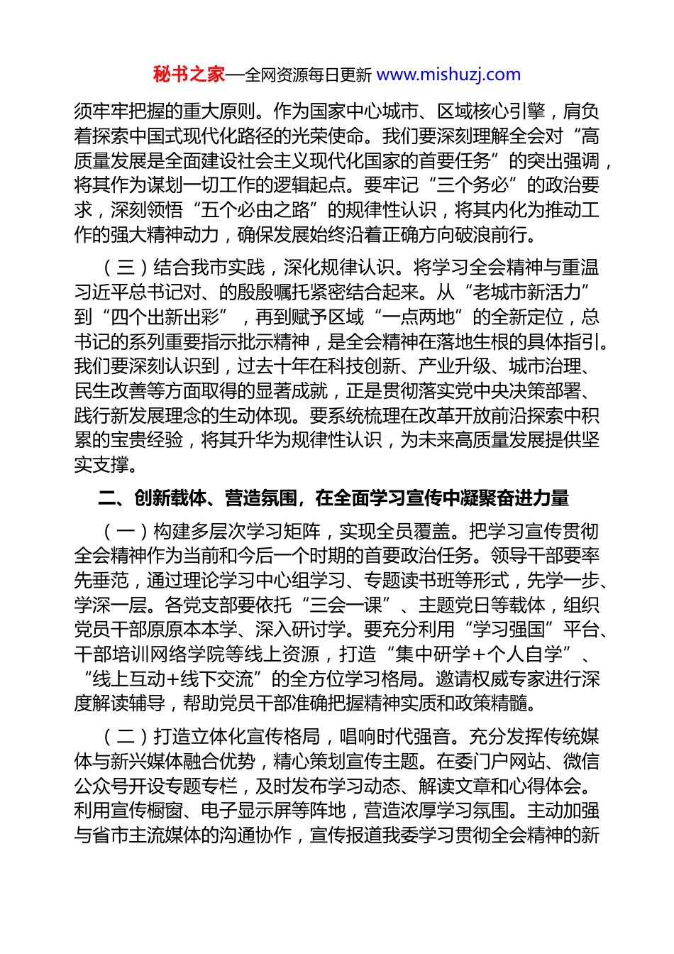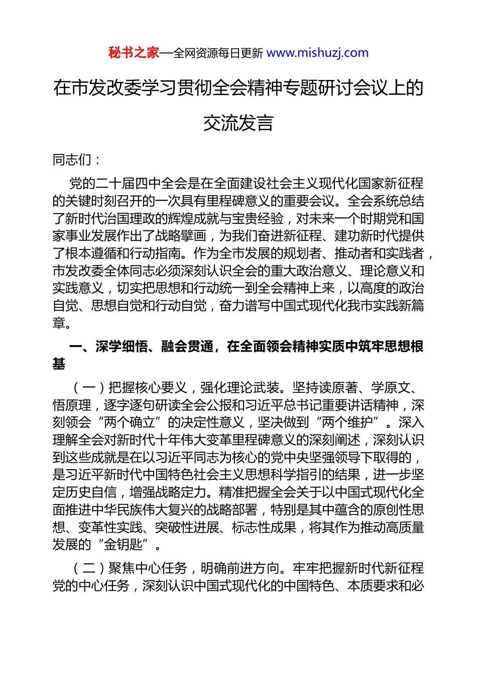 秘书之家—全网资源每日更新 www.mishuzj.com在市发改委学习贯彻全会精神专题研讨会议上的交流发言同志们:党的二十届四中全会是在全面建设社会主义现代化国家新征程的关键时刻召开的一次具有里程碑意义的重要会议。全会系统总结了新时代治国理政的辉煌成就与宝贵经验,对未来一个时期党和国家事业发展作出了战略擘画,为我们奋进新征程、建功新时代提供了根本遵循和行动指南。作为全市发展的规划者、推动者和实践者,市发改委全体同志必须深刻认识全会的重大政治意义、理论意义和实践意义,切实把思想和行动统一到全会精神上来,以高度的政治自觉、思想自觉和行动自觉,奋力谱写中国式现代化我市实践新篇章。一、深学细悟、融会贯通,在全面领会精神实质中筑牢思想根基(一)把握核心要义,强化理论武装。坚持读原著、学原文、悟原理,逐字逐句研读全会公报和习近平总书记重要讲话精神,深刻领会“两个确立”的决定性意义,坚决做到“两个维护”。深入理解全会对新时代十年伟大变革里程碑意义的深刻阐述,深刻认识到这些成就是在以习近平同志为核心的党中央坚强领导下取得的,是习近平新时代中国特色社会主义思想科学指引的结果,进一步坚定历史自信,增强战略定力。精准把握全会关于以中国式现代化全面推进中华民族伟大复兴的战略部署,特别是其中蕴含的原创性思想、变革性实践、突破性进展、标志性成果,将其作为推动高质量发展的“金钥匙”。(二)聚焦中心任务,明确前进方向。牢牢把握新时代新征程党的中心任务,深刻认识中国式现代化的中国特色、本质要求和必秘书之家—全网资源每日更新 www.mishuzj.com须牢牢把握的重大原则。作为国家中心城市、区域核心引擎,肩负着探索中国式现代化路径的光荣使命。我们要深刻理解全会对“高质量发展是全面建设社会主义现代化国家的首要任务”的突出强调,将其作为谋划一切工作的逻辑起点。要牢记“三个务必”的政治要求,深刻领悟“五个必由之路”的规律性认识,将其内化为推动工作的强大精神动力,确保发展始终沿着正确方向破浪前行。(三)结合我市实践,深化规律认识。将学习全会精神与重温习近平总书记对、的殷殷嘱托紧密结合起来。从“老城市新活力”到“四个出新出彩”,再到赋予区域“一点两地”的全新定位,总书记的系列重要指示批示精神,是全会精神在落地生根的具体指引。我们要深刻认识到,过去十年在科技创新、产业升级、城市治理、民生改善等方面取得的显著成就,正是贯彻落实党中央决策部署、践行新发展理念的生动体现。要系统梳理在改革开放前沿探索中积累的宝贵经验,将其升华为规律性认识,为未来高质量发展提供坚实支撑。二、创新载体、营造氛围,在全面学习宣传中凝聚奋进力量(一)构建多层次学习矩阵,实现全员覆盖。把学习宣传贯彻全会精神作为当前和今后一个时期的首要政治任务。领导干部要率先垂范,通过理论学习中心组学习、专题读书班等形式,先学一步、学深一层。各党支部要依托“三会一课”、主题党日等载体,组织党员干部原原本本学、深入研讨学。要充分利用“学习强国”平台、干部培训网络学院等线上资源,打造“集中研学+个人自学”、“线上互动+线下交流”的全方位学习格局。邀请权威专家进行深度解读辅导,帮助党员干部准确把握精神实质和政策精髓。(二)打造立体化宣传格局,唱响时代强音。充分发挥传统媒体与新兴媒体融合优势,精心策划宣传主题。在委门户网站、微信公众号开设专题专栏,及时发布学习动态、解读文章和心得体会。利用宣传橱窗、电子显示屏等阵地,营造浓厚学习氛围。主动加强与省市主流媒体的沟通协作,宣传报道我委学习贯彻全会精神的新秘书之家—全网资源每日更新 www.mishuzj.com思路、新举措、新成效,讲好发改人在新时代新征程上担当作为的故事。注重挖掘和宣传基层学习贯彻的典型经验和先进人物,发挥示范引领作用。(三)开展接地气宣讲活动,推动入脑入心。结合领导干部基层联系点制度,组织骨干力量成立宣讲小分队,深入对口联系的区、镇街、企业、项目一线开展对象化、分众化、互动化宣讲。宣讲内容要紧密联系实际和发改职能,将“大道理”转化为“家常话”,用改革...