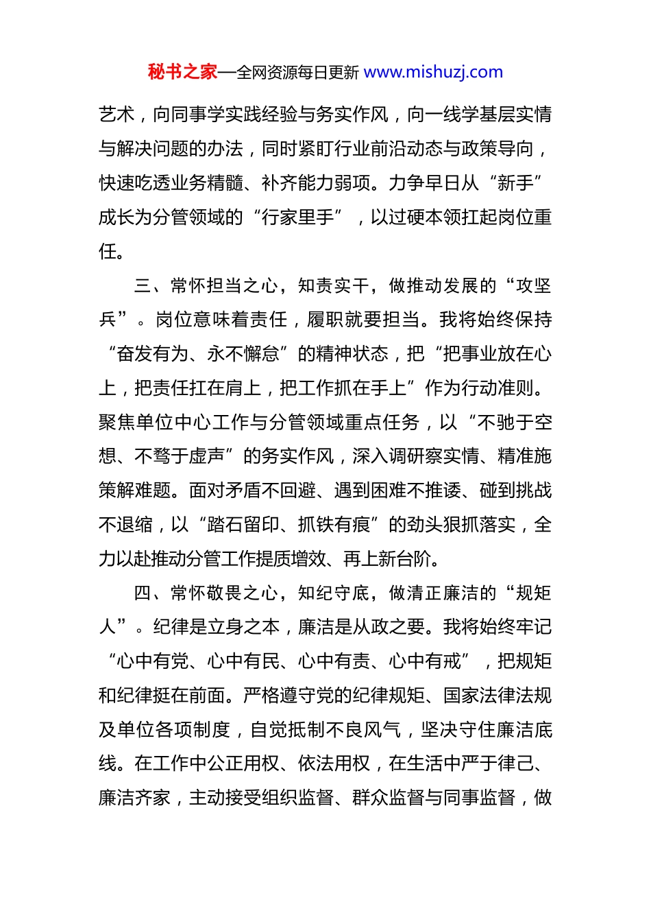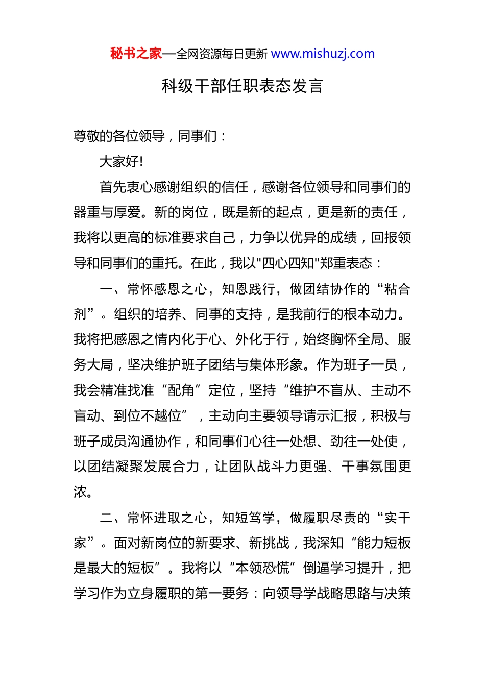 秘书之家—全网资源每日更新 www.mishuzj.com科级干部任职表态发言 尊敬的各位领导,同事们:大家好!首先衷心感谢组织的信任,感谢各位领导和同事们的器重与厚爱。新的岗位,既是新的起点,更是新的责任,我将以更高的标准要求自己,力争以优异的成绩,回报领导和同事们的重托。在此,我以"四心四知"郑重表态:一、常怀感恩之心,知恩践行,做团结协作的“粘合剂”。组织的培养、同事的支持,是我前行的根本动力。我将把感恩之情内化于心、外化于行,始终胸怀全局、服务大局,坚决维护班子团结与集体形象。作为班子一员,我会精准找准“配角”定位,坚持“维护不盲从、主动不盲动、到位不越位”,主动向主要领导请示汇报,积极与班子成员沟通协作,和同事们心往一处想、劲往一处使,以团结凝聚发展合力,让团队战斗力更强、干事氛围更浓。二、常怀进取之心,知短笃学,做履职尽责的“实干家”。面对新岗位的新要求、新挑战,我深知“能力短板是最大的短板”。我将以“本领恐慌”倒逼学习提升,把学习作为立身履职的第一要务:向领导学战略思路与决策秘书之家—全网资源每日更新 www.mishuzj.com艺术,向同事学实践经验与务实作风,向一线学基层实情与解决问题的办法,同时紧盯行业前沿动态与政策导向,快速吃透业务精髓、补齐能力弱项。力争早日从“新手”成长为分管领域的“行家里手”,以过硬本领扛起岗位重任。三、常怀担当之心,知责实干,做推动发展的“攻坚兵”。岗位意味着责任,履职就要担当。我将始终保持“奋发有为、永不懈怠”的精神状态,把“把事业放在心上,把责任扛在肩上,把工作抓在手上”作为行动准则。聚焦单位中心工作与分管领域重点任务,以“不驰于空想、不骛于虚声”的务实作风,深入调研察实情、精准施策解难题。面对矛盾不回避、遇到困难不推诿、碰到挑战不退缩,以“踏石留印、抓铁有痕”的劲头狠抓落实,全力以赴推动分管工作提质增效、再上新台阶。四、常怀敬畏之心,知纪守底,做清正廉洁的“规矩人”。纪律是立身之本,廉洁是从政之要。我将始终牢记“心中有党、心中有民、心中有责、心中有戒”,把规矩和纪律挺在前面。严格遵守党的纪律规矩、国家法律法规及单位各项制度,自觉抵制不良风气,坚决守住廉洁底线。在工作中公正用权、依法用权,在生活中严于律己、廉洁齐家,主动接受组织监督、群众监督与同事监督,做秘书之家—全网资源每日更新 www.mishuzj.com到心有所畏、言有所戒、行有所止,始终保持清白做人、干净做事的政治本色。最后,请各位放心,我一定会脚踏实地的做好工作,决不辜负领导的信任和厚爱。我也坚信:在上级正确领导下,在同事们齐心协力下,明天一定会更加美好。请大家支持我、监督我。谢谢大家!