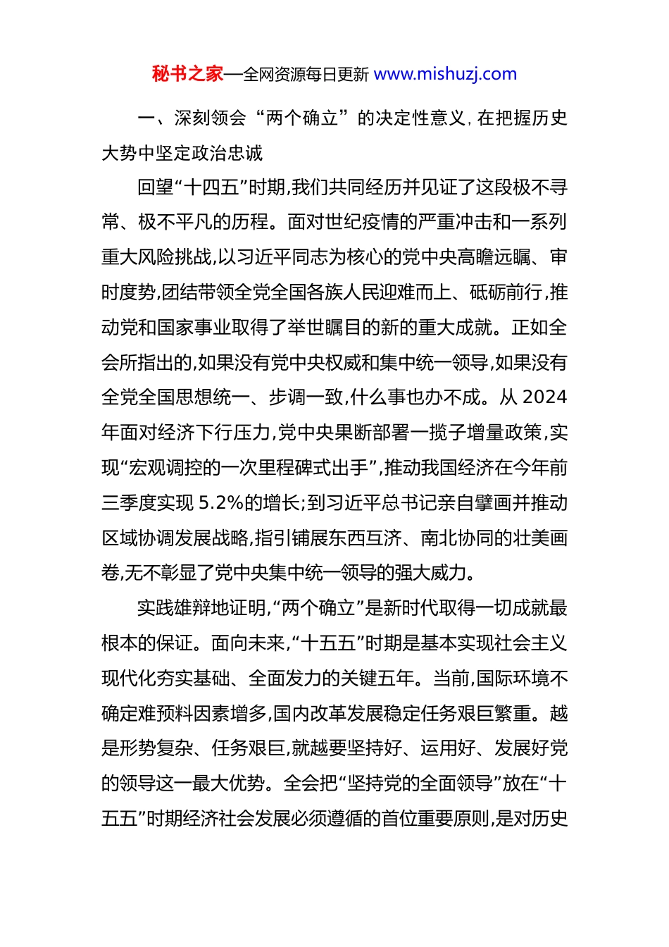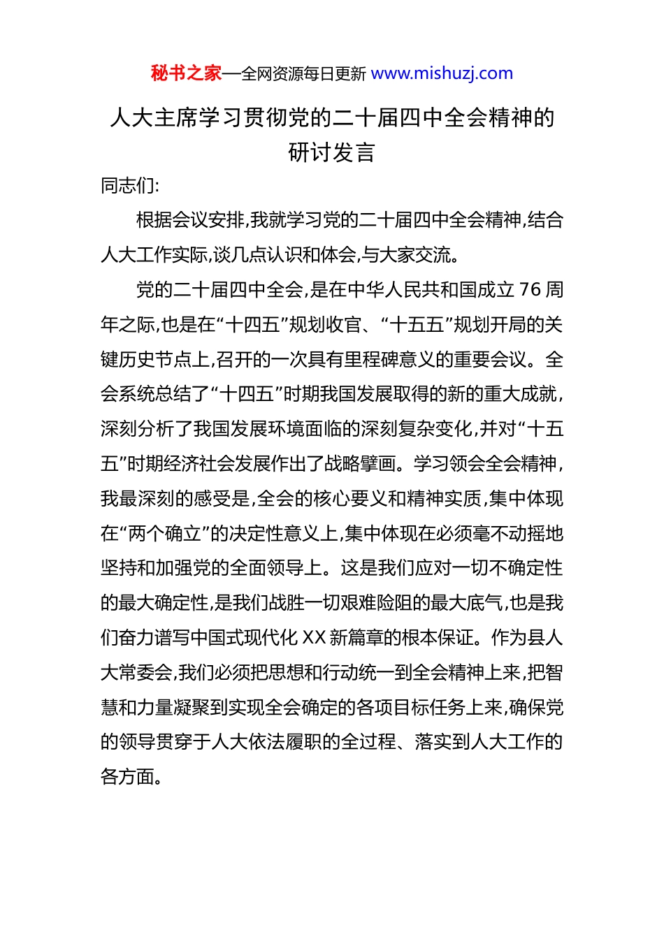 秘书之家—全网资源每日更新 www.mishuzj.com人大主席学习贯彻党的二十届四中全会精神的研讨发言 同志们:根据会议安排,我就学习党的二十届四中全会精神,结合人大工作实际,谈几点认识和体会,与大家交流。党的二十届四中全会,是在中华人民共和国成立 76 周年之际,“”“”也是在 十四五 规划收官、 十五五 规划开局的关键历史节点上,召开的一次具有里程碑意义的重要会议。全“”会系统总结了 十四五 时期我国发展取得的新的重大成就,深刻分析了我国发展环境面临的深刻复杂变化,“并对 十五”五 时期经济社会发展作出了战略擘画。学习领会全会精神,我最深刻的感受是,全会的核心要义和精神实质,集中体现“”在 两个确立 的决定性意义上,集中体现在必须毫不动摇地坚持和加强党的全面领导上。这是我们应对一切不确定性的最大确定性,是我们战胜一切艰难险阻的最大底气,也是我们奋力谱写中国式现代化 XX 新篇章的根本保证。作为县人大常委会,我们必须把思想和行动统一到全会精神上来,把智慧和力量凝聚到实现全会确定的各项目标任务上来,确保党的领导贯穿于人大依法履职的全过程、落实到人大工作的各方面。秘书之家—全网资源每日更新 www.mishuzj.com一、深刻领会“两个确立”的决定性意义,在把握历史大势中坚定政治忠诚“”回望 十四五 时期,我们共同经历并见证了这段极不寻常、极不平凡的历程。面对世纪疫情的严重冲击和一系列重大风险挑战,以习近平同志为核心的党中央高瞻远瞩、审时度势,团结带领全党全国各族人民迎难而上、砥砺前行,推动党和国家事业取得了举世瞩目的新的重大成就。正如全会所指出的,如果没有党中央权威和集中统一领导,如果没有全党全国思想统一、步调一致,什么事也办不成。从 2024年面对经济下行压力,党中央果断部署一揽子增量政策,实“”现 宏观调控的一次里程碑式出手 ,推动我国经济在今年前三季度实现 5.2%的增长;到习近平总书记亲自擘画并推动区域协调发展战略,指引铺展东西互济、南北协同的壮美画卷,无不彰显了党中央集中统一领导的强大威力。实践雄辩地证明,“”两个确立 是新时代取得一切成就最根本的保证。面向未来,“”十五五 时期是基本实现社会主义现代化夯实基础、全面发力的关键五年。当前,国际环境不确定难预料因素增多,国内改革发展稳定任务艰巨繁重。越是形势复杂、任务艰巨,就越要坚持好、运用好、发展好党“”“的领导这一最大优势。全会把 坚持党的全面领导 放在 十”五五 时期经济社会发展必须遵循的首位重要原则,是对历史秘书之家—全网资源每日更新 www.mishuzj.com经验的深刻总结,是对发展规律的深刻把握。作为地方国家权力机关,县人大常委会必须把旗帜鲜明讲政治作为第一位的要求,“”深刻领悟 两个确立 的决定性意义,“不断增强 四个”“”“”意识 、坚定 四个自信 、做到 两个维护 ,始终在思想上政治上行动上同以习近平同志为核心的党中央保持高度一致。我们要坚持把县委的决策部署作为人大工作的出发点和落脚点,自觉将人大工作置于县委的全面领导之下,确保人大工作始终沿着正确的政治方向前进,使县委的主张通过法定程序成为全县人民的共同意志和自觉行动。二、聚焦高质量发展首要任务,在服务中心大局中彰显人大作为“”党的二十届四中全会为 十五五 时期的发展描绘了宏伟蓝图,强调要坚持高质量发展,并对构建新发展格局、推动区域协调发展、深化改革开放等作出了全面部署。发展是解决一切问题的基础和关键。近年来,在县委的坚强领导下,我们顶住压力、克难奋进,全县经济社会发展保持了稳中有进的良好态势。2024 年,全县地区生产总值历史性突破500 亿元大关,三次产业结构持续优化。进入 2025 年,全县经济延续回升向好态势,前三季度,一般公共预算收入同比增长 8.5%,固定资产投资同比增长 9.2%,常住人口城镇化率达到 61.2%,一系列主要宏观指标印证了 XX 发展的韧性和秘书之家—全网资源每日更新 www.mishuzj.com活力。这些成绩的取得,正是我们坚持党的全面领导,一张蓝图绘到底,一任接着一任干的结果。人大工作只有紧扣中心、服务大局,才能找准定位、有所作为。我们将紧紧围绕全会精神和县...