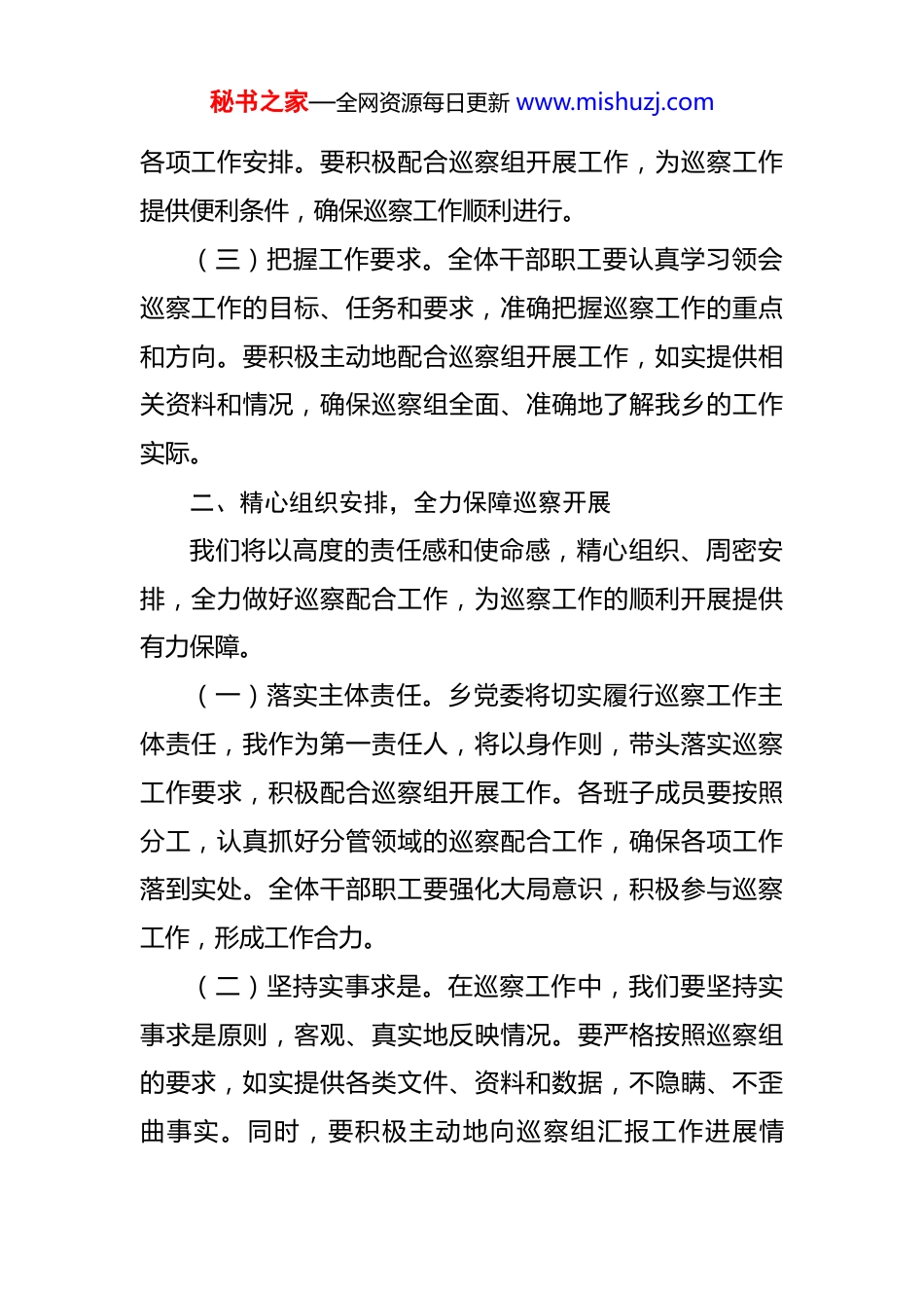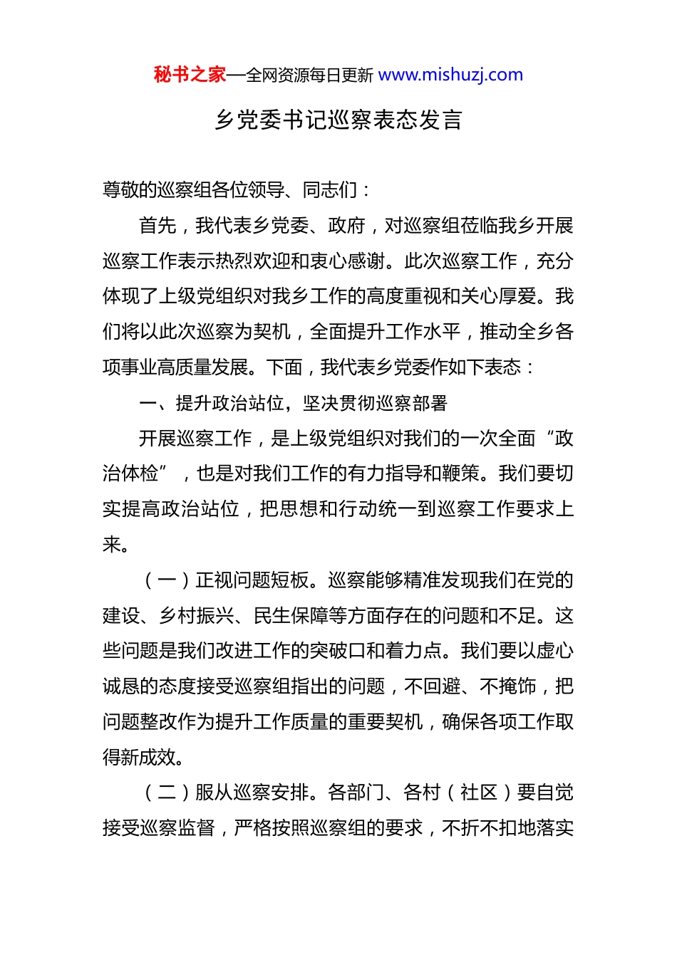 秘书之家—全网资源每日更新 www.mishuzj.com乡党委书记巡察表态发言 尊敬的巡察组各位领导、同志们:首先,我代表乡党委、政府,对巡察组莅临我乡开展巡察工作表示热烈欢迎和衷心感谢。此次巡察工作,充分体现了上级党组织对我乡工作的高度重视和关心厚爱。我们将以此次巡察为契机,全面提升工作水平,推动全乡各项事业高质量发展。下面,我代表乡党委作如下表态:一、提升政治站位,坚决贯彻巡察部署开展巡察工作,是上级党组织对我们的一次全面“政治体检”,也是对我们工作的有力指导和鞭策。我们要切实提高政治站位,把思想和行动统一到巡察工作要求上来。(一)正视问题短板。巡察能够精准发现我们在党的建设、乡村振兴、民生保障等方面存在的问题和不足。这些问题是我们改进工作的突破口和着力点。我们要以虚心诚恳的态度接受巡察组指出的问题,不回避、不掩饰,把问题整改作为提升工作质量的重要契机,确保各项工作取得新成效。(二)服从巡察安排。各部门、各村(社区)要自觉接受巡察监督,严格按照巡察组的要求,不折不扣地落实秘书之家—全网资源每日更新 www.mishuzj.com各项工作安排。要积极配合巡察组开展工作,为巡察工作提供便利条件,确保巡察工作顺利进行。(三)把握工作要求。全体干部职工要认真学习领会巡察工作的目标、任务和要求,准确把握巡察工作的重点和方向。要积极主动地配合巡察组开展工作,如实提供相关资料和情况,确保巡察组全面、准确地了解我乡的工作实际。二、精心组织安排,全力保障巡察开展我们将以高度的责任感和使命感,精心组织、周密安排,全力做好巡察配合工作,为巡察工作的顺利开展提供有力保障。(一)落实主体责任。乡党委将切实履行巡察工作主体责任,我作为第一责任人,将以身作则,带头落实巡察工作要求,积极配合巡察组开展工作。各班子成员要按照分工,认真抓好分管领域的巡察配合工作,确保各项工作落到实处。全体干部职工要强化大局意识,积极参与巡察工作,形成工作合力。(二)坚持实事求是。在巡察工作中,我们要坚持实事求是原则,客观、真实地反映情况。要严格按照巡察组的要求,如实提供各类文件、资料和数据,不隐瞒、不歪曲事实。同时,要积极主动地向巡察组汇报工作进展情秘书之家—全网资源每日更新 www.mishuzj.com况,及时反馈存在的问题和困难。(三)做好服务保障。我们将加强与巡察组的沟通联系,及时了解巡察工作的需求和动态。要全力做好后勤保障工作,为巡察组提供良好的工作和生活条件。同时,要积极协调解决巡察工作中遇到的问题和困难,确保巡察工作顺利进行。三、严守纪律规矩,自觉接受巡察监督全体干部职工要严格遵守政治纪律和政治规矩,自觉接受巡察组的监督检查。(一)遵守巡察纪律。要坚定不移地贯彻巡察组提出的工作要求,不折不扣地落实巡察组交办的各项任务。要严格遵守巡察工作纪律,不得干扰、阻碍巡察工作的正常开展,不得隐瞒、歪曲事实,不得对反映问题的人员进行打击报复。(二)接受巡察约束。要以正确的态度对待巡察工作,把巡察作为一次自我净化、自我完善、自我提高的机会。要主动接受巡察组的监督和检查,如实汇报个人工作和思想情况,虚心听取巡察组的意见和建议。(三)如实反馈情况。要本着对组织负责、对群众负责的态度,如实反映问题。无论是对领导班子的工作,还是对个人的问题,都要客观、公正地进行评价。对巡察组秘书之家—全网资源每日更新 www.mishuzj.com发现的问题,要虚心接受,主动整改。四、坚持立行立改,确保巡察取得实效我们将以此次巡察为契机,坚持问题导向,强化责任担当,认真抓好问题整改落实,确保巡察工作取得实效。(一)制定整改方案。对巡察组反馈的问题,我们将全盘接受,认真分析问题产生的原因,制定切实可行的整改方案。整改方案要明确整改目标、整改措施、整改责任人和整改时限,确保问题整改有章可循。(二)实行台账管理。建立问题整改台账,对反馈的问题进行逐一登记,实行销号管理。要按照整改方案的要求,逐项进行整改,对能够立即整改的问题,要立行立改;对需要一定时间整改的问题,要明确整改步骤和时间节点,确保问题整改按时...