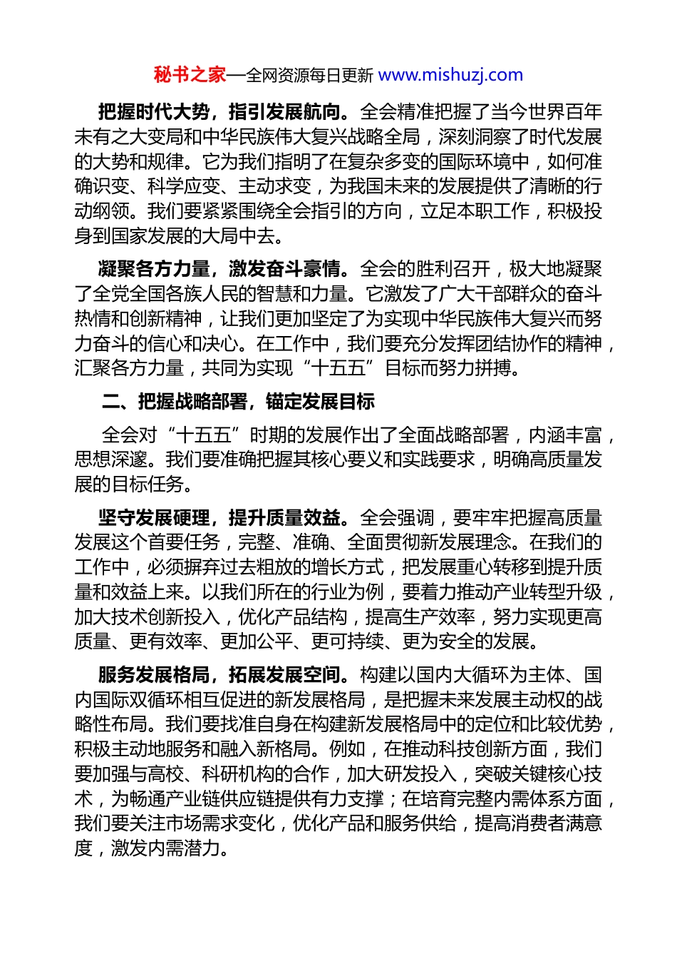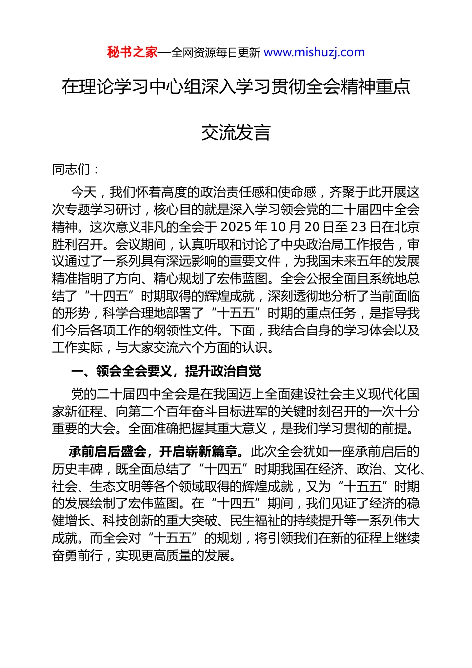 秘书之家—全网资源每日更新 www.mishuzj.com在理论学习中心组深入学习贯彻全会精神重点交流发言同志们:今天,我们怀着高度的政治责任感和使命感,齐聚于此开展这次专题学习研讨,核心目的就是深入学习领会党的二十届四中全会精神。这次意义非凡的全会于 2025 年 10 月 20 日至 23 日在北京胜利召开。会议期间,认真听取和讨论了中央政治局工作报告,审议通过了一系列具有深远影响的重要文件,为我国未来五年的发展精准指明了方向、精心规划了宏伟蓝图。全会公报全面且系统地总结了“十四五”时期取得的辉煌成就,深刻透彻地分析了当前面临的形势,科学合理地部署了“十五五”时期的重点任务,是指导我们今后各项工作的纲领性文件。下面,我结合自身的学习体会以及工作实际,与大家交流六个方面的认识。一、领会全会要义,提升政治自觉党的二十届四中全会是在我国迈上全面建设社会主义现代化国家新征程、向第二个百年奋斗目标进军的关键时刻召开的一次十分重要的大会。全面准确把握其重大意义,是我们学习贯彻的前提。承前启后盛会,开启崭新篇章。此次全会犹如一座承前启后的历史丰碑,既全面总结了“十四五”时期我国在经济、政治、文化、社会、生态文明等各个领域取得的辉煌成就,又为“十五五”时期的发展绘制了宏伟蓝图。在“十四五”期间,我们见证了经济的稳健增长、科技创新的重大突破、民生福祉的持续提升等一系列伟大成就。而全会对“十五五”的规划,将引领我们在新的征程上继续奋勇前行,实现更高质量的发展。秘书之家—全网资源每日更新 www.mishuzj.com把握时代大势,指引发展航向。全会精准把握了当今世界百年未有之大变局和中华民族伟大复兴战略全局,深刻洞察了时代发展的大势和规律。它为我们指明了在复杂多变的国际环境中,如何准确识变、科学应变、主动求变,为我国未来的发展提供了清晰的行动纲领。我们要紧紧围绕全会指引的方向,立足本职工作,积极投身到国家发展的大局中去。凝聚各方力量,激发奋斗豪情。全会的胜利召开,极大地凝聚了全党全国各族人民的智慧和力量。它激发了广大干部群众的奋斗热情和创新精神,让我们更加坚定了为实现中华民族伟大复兴而努力奋斗的信心和决心。在工作中,我们要充分发挥团结协作的精神,汇聚各方力量,共同为实现“十五五”目标而努力拼搏。二、把握战略部署,锚定发展目标全会对“十五五”时期的发展作出了全面战略部署,内涵丰富,思想深邃。我们要准确把握其核心要义和实践要求,明确高质量发展的目标任务。坚守发展硬理,提升质量效益。全会强调,要牢牢把握高质量发展这个首要任务,完整、准确、全面贯彻新发展理念。在我们的工作中,必须摒弃过去粗放的增长方式,把发展重心转移到提升质量和效益上来。以我们所在的行业为例,要着力推动产业转型升级,加大技术创新投入,优化产品结构,提高生产效率,努力实现更高质量、更有效率、更加公平、更可持续、更为安全的发展。服务发展格局,拓展发展空间。构建以国内大循环为主体、国内国际双循环相互促进的新发展格局,是把握未来发展主动权的战略性布局。我们要找准自身在构建新发展格局中的定位和比较优势,积极主动地服务和融入新格局。例如,在推动科技创新方面,我们要加强与高校、科研机构的合作,加大研发投入,突破关键核心技术,为畅通产业链供应链提供有力支撑;在培育完整内需体系方面,我们要关注市场需求变化,优化产品和服务供给,提高消费者满意度,激发内需潜力。秘书之家—全网资源每日更新 www.mishuzj.com聚焦中心任务,确保行稳致远。全会明确了中国式现代化这一中心任务。我们的所有工作,都要围绕和服务于这个中心任务来展开。在实际工作中,我们要深刻理解中国式现代化的内涵和要求,结合本单位实际,制定切实可行的工作计划和措施,确保现代化建设方向不偏、行稳致远。三、理解内涵特征,坚定道路自信深刻理解中国式现代化的内涵特征,有助于我们坚定中国特色社会主义道路自信。坚持党的领导,把稳前进航向。坚持中国共产党的领导是中国式现代化的本质特征和最大优势。在工作中,我们要坚决维护党中央权威和集中统一领导,自觉在...