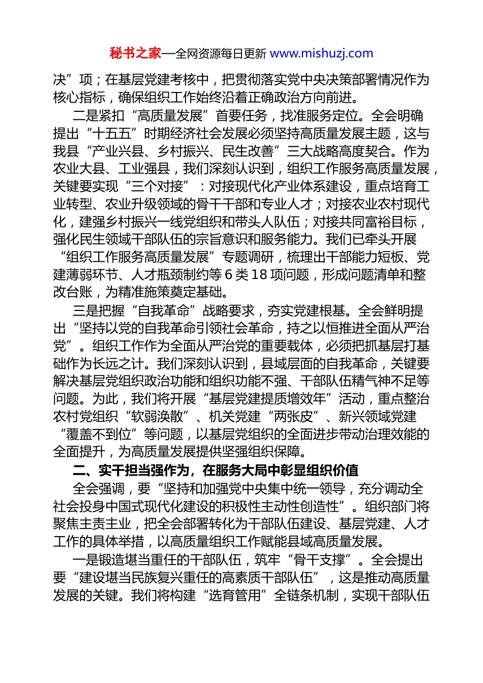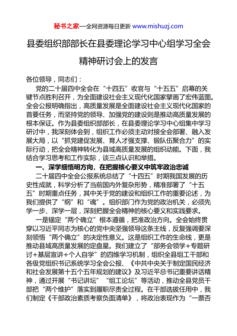秘书之家—全网资源每日更新 www.mishuzj.com县委组织部部长在县委理论学习中心组学习全会精神研讨会上的发言各位领导,同志们:党的二十届四中全会在“十四五”收官与“十五五”启幕的关键节点胜利召开,为全面建设社会主义现代化国家擘画了宏伟蓝图。全会公报明确指出,高质量发展是全面建设社会主义现代化国家的首要任务,而坚持党的领导、加强党的建设则是推动高质量发展的根本保证。作为县委组织部部长,在县委理论学习中心组集中学习研讨中,我深刻体会到,组织工作必须主动对接全会部署、融入发展大局,以“抓党建促发展、育人才强支撑、锻队伍聚合力”的实际行动,把全会精神转化为县域高质量发展的组织动能。下面,我结合学习思考和工作实际,谈三点认识和举措。一、深学细悟明方向,在把握核心要义中筑牢政治忠诚二十届四中全会公报系统总结了“十四五”时期我国发展的历史性成就,科学分析了当前国内外复杂形势,精准部署了“十五五”时期重点任务,其中关于党的建设和组织工作的重要论述,为我们提供了“纲”和“魂”。组织部门作为党的政治机关,必须先学一步、深学一层,深刻把握全会精神的核心要义和实践要求。一是锚定“两个确立”根本遵循,把准政治方向。全会始终贯穿以习近平同志为核心的党中央坚强领导这条主线,反复强调要深刻领悟“两个确立”的决定性意义。这是组织工作的生命线,更是推动县域高质量发展的定盘星。我们建立了“部务会领学+专题研讨+基层宣讲+个人自学”的四维学习机制,组织全县组工干部和各级党组织书记系统学习全会公报、《中共中央关于制定国民经济和社会发展第十五个五年规划的建议》及习近平总书记重要讲话精神,通过开展“书记讲坛”“组工论坛”等活动,推动全县党员干部把“两个维护”落实到履职尽责全过程。在干部选拔任用中,我们制定《干部政治素质考察负面清单》,将政治表现作为“一票否秘书之家—全网资源每日更新 www.mishuzj.com决”项;在基层党建考核中,把贯彻落实党中央决策部署情况作为核心指标,确保组织工作始终沿着正确政治方向前进。二是紧扣“高质量发展”首要任务,找准服务定位。全会明确提出“十五五”时期经济社会发展必须坚持高质量发展主题,这与我县“产业兴县、乡村振兴、民生改善”三大战略高度契合。作为农业大县、工业强县,我们深刻认识到,组织工作服务高质量发展,关键要实现“三个对接”:对接现代化产业体系建设,重点培育工业转型、农业升级领域的骨干干部和专业人才;对接农业农村现代化,建强乡村振兴一线党组织和带头人队伍;对接共同富裕目标,强化民生领域干部队伍的宗旨意识和服务能力。我们已牵头开展“组织工作服务高质量发展”专题调研,梳理出干部能力短板、党建薄弱环节、人才瓶颈制约等 6 类 18 项问题,形成问题清单和整改台账,为精准施策奠定基础。三是把握“自我革命”战略要求,夯实党建根基。全会鲜明提出“坚持以党的自我革命引领社会革命,持之以恒推进全面从严治党”。组织工作作为全面从严治党的重要载体,必须把抓基层打基础作为长远之计。我们深刻认识到,县域层面的自我革命,关键要解决基层党组织政治功能和组织功能不强、干部队伍精气神不足等问题。为此,我们将开展“基层党建提质增效年”活动,重点整治农村党组织“软弱涣散”、机关党建“两张皮”、新兴领域党建“覆盖不到位”等问题,以基层党组织的全面进步带动治理效能的全面提升,为高质量发展提供坚强组织保障。二、实干担当强作为,在服务大局中彰显组织价值全会强调,要“坚持和加强党中央集中统一领导,充分调动全社会投身中国式现代化建设的积极性主动性创造性”。组织部门将聚焦主责主业,把全会部署转化为干部队伍建设、基层党建、人才工作的具体举措,以高质量组织工作赋能县域高质量发展。一是锻造堪当重任的干部队伍,筑牢“骨干支撑”。全会提出要“建设堪当民族复兴重任的高素质干部队伍”,这是推动高质量发展的关键。我们将构建“选育管用”全链条机制,实现干部队伍秘书之家—全网资源每日更新 www.mishuzj.com与发展需求精准匹配。在“选”上,突出政治标准和实绩导向,围绕现代化...
