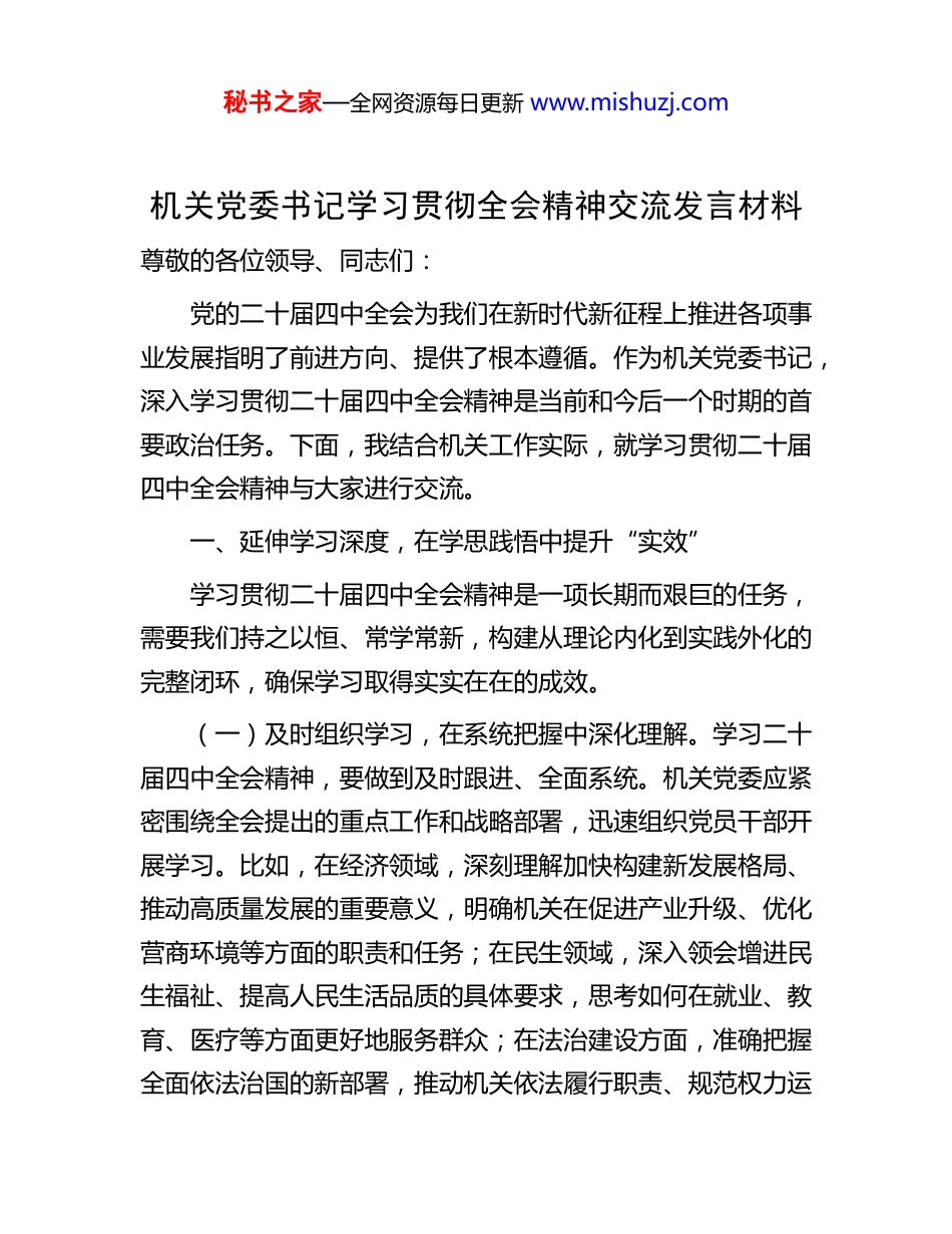 秘书之家—全网资源每日更新 www.mishuzj.com机关党委书记学习贯彻全会精神交流发言材料尊敬的各位领导、同志们:党的二十届四中全会为我们在新时代新征程上推进各项事业发展指明了前进方向、提供了根本遵循。作为机关党委书记,深入学习贯彻二十届四中全会精神是当前和今后一个时期的首要政治任务。下面,我结合机关工作实际,就学习贯彻二十届四中全会精神与大家进行交流。一、延伸学习深度,在学思践悟中提升“实效”学习贯彻二十届四中全会精神是一项长期而艰巨的任务,需要我们持之以恒、常学常新,构建从理论内化到实践外化的完整闭环,确保学习取得实实在在的成效。(一)及时组织学习,在系统把握中深化理解。学习二十届四中全会精神,要做到及时跟进、全面系统。机关党委应紧密围绕全会提出的重点工作和战略部署,迅速组织党员干部开展学习。比如,在经济领域,深刻理解加快构建新发展格局、推动高质量发展的重要意义,明确机关在促进产业升级、优化营商环境等方面的职责和任务;在民生领域,深入领会增进民生福祉、提高人民生活品质的具体要求,思考如何在就业、教育、医疗等方面更好地服务群众;在法治建设方面,准确把握全面依法治国的新部署,推动机关依法履行职责、规范权力运秘书之家—全网资源每日更新 www.mishuzj.com行。通过全面学习,引导党员干部深刻领会全会精神的丰富内涵和核心要义,切实把思想和行动统一到全会精神上来。(二)创新学习方式,在多元学习中提升实效。为了提高学习的针对性和实效性,机关党委要不断创新学习方式方法。一方面,抓好集中学习、专题研讨、专家讲座等传统学习形式,邀请党校教授、专家学者为党员干部作深入解读,组织党员干部开展交流研讨,分享学习心得和体会。另一方面,充分利用现代信息技术,开展“数字+、视频+、指尖+”等线上学习活动。例如,通过制作微党课视频、开设线上学习专栏、利用学习强国等平台,为党员干部提供便捷的学习渠道,实现随时随地学习。同时,还可以组织开展线上知识竞赛、线上主题党日等活动,激发党员干部的学习积极性和主动性。(三)推动学习成果转化,在学以致用中确保落地。学习的目的在于应用,在于指导实践、推动工作。机关党委要引导党员干部坚持问题导向,紧密结合机关工作实际,把学习成果转化为推动工作的具体举措。比如,针对机关工作中存在的形式主义、官僚主义问题,以全会精神为指导,加强作风建设,精简会议文件,提高工作效率;在服务群众方面,结合“我为群众办实事”实践活动,聚焦群众关心的热点难点问题,制定切实可行的解决方案,切实增强群众的获得感、幸福感和安全感。通过将全会精神转化为实际行动,确保全会精神在机关工作中落地生根、开花结果。秘书之家—全网资源每日更新 www.mishuzj.com二、拓展落实广度,在融合贯通中增强“精度”学习贯彻二十届四中全会精神,需要我们从多个维度发力做到上下贯通、内外结合,确保落实工作精准有效。(一)向上对标,把握正确方向。机关党委要认真学习贯彻二十届四中全会精神,深刻理解精神实质、把握核心要义,积极主动与全会精神对表对标。在思想上,要坚定理想信念,增强“四个意识”、坚定“四个自信”、做到“两个维护”,始终与党中央保持高度一致;在目标上,要围绕全会提出的战略目标和任务,结合机关工作实际,制定切实可行的工作计划和措施,确保各项工作与全会精神同向同行;在行动上,要坚决贯彻党中央的决策部署,做到不打折扣、不搞变通,以实际行动推动全会精神在机关落地落实。(二)向下贯通,抓好基层落实。基层是贯彻落实全会精神的“最后一公里”。机关党委要坚持基层至上、落实至上的工作导向,推动工作重心下移、力量资源下沉。要结合机关日常业务工作,深入基层一线开展调查研究,了解基层群众的需求和诉求,帮助基层解决实际问题。例如,在乡村振兴工作中,组织机关党员干部深入农村,为农村产业发展、基础设施建设、生态环境保护等提供支持和帮助;在社区治理方面,积极参与社区共建,协助社区解决环境卫生、安全稳定等问题。通过深秘书之家—全网资源每日更新 www.mishuzj.com入基层、服务基层,把...