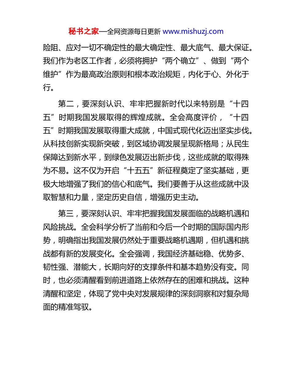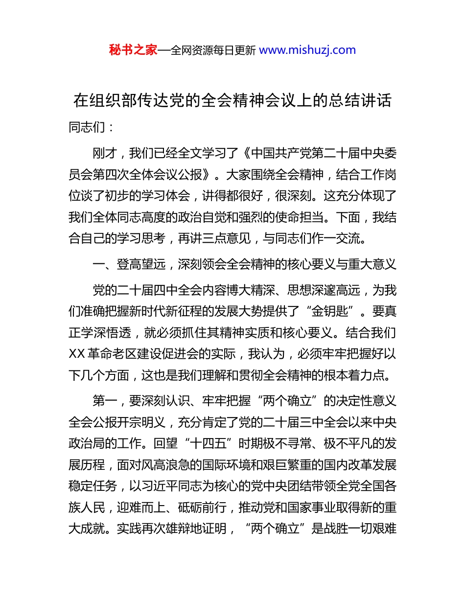 秘书之家—全网资源每日更新 www.mishuzj.com在组织部传达党的全会精神会议上的总结讲话同志们:刚才,我们已经全文学习了《中国共产党第二十届中央委员会第四次全体会议公报》。大家围绕全会精神,结合工作岗位谈了初步的学习体会,讲得都很好,很深刻。这充分体现了我们全体同志高度的政治自觉和强烈的使命担当。下面,我结合自己的学习思考,再讲三点意见,与同志们作一交流。一、登高望远,深刻领会全会精神的核心要义与重大意义党的二十届四中全会内容博大精深、思想深邃高远,为我们准确把握新时代新征程的发展大势提供了“金钥匙”。要真正学深悟透,就必须抓住其精神实质和核心要义。结合我们XX 革命老区建设促进会的实际,我认为,必须牢牢把握好以下几个方面,这也是我们理解和贯彻全会精神的根本着力点。第一,要深刻认识、牢牢把握“两个确立”的决定性意义全会公报开宗明义,充分肯定了党的二十届三中全会以来中央政治局的工作。回望“十四五”时期极不寻常、极不平凡的发展历程,面对风高浪急的国际环境和艰巨繁重的国内改革发展稳定任务,以习近平同志为核心的党中央团结带领全党全国各族人民,迎难而上、砥砺前行,推动党和国家事业取得新的重大成就。实践再次雄辩地证明,“两个确立”是战胜一切艰难秘书之家—全网资源每日更新 www.mishuzj.com险阻、应对一切不确定性的最大确定性、最大底气、最大保证。我们作为老区工作者,必须将拥护“两个确立”、做到“两个维护”作为最高政治原则和根本政治规矩,内化于心、外化于行。第二,要深刻认识、牢牢把握新时代以来特别是“十四五”时期我国发展取得的辉煌成就。全会高度评价,“十四五”时期我国发展取得重大成就,中国式现代化迈出坚实步伐。从科技创新实现新突破,到区域协调发展呈现新格局;从民生保障达到新水平,到绿色发展迈出新步伐,这些成就的取得殊为不易。这不仅为开启“十五五”新征程奠定了坚实基础,更极大地增强了我们的信心和底气。我们要善于从这些成就中汲取智慧和力量,坚定历史自信,增强历史主动。第三,要深刻认识、牢牢把握我国发展面临的战略机遇和风险挑战。全会科学分析了当前和今后一个时期的国际国内形势,明确指出我国发展仍然处于重要战略机遇期,但机遇和挑战都有新的发展变化。全会强调,我国经济基础稳、优势多、韧性强、潜能大,长期向好的支撑条件和基本趋势没有变。同时,也必须清醒看到前进道路上依然存在的困难和挑战。这种清醒和坚定,体现了党中央对发展规律的深刻洞察和对复杂局面的精准驾驭。秘书之家—全网资源每日更新 www.mishuzj.com第四,要深刻认识、牢牢把握“十五五”时期经济社会发展的指导思想和基本原则。全会明确,“十五五”时期要高举中国特色社会主义伟大旗帜,坚持以习近平新时代中国特色社会主义思想为指导,全面贯彻落实党的二十大和二十届历次全会精神。同时,全会提出了必须坚持的六个基本原则,即坚持党的全面领导、坚持以人民为中心、坚持新发展理念、坚持深化改革开放、坚持系统观念、坚持发扬斗争精神。这“一个指导思想”和“六个基本原则”是“十五五”规划建议的灵魂,是我们一切工作的总纲领。第五,要深刻认识、牢牢把握“十五五”时期经济社会发展的主要目标。全会提出了七个方面的主要目标。其中,特别新增了“高质量发展取得显著成效、科技自立自强水平大幅提高、人民生活品质不断提高”等目标。这些目标设定既高远宏大,又具体务实,体现了质量、结构、规模、速度、效益、安全相统一的要求,描绘了到 2030 年我国发展的壮丽图景,必将有力引导全社会预期,凝聚发展共识。第六,要深刻认识、牢牢把握“十五五”时期经济社会发展的十二项重点任务。全会从加快科技自立自强、建设现代化产业体系、全面推进乡村振兴、促进区域协调发展、繁荣发展文化事业、增进民生福祉、推动绿色发展、推进国家安全体系和能力现代化等十二个方面,对“十五五”时期的重点工作作出了系统部署,杜吉明主持召开会长办公会学习传达党的二十秘书之家—全网资源每日更新 www.mishuzj.com届四中全会精神)。这十二项任务构成了一个相互联系、相互促进的...