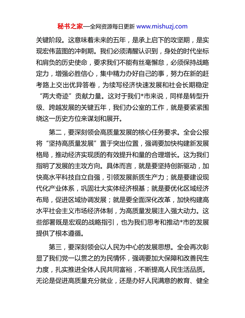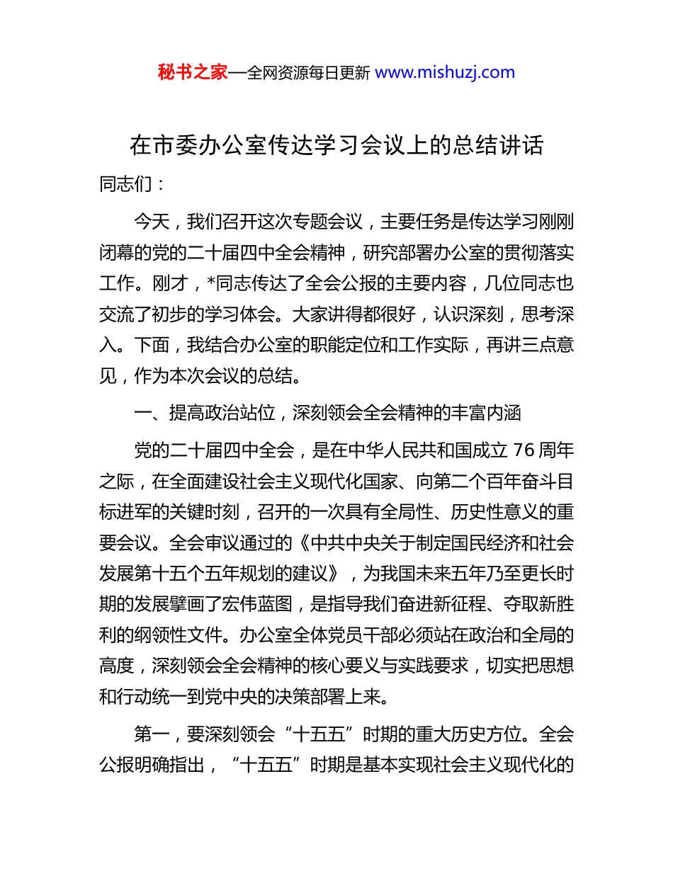 秘书之家—全网资源每日更新 www.mishuzj.com在市委办公室传达学习会议上的总结讲话同志们:今天,我们召开这次专题会议,主要任务是传达学习刚刚闭幕的党的二十届四中全会精神,研究部署办公室的贯彻落实工作。刚才,*同志传达了全会公报的主要内容,几位同志也交流了初步的学习体会。大家讲得都很好,认识深刻,思考深入。下面,我结合办公室的职能定位和工作实际,再讲三点意见,作为本次会议的总结。一、提高政治站位,深刻领会全会精神的丰富内涵党的二十届四中全会,是在中华人民共和国成立 76 周年之际,在全面建设社会主义现代化国家、向第二个百年奋斗目标进军的关键时刻,召开的一次具有全局性、历史性意义的重要会议。全会审议通过的《中共中央关于制定国民经济和社会发展第十五个五年规划的建议》,为我国未来五年乃至更长时期的发展擘画了宏伟蓝图,是指导我们奋进新征程、夺取新胜利的纲领性文件。办公室全体党员干部必须站在政治和全局的高度,深刻领会全会精神的核心要义与实践要求,切实把思想和行动统一到党中央的决策部署上来。第一,要深刻领会“十五五”时期的重大历史方位。全会公报明确指出,“十五五”时期是基本实现社会主义现代化的秘书之家—全网资源每日更新 www.mishuzj.com关键阶段。这意味着未来的五年,是承上启下的攻坚期,是实现宏伟蓝图的冲刺期。我们必须清醒认识到,身处的时代坐标和肩负的历史使命,要求我们不能有丝毫懈怠,必须保持战略定力,增强必胜信心,集中精力办好自己的事,努力在新的赶考路上交出优异答卷,为续写经济快速发展和社会长期稳定“两大奇迹”贡献力量。这对于我们*市来说,同样是转型升级、跨越发展的关键五年,我们办公室的工作,就是要紧紧围绕这一历史方位来谋划和展开。第二,要深刻领会高质量发展的核心任务要求。全会公报将“坚持高质量发展”置于突出位置,强调要加快构建新发展格局,推动经济实现质的有效提升和量的合理增长。这为我们指明了发展的主攻方向。具体而言,就是要坚持创新驱动,加快高水平科技自立自强,引领发展新质生产力;就是要建设现代化产业体系,巩固壮大实体经济根基;就是要优化区域经济布局,促进区域协调发展;就是要全面深化改革,加快构建高水平社会主义市场经济体制,为高质量发展注入强大动力。这些部署既是宏观的战略指引,也为我们思考和推动*市的发展提供了根本遵循。第三,要深刻领会以人民为中心的发展思想。全会再次彰显了我们党一以贯之的为民情怀,强调要加大保障和改善民生力度,扎实推进全体人民共同富裕,不断提高人民生活品质。无论是促进高质量充分就业,还是办好人民满意的教育、健全秘书之家—全网资源每日更新 www.mishuzj.com社会保障体系、推进健康中国建设,都体现了发展为了人民、发展依靠人民、发展成果由人民共享的价值追求。市委办公室作为离市委最近、服务群众最直接的部门之一,必须将这种思想融入血脉、见诸行动,始终把人民群众的安危冷暖放在心上。第四,要深刻领会统筹发展和安全的重大原则。安全是发展的前提,发展是安全的保障。全会强调要更好统筹发展和安全,推进国家安全体系和能力现代化。这要求我们在谋划工作、推进发展时,必须增强忧患意识,坚持底线思维,下好先手棋、打好主动仗,有效防范化解政治、经济、社会、生态等各领域风险挑战,确保*市在现代化建设的道路上行稳致远。二、聚焦职责使命,全力做好服务保障的各项工作学习贯彻全会精神,关键在于结合实际、推动工作。市委办公室作为市委的“坚强前哨”和“巩固后院”,承担着参谋辅政、统筹协调、督查督办、服务保障的重要职责。我们必须把全会精神转化为做好“三服务”工作的具体思路、务实举措和实际行动,在服务*市高质量发展大局中展现新担当、新作为。第一,围绕“高质量发展”这一首要任务,当好参谋助手全会为“十五五”时期的经济工作定下了基调。对照全会要求,我们必须清醒地看到*市当前发展面临的挑战。2024 年,我市地区生产总值增长 3.0%,虽然总量保持领先,但增速有所秘书之家—全网资源每日更新 www.mishuzj.com放缓。特别是第二产业增加值占比仅为 19.3...