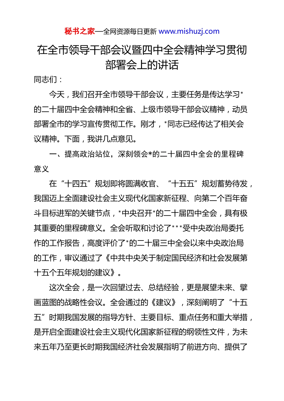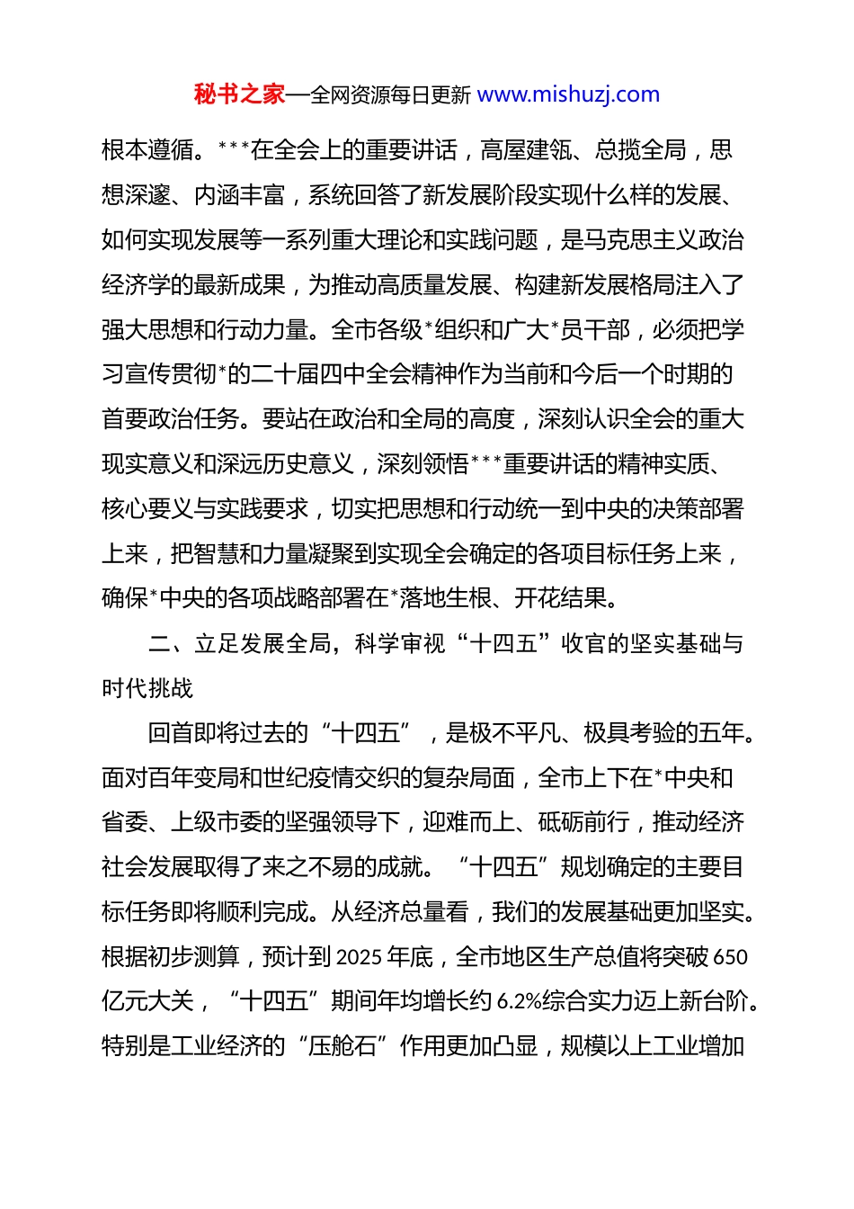 秘书之家—全网资源每日更新 www.mishuzj.com在全市领导干部会议暨四中全会精神学习贯彻部署会上的讲话同志们:今天,我们召开全市领导干部会议,主要任务是传达学习*的二十届四中全会精神和全省、上级市领导干部会议精神,动员部署全市的学习宣传贯彻工作。刚才,*同志已经传达了相关会议精神。下面,我讲几点意见。一、提高政治站位,深刻领会*的二十届四中全会的里程碑意义在“十四五”规划即将圆满收官、“十五五”规划蓄势待发,我国迈上全面建设社会主义现代化国家新征程、向第二个百年奋斗目标进军的关键节点,*中央召开*的二十届四中全会,具有极其重要的里程碑意义。全会听取和讨论了***受中央政治局委托作的工作报告,高度评价了*的二十届三中全会以来中央政治局的工作,审议通过了《中共中央关于制定国民经济和社会发展第十五个五年规划的建议》。这次全会,是一次回望过去、总结经验,更是展望未来、擘画蓝图的战略性会议。全会通过的《建议》,深刻阐明了“十五五”时期我国发展的指导方针、主要目标、重点任务和重大举措,是开启全面建设社会主义现代化国家新征程的纲领性文件,为未来五年乃至更长时期我国经济社会发展指明了前进方向、提供了秘书之家—全网资源每日更新 www.mishuzj.com根本遵循。***在全会上的重要讲话,高屋建瓴、总揽全局,思想深邃、内涵丰富,系统回答了新发展阶段实现什么样的发展、如何实现发展等一系列重大理论和实践问题,是马克思主义政治经济学的最新成果,为推动高质量发展、构建新发展格局注入了强大思想和行动力量。全市各级*组织和广大*员干部,必须把学习宣传贯彻*的二十届四中全会精神作为当前和今后一个时期的首要政治任务。要站在政治和全局的高度,深刻认识全会的重大现实意义和深远历史意义,深刻领悟***重要讲话的精神实质、核心要义与实践要求,切实把思想和行动统一到中央的决策部署上来,把智慧和力量凝聚到实现全会确定的各项目标任务上来,确保*中央的各项战略部署在*落地生根、开花结果。二、立足发展全局,科学审视“十四五”收官的坚实基础与时代挑战回首即将过去的“十四五”,是极不平凡、极具考验的五年。面对百年变局和世纪疫情交织的复杂局面,全市上下在*中央和省委、上级市委的坚强领导下,迎难而上、砥砺前行,推动经济社会发展取得了来之不易的成就。“十四五”规划确定的主要目标任务即将顺利完成。从经济总量看,我们的发展基础更加坚实。根据初步测算,预计到 2025 年底,全市地区生产总值将突破 650亿元大关,“十四五”期间年均增长约 6.2%综合实力迈上新台阶。特别是工业经济的“压舱石”作用更加凸显,规模以上工业增加秘书之家—全网资源每日更新 www.mishuzj.com值预计五年年均增长超过 8%,“工业强市”战略成效显著。固定资产投资保持了稳定增长,为长远发展积蓄了强劲动能。从发展质量看,我们的转型步伐更加稳健。产业结构持续优化,以精细化工、新材料、生物医药等为主导的“5+2”现代化产业体系加速构建,战略性新兴产业产值占规上工业比重稳步提升。改革开放持续深化,“腾笼换鸟”盘活存量土地与闲置资产,营商环境不断优化,市场主体活力得到有效激发。城乡面貌日新月异,一批重大基础设施项目建成投用,城市功能与品质得到显著提升。从民生福祉看,我们的人民生活更加殷实。我们始终坚持以人民为中心的发展思想,财政支出的七成以上用于民生领域。城镇居民人均可支配收入预计到今年底将超过 52000 元,农村居民人均可支配收入增速持续快于城镇居民。覆盖城乡的社会保障体系更加健全,教育、医疗、养老等公共服务水平不断提高,人民群众的获得感、幸福感、安全感更加充实。在肯定成绩的同时,也必须清醒地认识到,对标*的二十届四中全会提出的新目标新要求,对标人民群众对美好生活的新期待,我们的工作中还存在不少短板和挑战。主要体现在:一是产业层次总体不高,传统产业占比依然较大,新兴产业的支撑作用有待进一步增强;二是科技创新能力不足,高能级的创新平台和高层次的领军人才较为匮乏,创新对发展的驱动力不够强劲;三是城乡区域发展不平衡问题依然存在,乡村全面振...