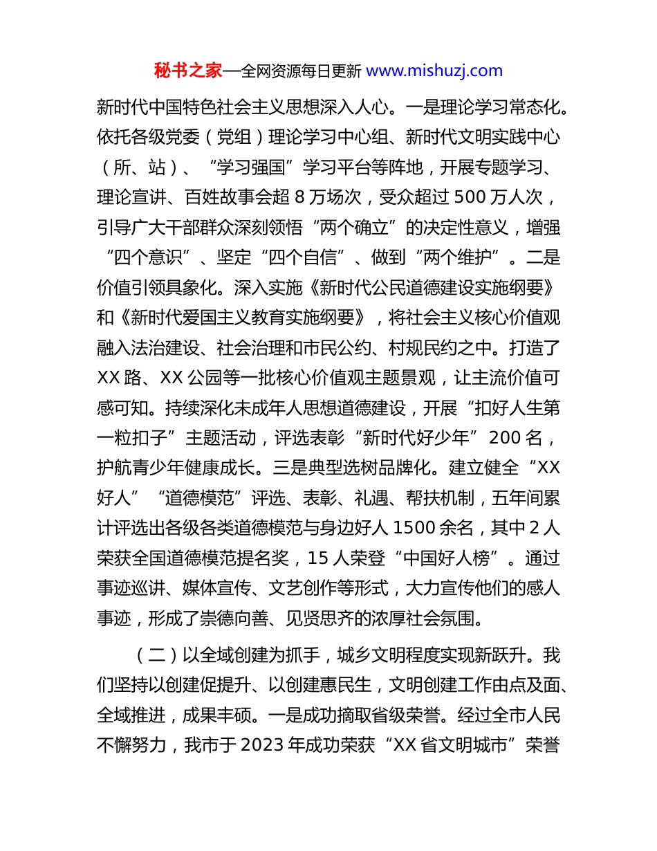秘书之家—全网资源每日更新 www.mishuzj.com市文明办关于“十四五”和 2025 年精神文明建设工作总结暨“十五五”和 2026 年工作安排的报告“十四五”时期,是我市全面深化改革、推动高质量发展的关键五年。站在 2025 年最后一个季度,我们即将完成“十四五”规划的各项目标任务,开启“十五五”发展新征程。市文明办坚持以习近平新时代中国特色社会主义思想为指导,紧紧围绕举旗帜、聚民心、育新人、兴文化、展形象的使命任务,聚焦文明培育、文明实践、文明创建,扎实推进精神文明建设各项工作,为全市经济社会高质量发展提供了坚强思想保证和强大精神动力。本报告系统总结“十四五”时期及 2025 年精神文明建设工作,科学谋划“十五五”时期及 2026 年的发展蓝图。一、“十四五”时期精神文明建设工作总结2021 年以来,全市上下坚持物质文明和精神文明“两手抓、两手硬”,以培育和践行社会主义核心价值观为主线,以提升城乡文明程度和市民文明素养为目标,推动精神文明建设工作取得了历史性成就,迈上了新台阶。(一)以思想引领为核心,文明培育根基更加牢固。“十四五”期间,我们始终把理论武装摆在首位,持续推动习近平秘书之家—全网资源每日更新 www.mishuzj.com新时代中国特色社会主义思想深入人心。一是理论学习常态化。依托各级党委(党组)理论学习中心组、新时代文明实践中心(所、站)、“学习强国”学习平台等阵地,开展专题学习、理论宣讲、百姓故事会超 8 万场次,受众超过 500 万人次,引导广大干部群众深刻领悟“两个确立”的决定性意义,增强“四个意识”、坚定“四个自信”、做到“两个维护”。二是价值引领具象化。深入实施《新时代公民道德建设实施纲要》和《新时代爱国主义教育实施纲要》,将社会主义核心价值观融入法治建设、社会治理和市民公约、村规民约之中。打造了XX 路、XX 公园等一批核心价值观主题景观,让主流价值可感可知。持续深化未成年人思想道德建设,开展“扣好人生第一粒扣子”主题活动,评选表彰“新时代好少年”200 名,护航青少年健康成长。三是典型选树品牌化。建立健全“XX好人”“道德模范”评选、表彰、礼遇、帮扶机制,五年间累计评选出各级各类道德模范与身边好人 1500 余名,其中 2 人荣获全国道德模范提名奖,15 人荣登“中国好人榜”。通过事迹巡讲、媒体宣传、文艺创作等形式,大力宣传他们的感人事迹,形成了崇德向善、见贤思齐的浓厚社会氛围。(二)以全域创建为抓手,城乡文明程度实现新跃升。我们坚持以创建促提升、以创建惠民生,文明创建工作由点及面、全域推进,成果丰硕。一是成功摘取省级荣誉。经过全市人民不懈努力,我市于 2023 年成功荣获“XX 省文明城市”荣誉秘书之家—全网资源每日更新 www.mishuzj.com称号,这是我市精神文明建设史上具有里程碑意义的重大成就,极大提升了城市的知名度、美誉度和市民的自豪感、归属感。二是城乡创建扩面提质。坚持城乡“一盘棋”,扎实推进文明村镇、文明单位、文明家庭、文明校园创建。截至 2025 年底,全市县级及以上文明村镇占比达到 78%,县级及以上文明单位占比达到 85%,均超额完成“十四五”规划目标。建成了一批诸如 XX 镇、XX 村等在全省具有影响力的文明创建示范点。三是创建内涵持续深化。将文明创建与城市更新、乡村振兴、人居环境整治等中心工作紧密结合,累计完成 3500 个老旧小区改造,新建“口袋公园”120 个,农村户用卫生厕所普及率达到 88%。通过文明创建,有效解决了一批群众“急难愁盼”问题,城市功能与品质、乡村面貌得到显著改善。(三)以移风易俗为突破,社会文明新风尚广泛弘扬。紧盯陈规陋习和突出问题,深入推进移风易俗,着力培育文明乡风、良好家风、淳朴民风。一是治理体系不断完善。全市1200 余个行政村全部建立红白理事会、村民议事会等群众自治组织,将婚事新办、丧事简办、喜事俭办等要求纳入村规民约,有效遏制了高价彩礼、大操大办、铺张浪费等不良风气。二是实践活动丰富多彩。广泛开展“反对浪费、崇尚节约”文明行动,深化“文明餐桌”“光盘行动”。依托“我们的节日”主题活动,...