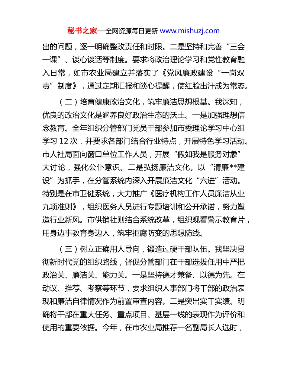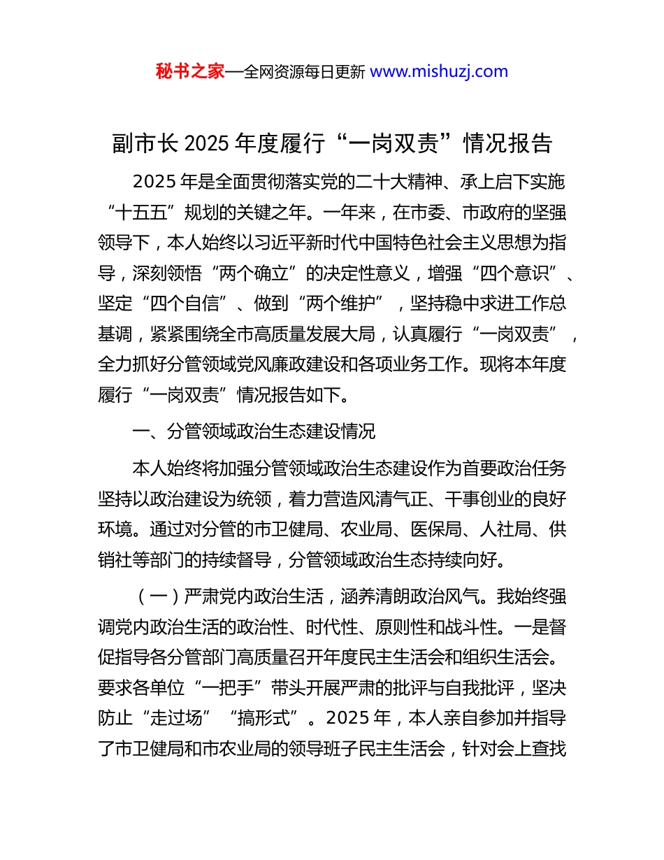 秘书之家—全网资源每日更新 www.mishuzj.com副市长 2025 年度履行“一岗双责”情况报告2025 年是全面贯彻落实党的二十大精神、承上启下实施“十五五”规划的关键之年。一年来,在市委、市政府的坚强领导下,本人始终以习近平新时代中国特色社会主义思想为指导,深刻领悟“两个确立”的决定性意义,增强“四个意识”、坚定“四个自信”、做到“两个维护”,坚持稳中求进工作总基调,紧紧围绕全市高质量发展大局,认真履行“一岗双责”,全力抓好分管领域党风廉政建设和各项业务工作。现将本年度履行“一岗双责”情况报告如下。一、分管领域政治生态建设情况本人始终将加强分管领域政治生态建设作为首要政治任务坚持以政治建设为统领,着力营造风清气正、干事创业的良好环境。通过对分管的市卫健局、农业局、医保局、人社局、供销社等部门的持续督导,分管领域政治生态持续向好。(一)严肃党内政治生活,涵养清朗政治风气。我始终强调党内政治生活的政治性、时代性、原则性和战斗性。一是督促指导各分管部门高质量召开年度民主生活会和组织生活会。要求各单位“一把手”带头开展严肃的批评与自我批评,坚决防止“走过场”“搞形式”。2025 年,本人亲自参加并指导了市卫健局和市农业局的领导班子民主生活会,针对会上查找秘书之家—全网资源每日更新 www.mishuzj.com出的问题,逐一明确整改责任和时限。二是坚持和完善“三会一课”、谈心谈话等制度。要求将政治理论学习和党性教育融入日常,如市农业局建立并落实了《党风廉政建设“一岗双责”制度》,通过定期汇报和谈心提醒,使红脸出汗成为常态。(二)培育健康政治文化,筑牢廉洁思想根基。我深知,优良的政治文化是涵养良好政治生态的沃土。一是加强理想信念教育。全年组织分管部门党员干部参加市委理论学习中心组学习 12 次,并要求各部门结合行业特点,开展特色学习活动。市人社局面向窗口单位工作人员,开展“假如我是服务对象”大讨论,强化公仆意识。二是弘扬廉洁文化。以“清廉**建设”为抓手,在分管系统内深入开展廉洁文化“六进”活动。特别是在市卫健系统,大力推广《医疗机构工作人员廉洁从业九项准则》,组织医务人员进行专题培训和公开承诺,努力塑造行业新风。市供销社则结合系统改革,组织观看警示教育片,用身边事教育身边人,筑牢拒腐防变的思想防线。(三)树立正确用人导向,锻造过硬干部队伍。我坚决贯彻新时代党的组织路线,督促分管部门在干部选拔任用中严把政治关、廉洁关、能力关。一是坚持德才兼备、以德为先。在动议、推荐、考察等环节,要求组织人事部门将干部的政治表现和廉洁自律情况作为前置审查内容。二是突出实干实绩。明确将干部在重大任务、重点项目、基层一线的表现作为评价和使用的重要依据。今年,在市农业局推荐一名副局长人选时,秘书之家—全网资源每日更新 www.mishuzj.com我明确要求优先考虑在乡村振兴和粮食安全等重点工作中表现突出的干部,树立了“有为者有位”的鲜明导向。(四)聚焦“一把手”政治修为,发挥“头雁效应”。“一把手”是政治生态的风向标。我将对分管部门“一把手”的监督作为重中之重。全年与 5 个分管部门的“一把手”开展廉政谈话,及时提醒和纠正苗头性、倾向性问题。要求他们不仅要自身正、自身硬,更要敢抓敢管、严抓严管,切实履行好第一责任人职责。在督促市医保局处理医保基金诈骗窝案时,我明确要求局党组书记必须亲自挂帅、一抓到底,不仅要查清案件,更要深刻反思监管漏洞,推动系统性整改。(五)完善治理体系,提升治理能力。结合年度重点工作将政治生态建设融入具体业务实践。一是扎实推进“清廉建设”实践。在分管领域全面铺开,市卫健局查摆廉政风险点,制定整改措施;市农业局梳理涉农补贴、项目审批等关键环节的廉政风险清单,扎紧制度笼子。二是集中整治群众身边不正之风和腐败问题。这是检验政治生态成色的试金石。我牵头成立专项督导组,重点督办医疗、医保、社保领域的突出问题。2025 年,市卫健和医保系统联合开展打击“假病人、假病情、假票据”专项整治行动。市人社局针对群众反映强烈的社保服务“中梗阻”问题,精简了...