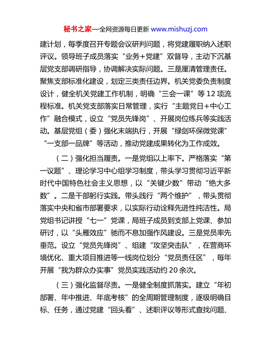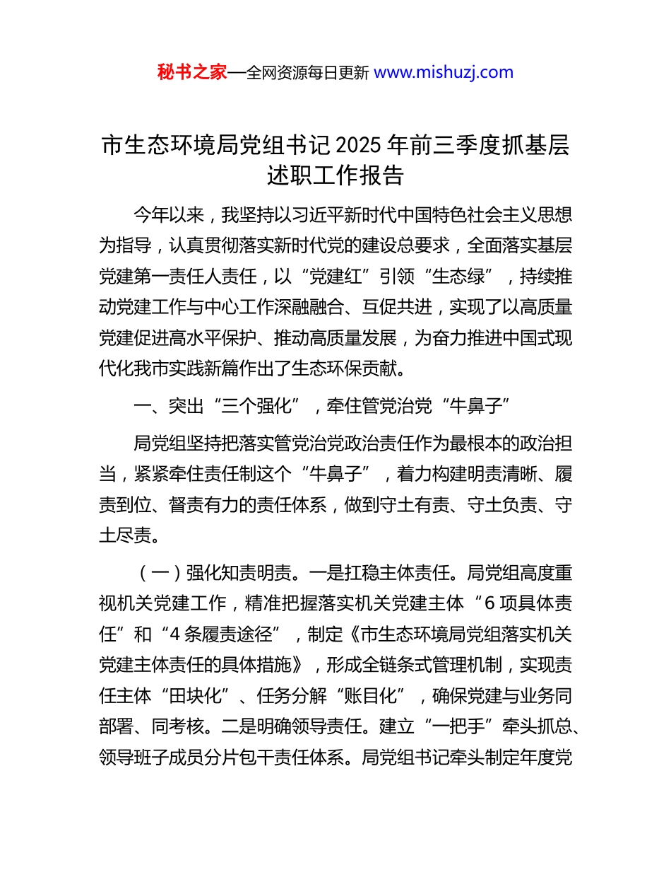 秘书之家—全网资源每日更新 www.mishuzj.com市生态环境局党组书记 2025 年前三季度抓基层述职工作报告今年以来,我坚持以习近平新时代中国特色社会主义思想为指导,认真贯彻落实新时代党的建设总要求,全面落实基层党建第一责任人责任,以“党建红”引领“生态绿”,持续推动党建工作与中心工作深融融合、互促共进,实现了以高质量党建促进高水平保护、推动高质量发展,为奋力推进中国式现代化我市实践新篇作出了生态环保贡献。一、突出“三个强化”,牵住管党治党“牛鼻子”局党组坚持把落实管党治党政治责任作为最根本的政治担当,紧紧牵住责任制这个“牛鼻子”,着力构建明责清晰、履责到位、督责有力的责任体系,做到守土有责、守土负责、守土尽责。(一)强化知责明责。一是扛稳主体责任。局党组高度重视机关党建工作,精准把握落实机关党建主体“6 项具体责任”和“4 条履责途径”,制定《市生态环境局党组落实机关党建主体责任的具体措施》,形成全链条式管理机制,实现责任主体“田块化”、任务分解“账目化”,确保党建与业务同部署、同考核。二是明确领导责任。建立“一把手”牵头抓总、领导班子成员分片包干责任体系。局党组书记牵头制定年度党秘书之家—全网资源每日更新 www.mishuzj.com建计划,每季度召开专题会议研判问题,将党建履职纳入述职评议。领导班子成员落实“业务+党建”双督导,主动下沉基层党支部调研指导,协调解决实际问题。三是厘清管理责任。聚焦支部标准化建设,划定三类责任边界。机关党委负责制度设计,健全机关党建工作机制,明确“三会一课”等 12 项流程标准。机关党支部落实日常管理,实行“主题党日+中心工作”融合模式,设立“党员先锋岗”、开展岗位练兵等实践活动。基层党组(委)强化末端执行,开展“绿剑环保微党课”“一支部一品牌”等活动,推动党建成果转化为工作成效。(二)强化担当履责。一是党组以上率下。严格落实“第一议题”、理论学习中心组学习制度,带头学习贯彻习近平新时代中国特色社会主义思想,以“关键少数”带动“绝大多数”。二是干部躬行实践。带头践行“两个维护”,带头贯彻落实中央和省市部署要求,以实际行动诠释先进性纯洁性。局党组书记讲授“七一”党课,局班子成员到支部上党课、参加研讨,以“头雁效应”驰而不息加强作风建设。三是党员率先垂范。设立“党员先锋岗”、组建“攻坚突击队”,在营商环境优化、重大项目推进等一线岗位划分“党员责任区”,每年开展“我为群众办实事”党员实践活动约 20 余次。(三)强化监督尽责。一是健全制度抓落实。建立“年初部署、年中推进、年底考核”的全周期管理制度,逐级明确目标、任务,通过党建“回头看”、述职评议等形式查找问题、秘书之家—全网资源每日更新 www.mishuzj.com补齐短板,实现全年全过程压实责任。二是常态督导抓落实。党组成员定期到分管部门检查党建情况,机关党委落实“月提示、季督查、年考评”机制,推动责任延伸落实。党支部之间开展交叉检查,学习借鉴、查找差距,形成比学赶超的良好氛围。三是科学考核抓落实。制定差异化考核指标,避免“一刀切”。将党建考核结果与领导班子评价、干部选拔任用、评优评先、绩效奖励“四挂钩”,形成鲜明的导向和激励约束机制,督促各级党组织精心履职、尽心尽责。二、坚持“三个抓强”,激活基层党建“动力源”局党组牢固树立“大抓基层”鲜明导向,以强化政治功能为重点,以“四强”党支部创建为抓手,持续推进“堡垒升级”工程。(一)抓强机关促干。一是以政治机关建设为根本。始终把党的政治建设摆在首位,旗帜鲜明讲政治。用好“先锋讲坛”“今天我来讲生态大讲堂”等学习平台,依托“三会一课”、主题党日等载体,邀请专家学者围绕学习宣传党的二十大和二十届二中、三中全会精神等举办专题讲座,每年组织450 余名党员开展党性培训,持续提升政治站位,教育引导全体党员坚定捍卫“两个确立”、坚决做到“两个维护”。二是以模范机关建设为目标。锚定“三个表率”政治定位,聚焦“政治过硬、担当作为、服务高效”核心标准,创新“理论+秘书之家—全网资源每日更新 www.mishuzj.com...