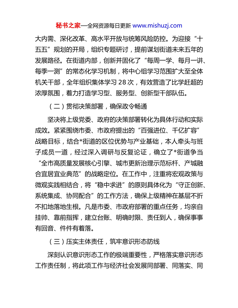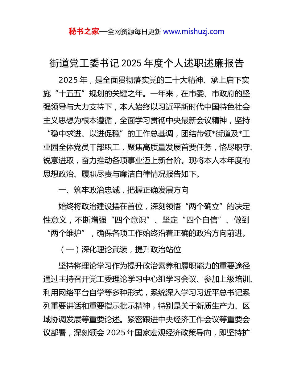 秘书之家—全网资源每日更新 www.mishuzj.com街道党工委书记 2025 年度个人述职述廉报告2025 年,是全面贯彻落实党的二十大精神、承上启下实施“十五五”规划的关键之年。一年来,在市委、市政府的坚强领导与大力支持下,本人始终以习近平新时代中国特色社会主义思想为根本遵循,全面学习贯彻中央最新会议精神,坚持“稳中求进、以进促稳”的工作总基调,团结带领*街道及*工业园全体党员干部职工,聚焦高质量发展首要任务,恪尽职守、锐意进取,奋力推动各项事业迈上新台阶。现将本人本年度的思想政治、履职尽责与廉洁自律情况报告如下。一、筑牢政治忠诚,把握正确发展方向始终将政治建设摆在首位,深刻领悟“两个确立”的决定性意义,不断增强“四个意识”、坚定“四个自信”、做到“两个维护”,确保各项工作始终沿着正确的政治方向前进。(一)深化理论武装,提升政治站位坚持将理论学习作为提升政治素养和履职能力的重要途径通过主持召开党工委理论学习中心组学习会议、参加上级培训、利用网络平台自学等多种形式,系统深入学习习近平总书记系列重要讲话和重要指示批示精神,特别是关于新质生产力、区域协调发展等重要论述。紧密跟进中央经济工作会议等重要会议部署,深刻领会 2025 年国家宏观经济政策导向,即坚持扩秘书之家—全网资源每日更新 www.mishuzj.com大内需、深化改革、高水平开放与统筹风险防控。为迎接“十五五”规划的开局,组织专题研讨,提前谋划街道未来五年的发展路径。在街道内部,创新并固化了“每周一学、每月一讲、每季一测”的常态化学习机制,将中心组学习范围扩大至全体机关干部,全年组织集体学习 28 次,有效营造了比学赶超的浓厚氛围,着力打造学习型、服务型、创新型干部队伍。(二)贯彻决策部署,确保政令畅通坚决将上级党委、政府的决策部署转化为具体行动和实际成效。紧紧围绕市委、市政府提出的“百强进位、千亿扩容”战略目标,结合*街道的区位优势与产业基础,本人牵头与班子成员一道,经过深入调研与反复论证,确立了*街道争当“全市高质量发展核心引擎、城市更新治理示范标杆、产城融合宜居宜业典范”的战略定位。在工作中,注重将宏观政策与微观实践相结合,将“稳中求进”的原则具体化为“守正创新、系统集成、协同配合”的工作方法,确保上级精神在基层不折不扣地落地生根。凡是市委、市政府部署的重点任务,均亲自挂帅、靠前指挥,建立台账、明确时限、责任到人,确保事事有回音、件件有着落。(三)压实主体责任,筑牢意识形态防线深刻认识意识形态工作的极端重要性,严格落实意识形态工作责任制,将此项工作与经济社会发展同部署、同落实、同秘书之家—全网资源每日更新 www.mishuzj.com检查、同考核。本人认真履行“第一责任人”职责,定期主持召开意识形态工作专题会议,分析研判意识形态领域风险点,特别是针对网络舆情、社会思潮等进行科学预判与有效应对。同时,督促班子成员认真履行“一岗双责”,要求其将意识形态工作融入分管领域,加强对干部职工和辖区群众的思想政治引领,牢牢掌握意识形态工作的领导权、管理权和话语权,坚决抵御和防范各类错误思潮的渗透侵蚀,为改革发展稳定营造了健康向上的思想舆论环境。(四)弘扬法治精神,提升治理效能带头尊法学法守法用法,将法治思维和法治方式贯穿于决策、执行、监督全过程。坚持重大决策的合法性审查,聘请常年法律顾问对重要合同、重大项目进行前置把关,确保决策的科学化、民主化、法治化。在处理征地拆迁、环境治理、信访维稳等复杂矛盾和问题时,坚持依法办事,引导群众通过法律途径表达诉求、解决纠纷。2025 年,街道全年涉法涉诉信访案件数量同比下降 18%,成功运用法治手段化解了一批历史遗留问题,有效提升了基层治理的现代化水平,维护了社会公平正义与和谐稳定。二、聚焦高质量发展,奋力谱写实干新篇始终牢记发展是第一要务,面对复杂严峻的外部环境和艰巨繁重的改革发展任务,勇于担当、善于作为,全力以赴推动秘书之家—全网资源每日更新 www.mishuzj.com经济社会发展取得新突破。(一)狠抓经济建设,增强区域综合实力以经济建设为中心,全...