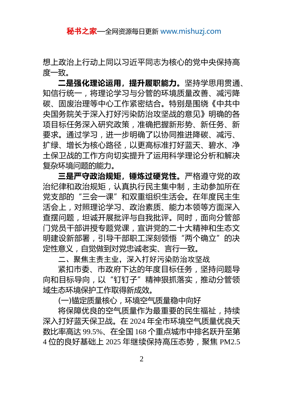 秘书之家—全网资源每日更新 www.mishuzj.comXX 市生态环境局副局长 2025 年度个人述职述廉报告根据组织安排,现将本人 2025 年度履职及廉洁自律情况报告如下。2025 年是全面贯彻落实党的二十大精神的关键之年,是实施“十四五”规划的攻坚之年。一年来,在局党委的坚强领导和班子成员的团结协作下,本人以习近平新时代中国特色社会主义思想为指导,深入学习贯彻习近平生态文明思想,紧紧围绕“深入打好污染防治攻坚战”这一主线团结带领分管处室和单位,聚焦主责、勇于担当、勤勉履职、清正廉洁,全力推动各项工作任务落地见效,为加快建设生态文明示范城市贡献了力量。一、深化理论武装,筑牢政治忠诚根基始终将政治建设摆在首位,坚持用党的创新理论武装头脑、指导实践、推动工作,不断提升政治判断力、政治领悟力、政治执行力。一是坚定政治信仰,把牢正确方向。深入学习领会党的二十大及二十届二中、三中全会精神,系统学习习近平总书记关于生态文明建设的重要论述和对 XX 工作的系列重要指示批示精神。坚持把学习成果转化为增强“四个意识”、坚定“四个自信”、做到“两个维护”的政治自觉和行动自觉。在各项工作中,坚决贯彻落实党中央、国务院关于生态环境保护的重大决策部署,确保中央和省、市委的各项要求在分管领域不折不扣地执行到位,始终在思1秘书之家—全网资源每日更新 www.mishuzj.com想上政治上行动上同以习近平同志为核心的党中央保持高度一致。二是强化理论运用,提升履职能力。坚持学思用贯通、知信行统一,将理论学习与分管的环境质量改善、减污降碳、固废治理等中心工作紧密结合。特别是围绕《中共中央国务院关于深入打好污染防治攻坚战的意见》明确的各项目标任务深入研究政策,准确把握新形势、新任务、新要求。通过学习,进一步明确了以协同推进降碳、减污、扩绿、增长为核心路径,以更高标准打好蓝天、碧水、净土保卫战的工作方向切实提升了运用科学理论分析和解决复杂环境问题的能力。三是严守政治规矩,锤炼过硬党性。严格遵守党的政治纪律和政治规矩,认真执行民主集中制,主动参加所在党支部的“三会一课”和双重组织生活会。在年度民主生活会上,对照理论学习、政治素质、能力本领等方面深入查摆问题,坦诚开展批评与自我批评。同时,面向分管部门党员干部讲授专题党课,宣讲党的二十大精神和生态文明建设新部署,引导干部职工深刻领悟“两个确立”的决定性意义,自觉做到对党忠诚老实、言行一致。二、聚焦主责主业,深入打好污染防治攻坚战紧扣市委、市政府下达的年度目标任务,坚持问题导向和目标导向,以“钉钉子”精神狠抓落实,推动分管领域生态环境保护工作取得新成效。(一)锚定质量核心,环境空气质量稳中向好将保障优良的空气质量作为最重要的民生福祉,持续深入打好蓝天保卫战。在 2024 年全市环境空气质量优良天数比率高达 99.5%、在全国 168 个重点城市中排名跃升至第4 位的良好基础上 2025 年继续保持高压态势,聚焦 PM2.52秘书之家—全网资源每日更新 www.mishuzj.com协同控制和臭氧污染治理确保空气质量持续领跑。根据工作部署,本年度的目标是确保空气质量优良天数比率稳定在 98.9%以上。截至目前,全市空气质量保持优良,其中 1月和 5 月优良率均达到 100%1 至 6 月在全国 168 个重点城市中排名第 7 位全年目标有望顺利实现。具体工作体现在以下几个方面:一是深化源头治理,牵头组织实施《XX 市细颗粒物治理攻坚方案》,强化工业企业废气排放监管,推进重点行业超低排放改造和挥发性有机物综合整治。二是强化精细管控,统筹推进施工扬尘、道路扬尘和裸地扬尘的系统治理,利用高科技监测手段,实现对重点区域的精准溯源和动态监管。三是加强联防联控,建立健全区域大气污染防治协作机制,有效应对外来污染输入和不利气象条件,确保重污染天气“零发生”。(二)坚持系统治理,协同推进减污降碳增效深刻认识到减污与降碳的内在统一性,将碳达峰碳中和工作摆在突出位置,以能源、工业、交通等重点领域为突破口,推动绿色低碳转型。一是明确目标路径。根据《XX 贵安减污降碳协同增效实施方案》要求...