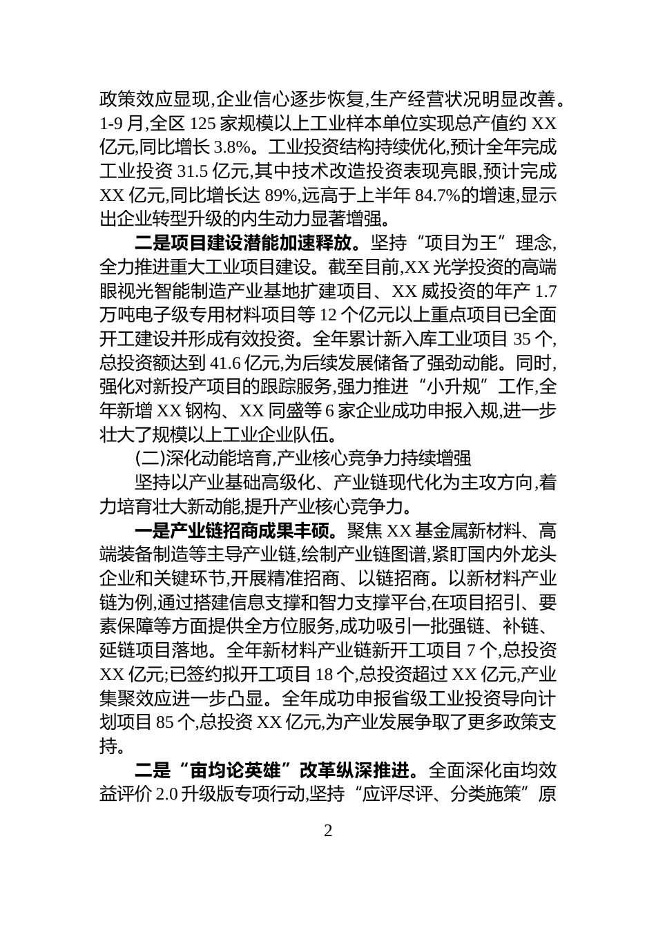 XX 区工业和信息化局 2025 年工作总结2025 年是全面贯彻落实党的二十大精神的关键之年,也是实施“十四五”规划的收官之年。一年来,在区委、区政府的坚强领导下,XX 区工业和信息化局坚持以习近平新时代中国特色社会主义思想为指导,深入学习贯彻党的二十大和二十届二中、三中全会精神,特别是紧密围绕 10 月闭幕的党的二十届四中全会作出的重大决策部署,立足新发展阶段,贯彻新发展理念,服务和融入新发展格局,以推动高质量发展为主题,以“工业立区、智造强区”为核心战略,统筹发展与安全,扎实推进稳增长、促转型、优服务、强党建各项工作,全区工业经济呈现出稳中向好、质效提升的良好态势,为“十四五”规划的圆满收官和“十五五”规划的良好开局奠定了坚实基础。一、2025 年主要工作成效面对复杂严峻的外部环境和艰巨繁重的改革发展稳定任务,全局上下凝心聚力,攻坚克难,推动工业经济在高质量发展的轨道上行稳致远。预计全年,全区规模以上工业总产值将突破 700 亿元,同比增长约 4%;规模以上工业增加值增速预计达到 6.1%,顺利完成年度预期目标。(一)聚焦稳定增长,工业经济运行稳中向好始终将稳增长作为首要任务,强化经济运行监测调度,精准施策,全力保障工业经济平稳健康发展。一是经济运行态势持续巩固。密切跟踪重点行业、重点企业生产经营状况,建立“一企一策”帮扶机制,有效应对了部分头部企业因市场波动、订单不足带来的短期冲击。上半年,在复杂局面下实现了规上工业产值 2%的增长,为全年稳定增长奠定了基础。进入下半年,随着一系列宏观调控1政策效应显现,企业信心逐步恢复,生产经营状况明显改善。1-9 月,全区 125 家规模以上工业样本单位实现总产值约 XX亿元,同比增长 3.8%。工业投资结构持续优化,预计全年完成工业投资 31.5 亿元,其中技术改造投资表现亮眼,预计完成XX 亿元,同比增长达 89%,远高于上半年 84.7%的增速,显示出企业转型升级的内生动力显著增强。二是项目建设潜能加速释放。坚持“项目为王”理念,全力推进重大工业项目建设。截至目前,XX 光学投资的高端眼视光智能制造产业基地扩建项目、XX 威投资的年产 1.7万吨电子级专用材料项目等 12 个亿元以上重点项目已全面开工建设并形成有效投资。全年累计新入库工业项目 35 个,总投资额达到 41.6 亿元,为后续发展储备了强劲动能。同时,强化对新投产项目的跟踪服务,强力推进“小升规”工作,全年新增 XX 钢构、XX 同盛等 6 家企业成功申报入规,进一步壮大了规模以上工业企业队伍。(二)深化动能培育,产业核心竞争力持续增强坚持以产业基础高级化、产业链现代化为主攻方向,着力培育壮大新动能,提升产业核心竞争力。一是产业链招商成果丰硕。聚焦 XX 基金属新材料、高端装备制造等主导产业链,绘制产业链图谱,紧盯国内外龙头企业和关键环节,开展精准招商、以链招商。以新材料产业链为例,通过搭建信息支撑和智力支撑平台,在项目招引、要素保障等方面提供全方位服务,成功吸引一批强链、补链、延链项目落地。全年新材料产业链新开工项目 7 个,总投资XX 亿元;已签约拟开工项目 18 个,总投资超过 XX 亿元,产业集聚效应进一步凸显。全年成功申报省级工业投资导向计划项目 85 个,总投资 XX 亿元,为产业发展争取了更多政策支持。二是“亩均论英雄”改革纵深推进。全面深化亩均效益评价 2.0 升级版专项行动,坚持“应评尽评、分类施策”原2则,组织全区 125 家规模以上工业企业和部分规下企业参与评价。通过引导企业精准核报用地、税收、产出等核心数据,倒逼企业节约集约利用资源。经初步测算,本年度参评企业亩均税收达到 XX 万元/亩,较上一年度增幅超过 52%,资源配置效率和土地产出效益得到显著提升。评价结果被广泛应用于资源要素差别化配置,有力地促进了产业结构优化和发展方式转变。三是特色产业集群优势更加巩固。依托 XX 基金属新材料省级中小企业特色产业集群,充分发挥 XX 铜业等链主企业的引领带动作用,推动产业链上下游协同发展。在年度复核中,该产业集群总产值达到 XX 亿元,同比增长超过 100%;集群内中小企业数量达到 135 家,其中“专精特新”企业达到 32 家,研...