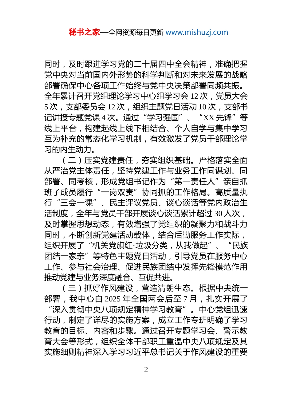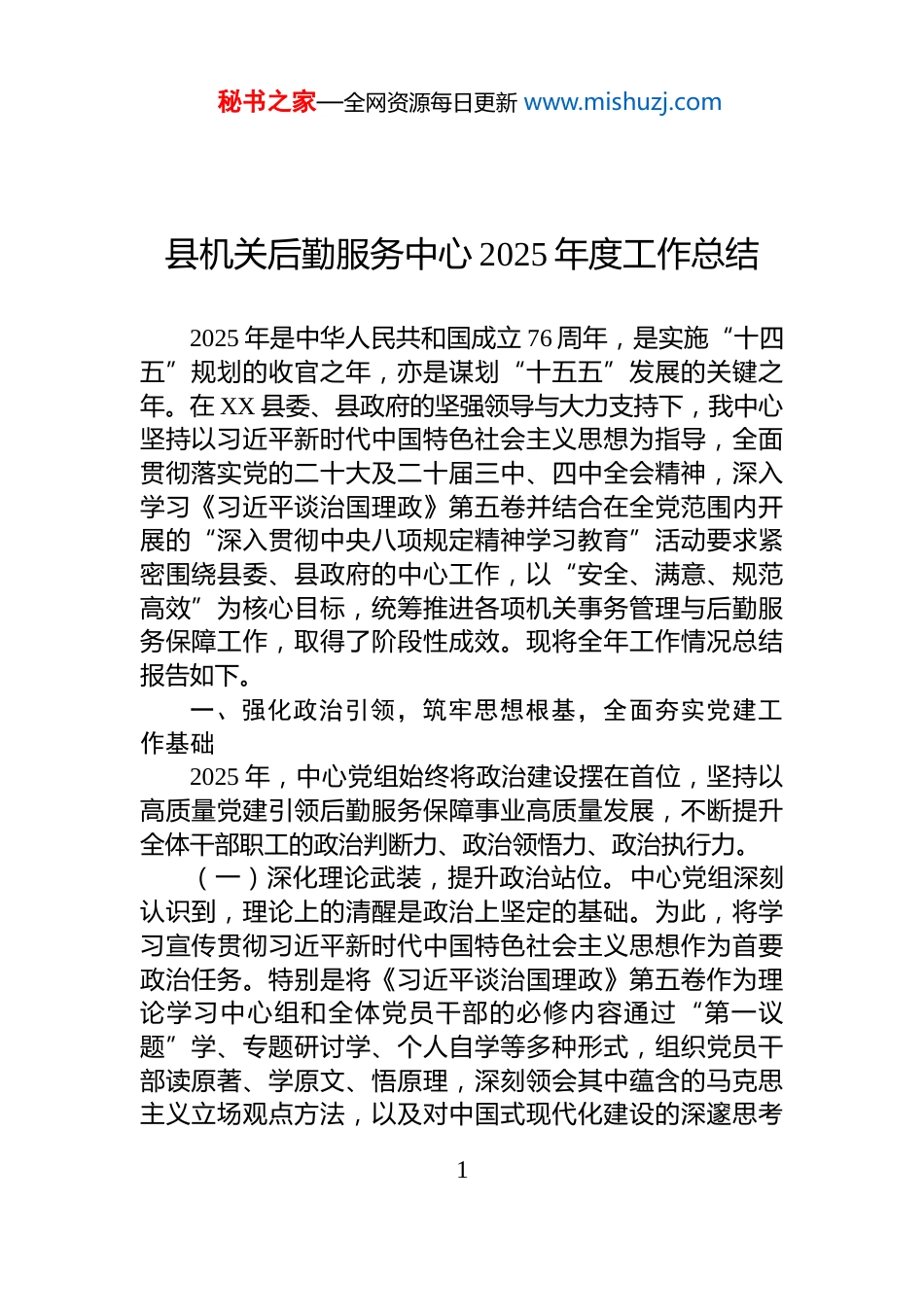 秘书之家—全网资源每日更新 www.mishuzj.com县机关后勤服务中心 2025 年度工作总结2025 年是中华人民共和国成立 76 周年,是实施“十四五”规划的收官之年,亦是谋划“十五五”发展的关键之年。在 XX 县委、县政府的坚强领导与大力支持下,我中心坚持以习近平新时代中国特色社会主义思想为指导,全面贯彻落实党的二十大及二十届三中、四中全会精神,深入学习《习近平谈治国理政》第五卷并结合在全党范围内开展的“深入贯彻中央八项规定精神学习教育”活动要求紧密围绕县委、县政府的中心工作,以“安全、满意、规范高效”为核心目标,统筹推进各项机关事务管理与后勤服务保障工作,取得了阶段性成效。现将全年工作情况总结报告如下。一、强化政治引领,筑牢思想根基,全面夯实党建工作基础2025 年,中心党组始终将政治建设摆在首位,坚持以高质量党建引领后勤服务保障事业高质量发展,不断提升全体干部职工的政治判断力、政治领悟力、政治执行力。(一)深化理论武装,提升政治站位。中心党组深刻认识到,理论上的清醒是政治上坚定的基础。为此,将学习宣传贯彻习近平新时代中国特色社会主义思想作为首要政治任务。特别是将《习近平谈治国理政》第五卷作为理论学习中心组和全体党员干部的必修内容通过“第一议题”学、专题研讨学、个人自学等多种形式,组织党员干部读原著、学原文、悟原理,深刻领会其中蕴含的马克思主义立场观点方法,以及对中国式现代化建设的深邃思考1秘书之家—全网资源每日更新 www.mishuzj.com同时,及时跟进学习党的二十届四中全会精神,准确把握党中央对当前国内外形势的科学判断和对未来发展的战略部署确保中心各项工作始终与党中央决策部署同频共振。全年累计召开党组理论学习中心组学习会 12 次,党员大会5 次,支部委员会 12 次,组织主题党日活动 10 次,支部书记讲授专题党课 4 次。通过“学习强国”、“XX 先锋”等线上平台,构建起线上线下相结合、个人自学与集中学习互为补充的常态化学习机制,有效激发了党员干部理论学习的内生动力。(二)压实党建责任,夯实组织基础。严格落实全面从严治党主体责任,坚持党建工作与业务工作同谋划、同部署、同考核,形成党组书记作为“第一责任人”亲自抓班子成员履行“一岗双责”协同抓的工作格局。高质量执行“三会一课”、民主评议党员、谈心谈话等党内政治生活制度,全年与党员干部开展谈心谈话累计超过 30 人次,及时掌握思想动态,有效增强了党组织的凝聚力和战斗力同时,不断创新党建活动载体,结合后勤服务工作实际,组织开展了“机关党旗红·垃圾分类,从我做起”、“民族团结一家亲”等特色主题党日活动,引导党员在服务中心工作、参与社会治理、促进民族团结中发挥先锋模范作用推动党建与业务深度融合、互促共进。(三)抓好作风建设,营造清朗生态。根据中央统一部署,我中心自 2025 年全国两会后至 7 月,扎实开展了“深入贯彻中央八项规定精神学习教育”。中心党组迅速行动,制定了详尽的实施方案,成立工作专班明确了学习教育的目标、内容和步骤。通过召开专题学习会、警示教育大会等形式,组织全体干部职工重温中央八项规定及其实施细则精神深入学习习近平总书记关于作风建设的重要2秘书之家—全网资源每日更新 www.mishuzj.com论述,并结合近年来查处的违反中央八项规定精神的典型案例进行深刻剖析和警示教育。在此基础上,聚焦“四风”隐形变异新动向,组织全体人员对照检查、自查自纠通过设立意见箱、开展谈心谈话等方式,广泛征求意见,共梳理出在公务接待、公车使用、办公用房、节约办会等方面存在的潜在风险点 6 个,并逐一制定整改措施,明确责任人和完成时限。全年组织召开党风廉政专题学习会 4 次,开展节前集体廉政谈话 8 次。组织党员干部赴 XX 镇 XX 村XX 屯廉洁家风教育基地开展实地教学,以身边事教育身边人,引导干部职工知敬畏、存戒惧、守底线。通过此次学习教育,全体干部职工的纪律规矩意识显著增强,中心内部形成了风清气正、崇廉尚实的良好政治生态。二、聚焦主责主业,提升服务保障效能,全力保障机关高效运转中心始终牢记服...