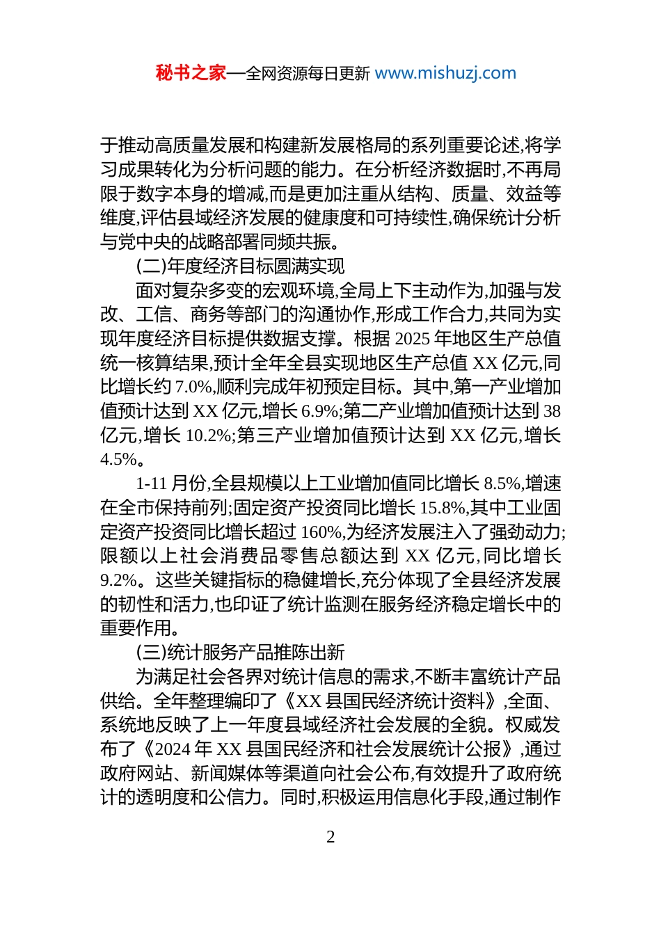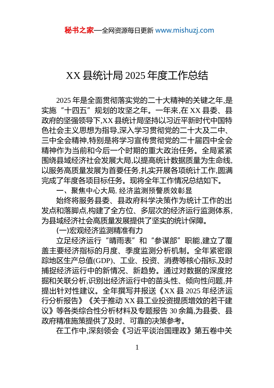 秘书之家—全网资源每日更新 www.mishuzj.comXX 县统计局 2025 年度工作总结2025 年是全面贯彻落实党的二十大精神的关键之年,是实施“十四五”规划的攻坚之年。一年来,在 XX 县委、县政府的坚强领导下,XX 县统计局坚持以习近平新时代中国特色社会主义思想为指导,深入学习贯彻党的二十大及二中、三中全会精神,特别是将学习宣传贯彻党的二十届四中全会精神作为当前和今后一个时期的重大政治任务。全局紧紧围绕县域经济社会发展大局,以提高统计数据质量为生命线,以服务高质量发展为首要任务,扎实开展各项统计工作,圆满完成了年度各项目标任务。现将全年工作情况总结如下。一、聚焦中心大局,经济监测预警质效彰显始终将服务县委、县政府科学决策作为统计工作的出发点和落脚点,构建了全方位、多层次的经济运行监测体系,为县域经济社会高质量发展提供了坚实的统计保障。(一)宏观经济监测精准有力立足经济运行“晴雨表”和“参谋部”职能,建立了覆盖主要经济指标的月度、季度监测分析机制。全年紧密跟踪地区生产总值(GDP)、工业、投资、消费等核心指标,及时捕捉经济运行中的新情况、新趋势。通过对数据的深度挖掘和关联分析,识别出经济运行中的苗头性、倾向性问题,并提出针对性建议。全年撰写并报送《XX 县 2025 年经济运行分析报告》《关于推动 XX 县工业投资提质增效的若干建议》等各类综合性分析材料及专题报告 30 余篇,为县委、县政府精准施策提供了及时、可靠的决策参考。在工作中,深刻领会《习近平谈治国理政》第五卷中关1秘书之家—全网资源每日更新 www.mishuzj.com于推动高质量发展和构建新发展格局的系列重要论述,将学习成果转化为分析问题的能力。在分析经济数据时,不再局限于数字本身的增减,而是更加注重从结构、质量、效益等维度,评估县域经济发展的健康度和可持续性,确保统计分析与党中央的战略部署同频共振。(二)年度经济目标圆满实现面对复杂多变的宏观环境,全局上下主动作为,加强与发改、工信、商务等部门的沟通协作,形成工作合力,共同为实现年度经济目标提供数据支撑。根据 2025 年地区生产总值统一核算结果,预计全年全县实现地区生产总值 XX 亿元,同比增长约 7.0%,顺利完成年初预定目标。其中,第一产业增加值预计达到 XX 亿元,增长 6.9%;第二产业增加值预计达到 38亿元,增长 10.2%;第三产业增加值预计达到 XX 亿元,增长4.5%。1-11 月份,全县规模以上工业增加值同比增长 8.5%,增速在全市保持前列;固定资产投资同比增长 15.8%,其中工业固定资产投资同比增长超过 160%,为经济发展注入了强劲动力;限额以上社会消费品零售总额达到 XX 亿元,同比增长9.2%。这些关键指标的稳健增长,充分体现了全县经济发展的韧性和活力,也印证了统计监测在服务经济稳定增长中的重要作用。(三)统计服务产品推陈出新为满足社会各界对统计信息的需求,不断丰富统计产品供给。全年整理编印了《XX 县国民经济统计资料》,全面、系统地反映了上一年度县域经济社会发展的全貌。权威发布了《2024 年 XX 县国民经济和社会发展统计公报》,通过政府网站、新闻媒体等渠道向社会公布,有效提升了政府统计的透明度和公信力。同时,积极运用信息化手段,通过制作2秘书之家—全网资源每日更新 www.mishuzj.com图文并茂的数据解读、统计图表等新媒体产品,使统计数据更加贴近公众、易于理解。全年累计向上级统计部门报送统计信息 35 篇,为超过 100 个党政机关、企事业单位及社会公众提供了精准的数据查询和咨询服务,统计工作的社会影响力持续扩大。二、夯实数据根基,重大国情国力调查圆满收官重大国情国力调查是和平时期重要的社会总动员,是摸清家底、服务规划的基础性工作。2025 年,全局集中力量,高标准、高质量地完成了多项重大调查任务。(一)第五次全国经济普查后续工作扎实有效进入 2025 年,第五次全国经济普查工作重心由现场登记转向数据审核、汇总和开发应用。上半年,根据“五经普”的核算结果,对 2023 年的常规年报数据进行了系统性比对分析,并依法依规对历史年度的 GDP 等关键数据进行了修订,确保了历史数据的科学性与可比性。这项工作不仅是对过去经济发...