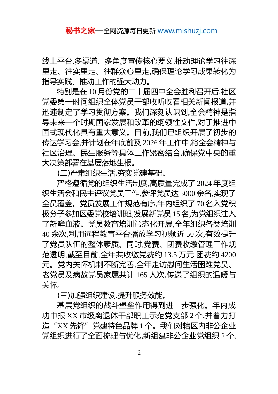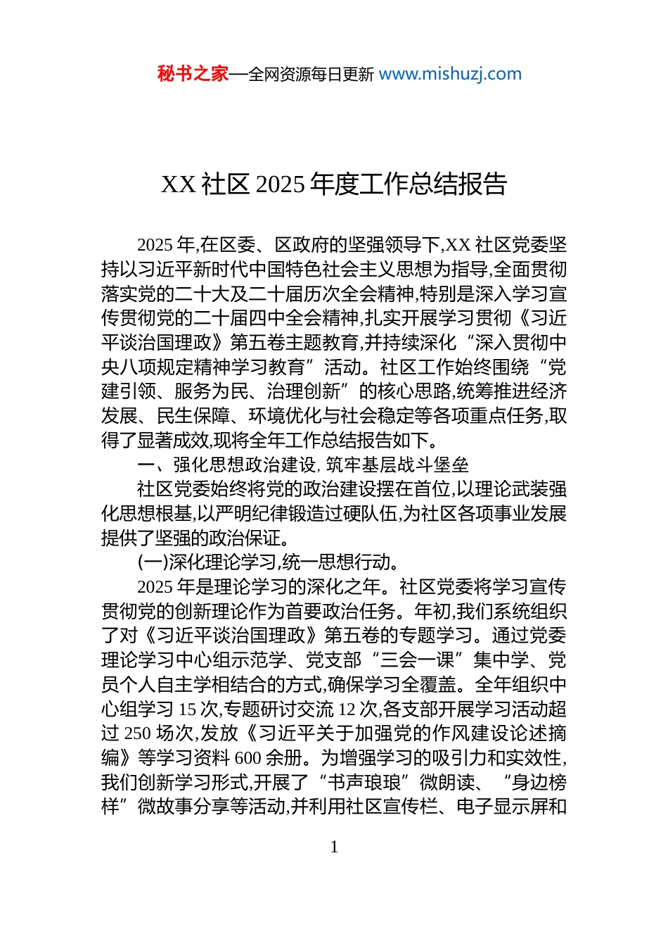 秘书之家—全网资源每日更新 www.mishuzj.comXX 社区 2025 年度工作总结报告2025 年,在区委、区政府的坚强领导下,XX 社区党委坚持以习近平新时代中国特色社会主义思想为指导,全面贯彻落实党的二十大及二十届历次全会精神,特别是深入学习宣传贯彻党的二十届四中全会精神,扎实开展学习贯彻《习近平谈治国理政》第五卷主题教育,并持续深化“深入贯彻中央八项规定精神学习教育”活动。社区工作始终围绕“党建引领、服务为民、治理创新”的核心思路,统筹推进经济发展、民生保障、环境优化与社会稳定等各项重点任务,取得了显著成效,现将全年工作总结报告如下。一、强化思想政治建设,筑牢基层战斗堡垒社区党委始终将党的政治建设摆在首位,以理论武装强化思想根基,以严明纪律锻造过硬队伍,为社区各项事业发展提供了坚强的政治保证。(一)深化理论学习,统一思想行动。2025 年是理论学习的深化之年。社区党委将学习宣传贯彻党的创新理论作为首要政治任务。年初,我们系统组织了对《习近平谈治国理政》第五卷的专题学习。通过党委理论学习中心组示范学、党支部“三会一课”集中学、党员个人自主学相结合的方式,确保学习全覆盖。全年组织中心组学习 15 次,专题研讨交流 12 次,各支部开展学习活动超过 250 场次,发放《习近平关于加强党的作风建设论述摘编》等学习资料 600 余册。为增强学习的吸引力和实效性,我们创新学习形式,开展了“书声琅琅”微朗读、“身边榜样”微故事分享等活动,并利用社区宣传栏、电子显示屏和1秘书之家—全网资源每日更新 www.mishuzj.com线上平台,多渠道、多角度宣传核心要义,推动理论学习往深里走、往实里走、往群众心里走,确保理论学习成果转化为指导实践、推动工作的强大动力。特别是在 10 月份党的二十届四中全会胜利召开后,社区党委第一时间组织全体党员干部收听收看相关新闻报道,并迅速制定了学习贯彻方案。我们深刻认识到,全会精神是指导未来一个时期国家发展和改革的纲领性文件,对于推进中国式现代化具有重大意义。目前,我们已组织开展了初步的传达学习会,并计划在年底前及 2026 年工作中,将全会精神与社区治理、民生服务等具体工作紧密结合,确保党中央的重大决策部署在基层落地生根。(二)严肃组织生活,夯实党建基础。严格遵循党的组织生活制度,高质量完成了 2024 年度组织生活会和民主评议党员工作,参评党员达 3000 余名,实现了全员覆盖。党员发展工作规范有序,年内组织了 70 名入党积极分子参加区委党校培训班,发展新党员 15 名,为党组织注入了新鲜血液。党员教育培训常态化开展,全年组织各类培训40 余次,利用远程教育平台播放学习视频近 50 次,有效提升了党员队伍的整体素质。同时,党费、团费收缴管理工作规范透明,截至目前,全年共收缴党费约 13.5 万元,团费约 4200元。党内关怀机制不断完善,全年走访慰问生活困难党员、老党员及病故党员家属共计 165 人次,传递了组织的温暖与关怀。(三)加强组织建设,提升服务效能。基层党组织的战斗堡垒作用得到进一步强化。年内成功申报 XX 市级离退休干部职工示范党支部 2 个,并着力打造“XX 先锋”党建特色品牌 1 个。我们对辖区内非公企业党组织进行了全面梳理与优化,新组建非公企业党组织 2 个,2秘书之家—全网资源每日更新 www.mishuzj.com撤销不合格党组织 7 个,调整了 59 家企业的党组织关系,扩大了党在“两新”组织中的覆盖面和影响力。同时,我们持续推进小区党群服务站建设,新建成 2 个,使总数达到 14 个,并按照标准化要求配备了便民设施,将其打造成为服务党员群众、化解基层矛盾的“红色前哨”。(四)狠抓作风建设,营造清风正气。深入贯彻中央八项规定精神学习教育,是今年党风廉政建设的重中之重。社区党委严格落实主体责任,通过召开专题警示教育大会、组织观看警示教育片、通报典型案例等方式,教育引导全体党员干部知敬畏、存戒惧、守底线。坚持对各部门负责人进行常态化集体约谈和廉政谈话,及时发现并纠正苗头性、倾向性问题。依托“小微权力一点通”监督平台,全年发布各类公示信息超过 5000 条,推送民生资金使用、项目建设等典型案例 25 件,主动接...