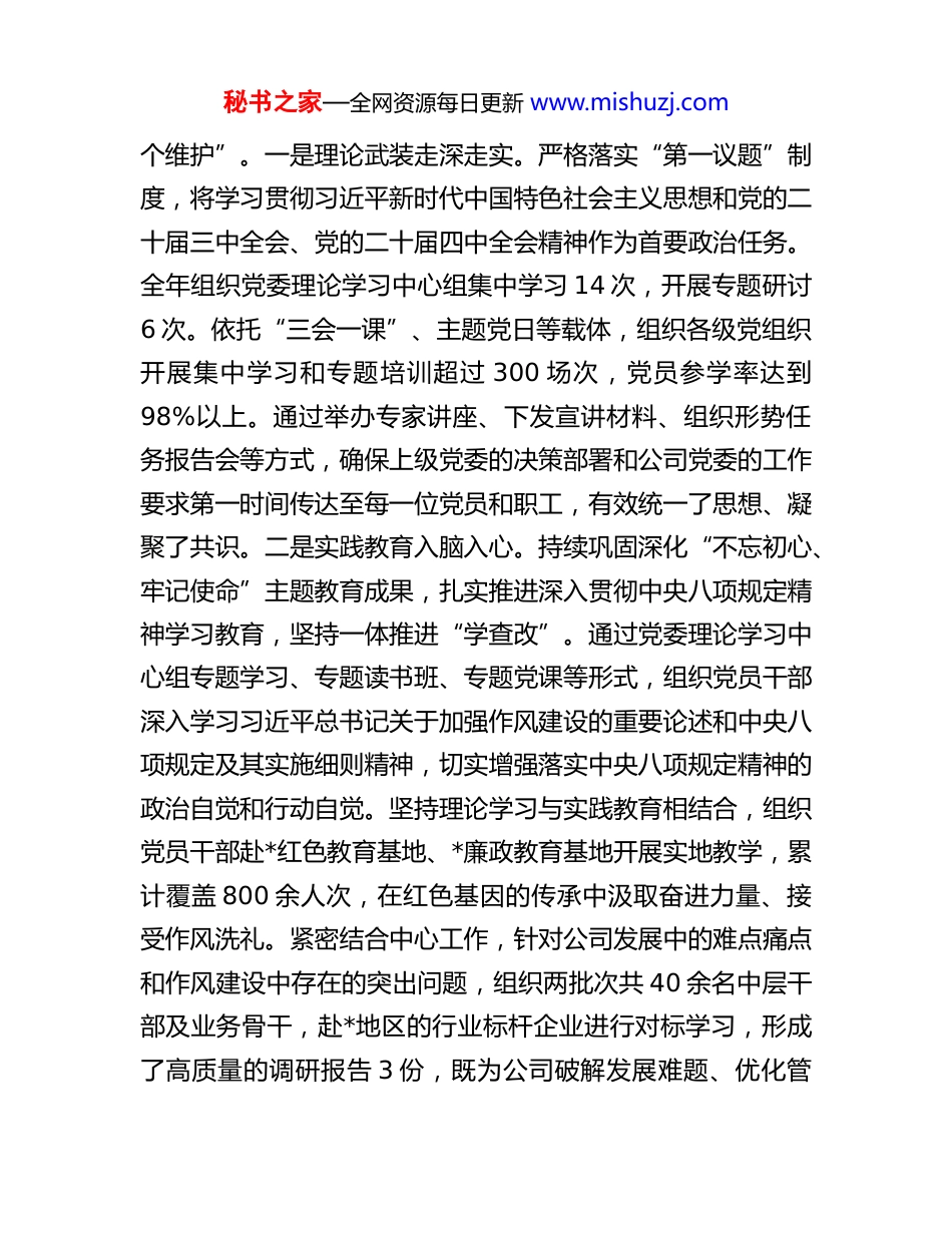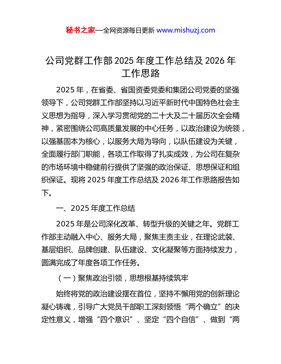 秘书之家—全网资源每日更新 www.mishuzj.com公司党群工作部 2025 年度工作总结及 2026 年工作思路2025 年,在省委、省国资委党委和集团公司党委的坚强领导下,公司党群工作部坚持以习近平新时代中国特色社会主义思想为指导,深入学习贯彻党的二十大及二十届历次全会精神,紧密围绕公司高质量发展的中心任务,以政治建设为统领,以强基固本为核心,以服务大局为导向,以队伍建设为关键,全面履行部门职能,各项工作取得了扎实成效,为公司在复杂的市场环境中稳健前行提供了坚强的政治保证、思想保证和组织保证。现将 2025 年度工作总结及 2026 年工作思路报告如下。一、2025 年度工作总结2025 年是公司深化改革、转型升级的关键之年。党群工作部主动融入中心、服务大局,聚焦主责主业,在理论武装、基层组织、品牌创建、队伍建设、文化凝聚等方面持续发力,圆满完成了年度各项工作任务。(一)聚焦政治引领,思想根基持续筑牢始终将党的政治建设摆在首位,坚持不懈用党的创新理论凝心铸魂,引导广大党员干部职工深刻领悟“两个确立”的决定性意义,增强“四个意识”、坚定“四个自信”、做到“两秘书之家—全网资源每日更新 www.mishuzj.com个维护”。一是理论武装走深走实。严格落实“第一议题”制度,将学习贯彻习近平新时代中国特色社会主义思想和党的二十届三中全会、党的二十届四中全会精神作为首要政治任务。全年组织党委理论学习中心组集中学习 14 次,开展专题研讨6 次。依托“三会一课”、主题党日等载体,组织各级党组织开展集中学习和专题培训超过 300 场次,党员参学率达到98%以上。通过举办专家讲座、下发宣讲材料、组织形势任务报告会等方式,确保上级党委的决策部署和公司党委的工作要求第一时间传达至每一位党员和职工,有效统一了思想、凝聚了共识。二是实践教育入脑入心。持续巩固深化“不忘初心、牢记使命”主题教育成果,扎实推进深入贯彻中央八项规定精神学习教育,坚持一体推进“学查改”。通过党委理论学习中心组专题学习、专题读书班、专题党课等形式,组织党员干部深入学习习近平总书记关于加强作风建设的重要论述和中央八项规定及其实施细则精神,切实增强落实中央八项规定精神的政治自觉和行动自觉。坚持理论学习与实践教育相结合,组织党员干部赴*红色教育基地、*廉政教育基地开展实地教学,累计覆盖 800 余人次,在红色基因的传承中汲取奋进力量、接受作风洗礼。紧密结合中心工作,针对公司发展中的难点痛点和作风建设中存在的突出问题,组织两批次共 40 余名中层干部及业务骨干,赴*地区的行业标杆企业进行对标学习,形成了高质量的调研报告 3 份,既为公司破解发展难题、优化管秘书之家—全网资源每日更新 www.mishuzj.com理模式提供了有益借鉴,又推动党员干部在实践中转作风、树形象,将学习教育成果转化为推动高质量发展的实际成效。三是宣传引导凝聚共识。充分利用公司官网、微信公众号、内部刊物等宣传阵地,构建了全方位、多层次、立体化的宣传矩阵。全年发布各类新闻稿件 500 余篇,其中在省级以上主流媒体刊发 20 余篇。围绕公司年度重点项目“*项目”和“*技术改造工程”,开展系列深度报道,生动讲述一线故事,有效激发了全体职工投身公司发展的积极性和自豪感。(二)聚焦强基提质,组织堡垒坚强有力坚持大抓基层的鲜明导向,以提升组织力为重点,推动基层党组织全面进步、全面过硬,使每个支部都成为坚强战斗堡垒。一是基层党支部建设全面过硬。深入贯彻《中国共产党支部工作条例(试行)》,全面推进党支部标准化规范化建设。年初对全部 35 个基层党支部进行了一次全面“体检”,针对发现的 3 个“软弱涣散”党支部,制定“一支部一策”整改方案,由党委委员挂点联系,通过选优配强支部书记、优化组织设置、加大资源倾斜等方式,于第三季度末全部完成整改,实现晋位升级。目前,公司“先进”等级党支部占比达到60%,“合格”等级占比 40%,全面消除了“后进”党支部。二是党员队伍管理精细高效。以打造“政治素质好、岗位技能优、先锋作用强”的党员队伍为目标,严格党员发展程序,全年共发展新党...