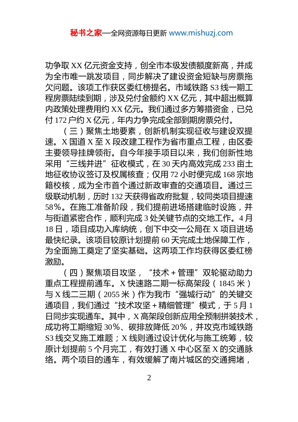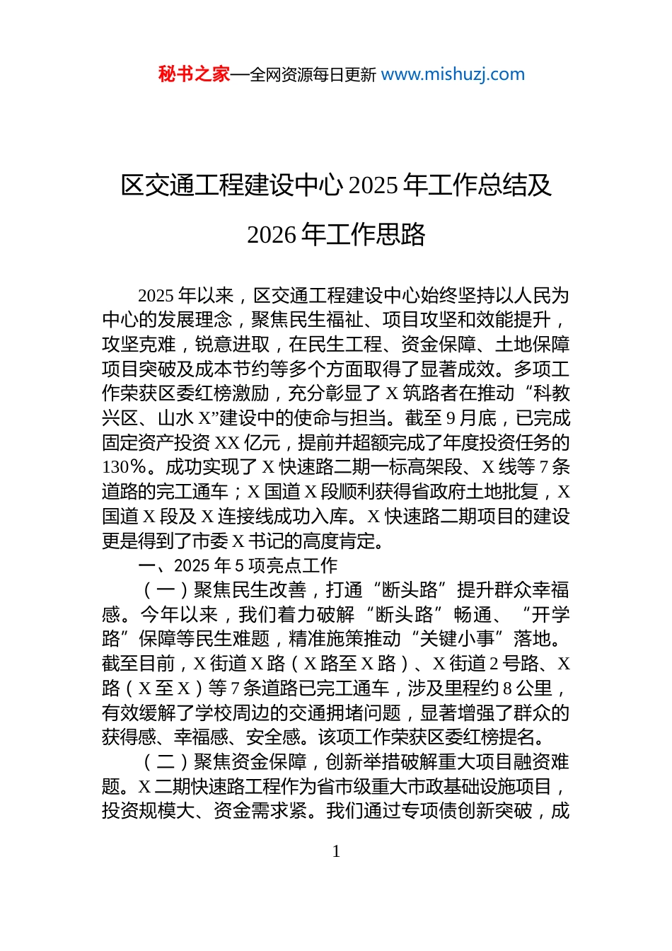 秘书之家—全网资源每日更新 www.mishuzj.com区交通工程建设中心 2025 年工作总结及2026 年工作思路2025 年以来,区交通工程建设中心始终坚持以人民为中心的发展理念,聚焦民生福祉、项目攻坚和效能提升,攻坚克难,锐意进取,在民生工程、资金保障、土地保障项目突破及成本节约等多个方面取得了显著成效。多项工作荣获区委红榜激励,充分彰显了 X 筑路者在推动“科教兴区、山水 X”建设中的使命与担当。截至 9 月底,已完成固定资产投资 XX 亿元,提前并超额完成了年度投资任务的130%。成功实现了 X 快速路二期一标高架段、X 线等 7 条道路的完工通车;X 国道 X 段顺利获得省政府土地批复,X国道 X 段及 X 连接线成功入库。X 快速路二期项目的建设更是得到了市委 X 书记的高度肯定。一、2025 年 5 项亮点工作(一)聚焦民生改善,打通“断头路”提升群众幸福感。今年以来,我们着力破解“断头路”畅通、“开学路”保障等民生难题,精准施策推动“关键小事”落地。截至目前,X 街道 X 路(X 路至 X 路)、X 街道 2 号路、X路(X 至 X)等 7 条道路已完工通车,涉及里程约 8 公里,有效缓解了学校周边的交通拥堵问题,显著增强了群众的获得感、幸福感、安全感。该项工作荣获区委红榜提名。(二)聚焦资金保障,创新举措破解重大项目融资难题。X 二期快速路工程作为省市级重大市政基础设施项目,投资规模大、资金需求紧。我们通过专项债创新突破,成1秘书之家—全网资源每日更新 www.mishuzj.com功争取 XX 亿元资金支持,创全市本级发债额度新高,并成为全市唯一跳发项目,同步解决了建设资金短缺与房票拖欠问题。该项工作获区委红榜提名。市域铁路 S3 线一期工程房票陆续到期,涉及兑付金额约 XX 亿元,其中超出概算内政策处理费用约 XX 亿元。我们通过多方筹措资金,已兑付 172 户约 X 亿元,年内力争完成全部到期房票兑付。(三)聚焦土地要素,创新机制实现征收与建设双提速。X 国道 X 至 X 段改建工程作为省市重点工程,由区委主要领导挂牌领衔。自今年接手项目以来,我们创新性地采用“三线并进”征收模式,在 30 天内高效完成 233 亩土地征收协议签订及权属核查;仅用 72 小时便完成 168 宗地籍校核,成为全市首个通过新政审查的交通项目。通过三级联动机制,历时 132 天获得省政府批复,较同类项目提速58%。在施工准备阶段,我们提前进场搭建临时设施,并与街道紧密合作,顺利完成 3 处关键节点的交地工作。4 月18 日,项目成功入库纳统,创下中交一公局在 X 项目进场最快纪录。该项目较原计划提前 60 天完成土地保障工作,为全面施工奠定了坚实基础。这两项工作均获得区委红榜激励。(四)聚焦项目攻坚,“技术+管理”双轮驱动助力重点工程提前通车。X 快速路二期一标高架段(1845 米)与 X 线二三期(2055 米)作为我市“强城行动”的关键交通项目,我们通过“技术攻坚+精细管理”模式,于 5 月 1日同步实现通车。其中,X 高架段创新应用全预制拼装技术,成功将工期缩短 30%、碳排放降低 20%,并攻克市域铁路S3 线交叉施工难题;X 线则通过设计优化与施工统筹,较原计划提前 5 个月完工,有效打通 X 中心区至 X 的交通脉络。两个项目的通车,有效缓解了南片城区的交通拥堵,2秘书之家—全网资源每日更新 www.mishuzj.com形成了可复制的成功经验,充分展现了基础设施建设“又快又好”的示范效应。该两项工作均荣获区委红榜激励。(五)聚焦成本管控,实现集约化高效利用,释放交通社会效益。通过实施项目捆绑机制,将 X 线三角地公园工程(总投资 XX 万元、占地 6500 平方米)纳入南环线 X隧道工程,将 X 市 X 小学 X 校区新东路工程(总投资约XX 万元、占地 1755 平方米)纳入霞北路工程,从而减少项目立项、初设、招标等流程,有效缩短前期工作时间。同时,采用以大带小模式优化资金配置,通过共享施工资源、优化采购渠道、统筹施工工序,实现资金集约化使用加速民生项目落地。针对南环线 X 隧道两侧连接线工程进度滞后的情况,担当作为...