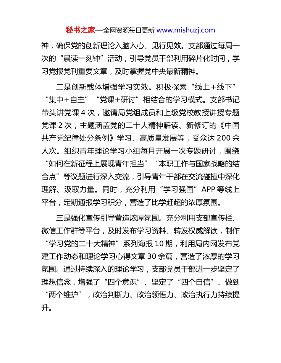 秘书之家—全网资源每日更新 www.mishuzj.com局支部书记 2025 年抓基层党建工作述职材料2025 年,在局党组的坚强领导下,本人作为党支部书记,始终坚持以习近平新时代中国特色社会主义思想为指导,全面贯彻落实党的二十大精神和习近平总书记关于加强基层党建的重要论述,紧紧围绕“健全全面从严治党体系,增强党组织政治功能和组织功能”的总体要求,聚焦主责主业,强化担当作为,带领支部全体党员干部凝心聚力、攻坚克难,推动基层党建工作取得新进展新成效,为局各项事业高质量发展提供了坚强政治保证和组织保障。现将 2025 年度抓基层党建工作情况述职如下:一、主要做法一年来,支部深入贯彻落实新时代党的建设总要求,将政治建设摆在首位,紧密结合局业务工作实际,创新思路、真抓实干,切实增强了党组织的政治功能和组织功能。(一)突出思想引领,筑牢理论根基。一是坚持不懈强化理论武装。严格落实“第一议题”制度全年组织支部理论学习中心组学习 12 次,支部党员大会集中学习 24 次,深入学习领会《习近平著作选读》第一卷、第二卷和《习近平新时代中国特色社会主义思想专题摘编》等重要文献,及时跟进学习习近平总书记最新重要讲话和指示批示精秘书之家—全网资源每日更新 www.mishuzj.com神,确保党的创新理论入脑入心、见行见效。支部通过每周一次的“晨读一刻钟”活动,引导党员干部利用碎片化时间,学习党报党刊重要文章,及时掌握党中央最新精神。二是创新载体增强学习实效。积极探索“线上+线下”“集中+自主”“党课+研讨”相结合的学习模式。支部书记带头讲党课 4 次,邀请局党组成员和上级党校教授讲授专题党课 2 次,主题涵盖党的二十大精神解读、新修订的《中国共产党纪律处分条例》学习、高质量发展等,受众达 200 余人次。组织青年理论学习小组每月开展一次专题研讨,围绕“如何在新征程上展现青年担当”“本职工作与国家战略的结合点”等议题进行深入交流,引导青年干部在交流碰撞中深化理解、汲取力量。同时,充分利用“学习强国”APP 等线上平台,定期通报学习积分,营造了比学赶超的浓厚氛围。三是强化宣传引导营造浓厚氛围。充分利用支部宣传栏、微信工作群等平台,及时发布学习资料、转发权威解读,制作“学习党的二十大精神”系列海报 10 期,利用局内网发布党建工作动态和理论学习心得文章 30 余篇,营造了浓厚的学习氛围。通过持续深入的理论学习,支部党员干部进一步坚定了理想信念,增强了“四个意识”、坚定了“四个自信”、做到“两个维护”,政治判断力、政治领悟力、政治执行力持续提升。秘书之家—全网资源每日更新 www.mishuzj.com(二)建强组织体系,锻造过硬队伍。一是严格规范党内政治生活。严格执行“三会一课”、主题党日、组织生活会、民主评议党员等基本制度。高质量召开组织生活会 1 次,开展民主评议党员,支部班子成员和党员干部开诚布公、坦诚相见,认真开展批评与自我批评,达到了“红脸出汗、排毒治病”的效果。全年开展主题党日活动 12次,内容丰富、形式多样,如组织全体党员参观红色教育基地2 次,观看爱国主义影片 3 部,重温入党誓词,开展“我为群众办实事”志愿服务活动 5 次,进一步增强了党性观念和组织纪律性。二是加强党员队伍教育管理。坚持把党员教育融入日常、抓在经常,通过线上学习平台、支部微信群等及时推送学习资料,引导党员利用碎片化时间进行自学。严格按照“控制总量、优化结构、提高质量、发挥作用”的总要求,加强对入党积极分子的培养考察,全年发展党员 2 名,培养入党积极分子 3名,党员队伍的结构持续优化、素质不断提高,为支部注入了新鲜血液。加强党员关怀激励,党支部班子成员定期开展谈心谈话,全年覆盖党员 25 人次,了解党员思想动态和工作生活情况,对生活困难党员进行帮扶慰问 2 人次,发放慰问金3000 元。积极推选优秀党员,组织开展“党员先锋岗”“业务骨干示范岗”创建活动,激励党员在岗位上亮身份、作表率。秘书之家—全网资源每日更新 www.mishuzj.com三是健全组织体系提升组织力。严格执行《中国共产党支部工作条例(试行)》,结...