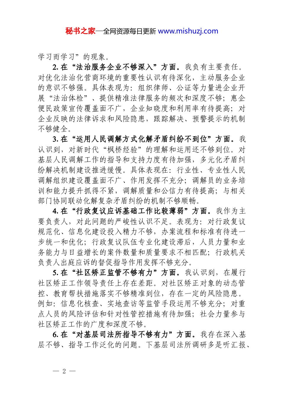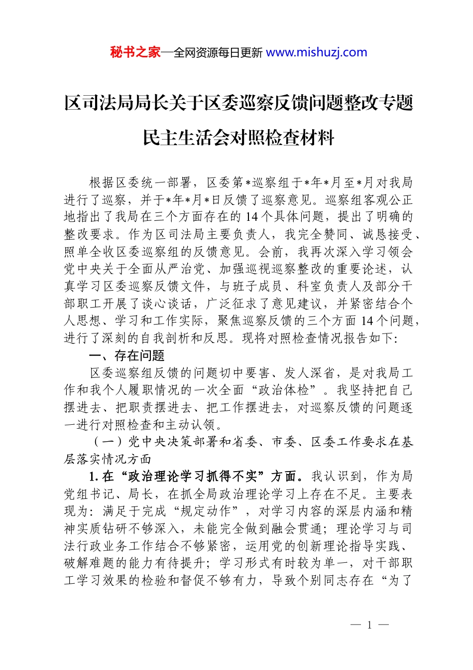秘书之家—全网资源每日更新 www.mishuzj.com区司法局局长关于区委巡察反馈问题整改专题民主生活会对照检查材料根据区委统一部署,区委第*巡察组于*年*月至*月对我局进行了巡察,并于*年*月*日反馈了巡察意见。巡察组客观公正地指出了我局在三个方面存在的 14 个具体问题,提出了明确的整改要求。作为区司法局主要负责人,我完全赞同、诚恳接受、照单全收区委巡察组的反馈意见。会前,我再次深入学习领会党中央关于全面从严治党、加强巡视巡察整改的重要论述,认真学习区委巡察反馈文件,与班子成员、科室负责人及部分干部职工开展了谈心谈话,广泛征求了意见建议,并紧密结合个人思想、学习和工作实际,聚焦巡察反馈的三个方面 14 个问题,进行了深刻的自我剖析和反思。现将对照检查情况报告如下:一、存在问题区委巡察组反馈的问题切中要害、发人深省,是对我局工作和我个人履职情况的一次全面“政治体检”。我坚持把自己摆进去、把职责摆进去、把工作摆进去,对巡察反馈的问题逐一进行对照检查和主动认领。(一)党中央决策部署和省委、市委、区委工作要求在基层落实情况方面1.在“政治理论学习抓得不实”方面。我认识到,作为局党组书记、局长,在抓全局政治理论学习上存在不足。主要表现为:满足于完成“规定动作”,对学习内容的深层内涵和精神实质钻研不够深入,未能完全做到融会贯通;理论学习与司法行政业务工作结合不够紧密,运用党的创新理论指导实践、破解难题的能力有待提升;学习形式有时较为单一,对干部职工学习效果的检验和督促不够有力,导致个别同志存在“为了— 1 —秘书之家—全网资源每日更新 www.mishuzj.com学习而学习”的现象。2.在“法治服务企业不够深入”方面。我负有主要责任。对优化法治化营商环境的重要性认识有待深化,主动服务企业的意识不够强。具体表现为:组织律师、公证等力量进企业开展“法治体检”、提供精准法律服务的频次和深度不够;惠企便民政策宣传覆盖面不广,企业知晓度和利用率有待提高;对企业反映的法律诉求和风险隐患,跟踪解决、预警提示的机制不够健全。3.在“运用人民调解方式化解矛盾纠纷不到位”方面。我认识到,对新时代“枫桥经验”的理解和运用还不够到位。对基层人民调解工作的指导和支持力度有待加强,多元化矛盾纠纷解决机制建设推进缓慢。具体表现在:行业性、专业性人民调解组织建设覆盖面不广、作用发挥不充分;调解员的业务培训和能力提升抓得不紧,调解质量和公信力有待提高;与相关部门协同联动化解复杂矛盾纠纷的机制不够顺畅。4.在“行政复议应诉基础工作比较薄弱”方面。我作为主要负责人,对此问题的严峻性认识不足。表现为:对行政复议规范化、信息化建设投入精力不够,办案流程和标准有待进一步统一和优化;行政复议队伍专业化建设滞后,人员力量和业务能力与日益增长的案件数量和质量要求不相匹配;行政机关负责人出庭应诉的督促指导作用发挥不够充分。5.在“社区矫正监管不够有力”方面。我认识到,在履行社区矫正工作领导责任上存在差距。对社区矫正对象的动态管控、教育帮扶措施落实不够精准到位,存在一定的风险隐患。例如:信息化核查、实地查访等监管手段运用不够充分;对重点人员的风险评估和针对性管控措施有待加强;社会力量参与社区矫正工作的广度和深度不够。6.在“对基层司法所指导不够有力”方面。我存在深入基层不够、指导工作泛化的问题。下基层司法所调研多是听汇报、— 2 —秘书之家—全网资源每日更新 www.mishuzj.com看材料,帮助解决实际困难和问题较少;对司法所业务工作的分类指导、精准施策不够,未能充分调动各司法所的积极性和创造性;在推动司法所规范化建设、提升履职能力方面,思路和办法不多。7.在“意识形态工作责任制落实不到位”方面。我作为第一责任人,对意识形态工作的极端重要性认识需要再深化。对全局意识形态领域的分析研判不够经常,风险排查不够全面;对网络意识形态阵地的管理、舆论引导的能力有待加强;将意识形态工作要求融入业务工作各方面、全过程做得不够。8.在“保密工作落实不到位”方面。我存在麻痹思想和侥幸心理。对保密工作的宣传教育...