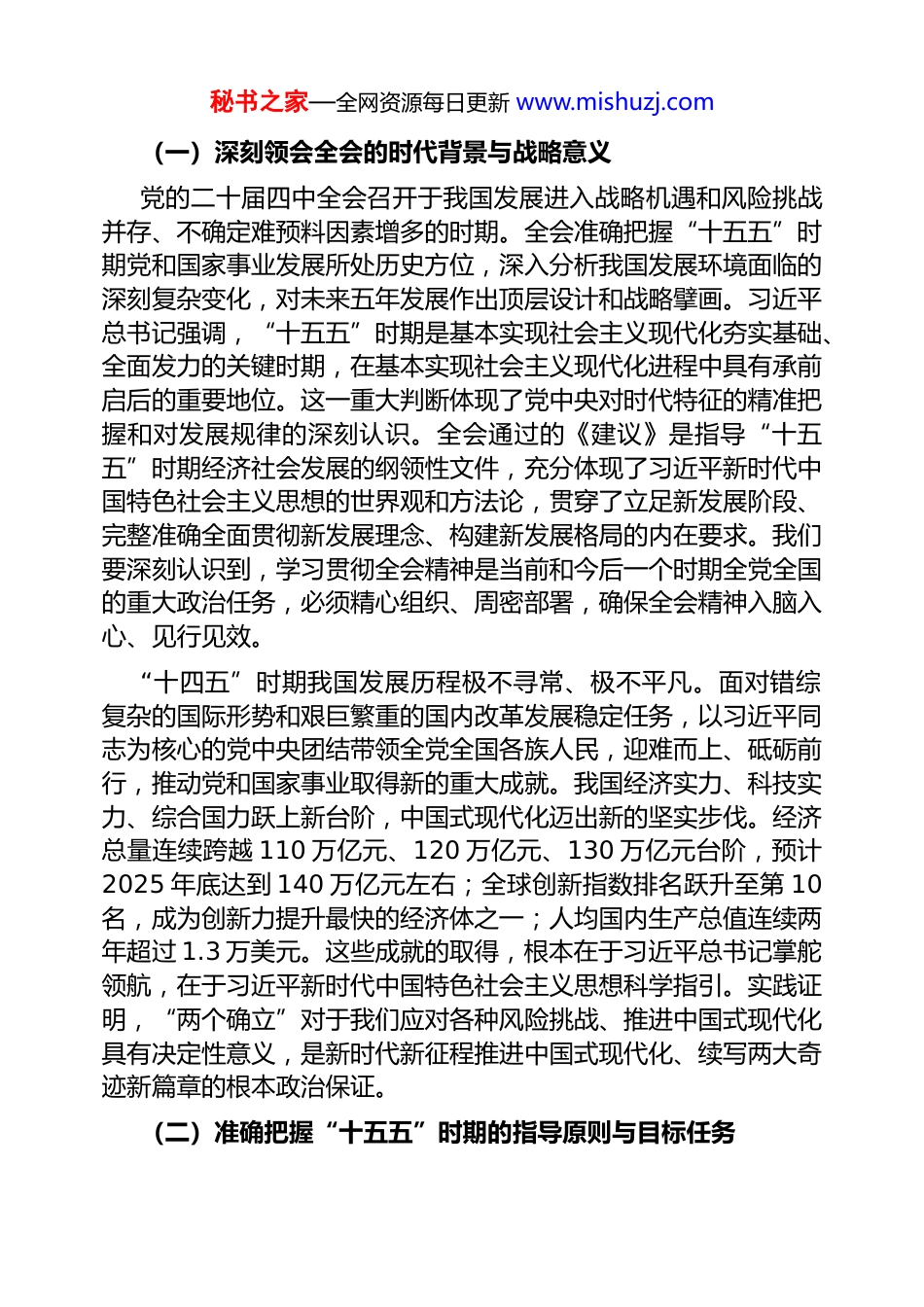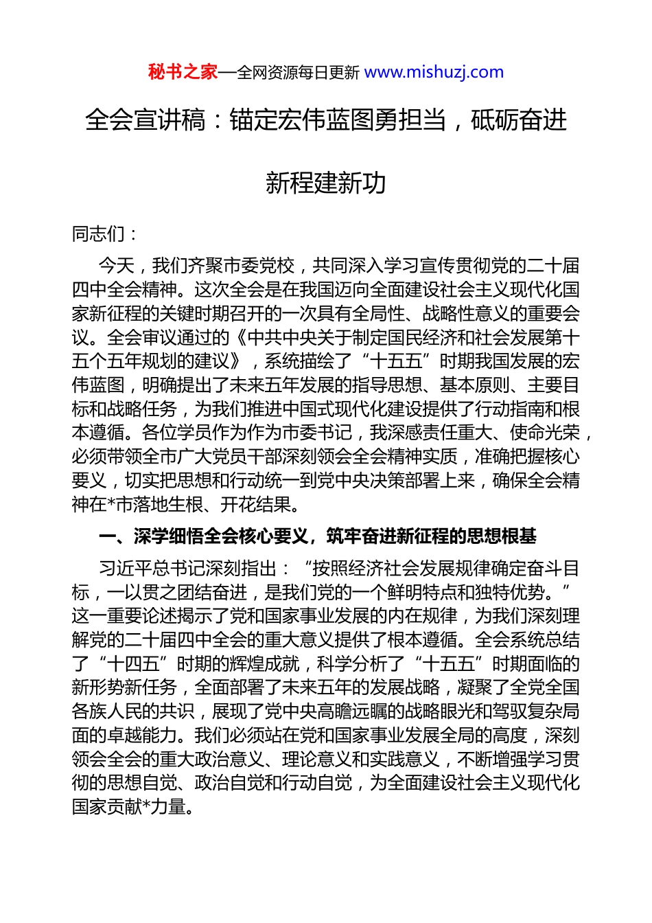 秘书之家—全网资源每日更新 www.mishuzj.com全会宣讲稿:锚定宏伟蓝图勇担当,砥砺奋进新程建新功同志们:今天,我们齐聚市委党校,共同深入学习宣传贯彻党的二十届四中全会精神。这次全会是在我国迈向全面建设社会主义现代化国家新征程的关键时期召开的一次具有全局性、战略性意义的重要会议。全会审议通过的《中共中央关于制定国民经济和社会发展第十五个五年规划的建议》,系统描绘了“十五五”时期我国发展的宏伟蓝图,明确提出了未来五年发展的指导思想、基本原则、主要目标和战略任务,为我们推进中国式现代化建设提供了行动指南和根本遵循。各位学员作为作为市委书记,我深感责任重大、使命光荣,必须带领全市广大党员干部深刻领会全会精神实质,准确把握核心要义,切实把思想和行动统一到党中央决策部署上来,确保全会精神在*市落地生根、开花结果。一、深学细悟全会核心要义,筑牢奋进新征程的思想根基习近平总书记深刻指出:“按照经济社会发展规律确定奋斗目标,一以贯之团结奋进,是我们党的一个鲜明特点和独特优势。”这一重要论述揭示了党和国家事业发展的内在规律,为我们深刻理解党的二十届四中全会的重大意义提供了根本遵循。全会系统总结了“十四五”时期的辉煌成就,科学分析了“十五五”时期面临的新形势新任务,全面部署了未来五年的发展战略,凝聚了全党全国各族人民的共识,展现了党中央高瞻远瞩的战略眼光和驾驭复杂局面的卓越能力。我们必须站在党和国家事业发展全局的高度,深刻领会全会的重大政治意义、理论意义和实践意义,不断增强学习贯彻的思想自觉、政治自觉和行动自觉,为全面建设社会主义现代化国家贡献*力量。秘书之家—全网资源每日更新 www.mishuzj.com(一)深刻领会全会的时代背景与战略意义党的二十届四中全会召开于我国发展进入战略机遇和风险挑战并存、不确定难预料因素增多的时期。全会准确把握“十五五”时期党和国家事业发展所处历史方位,深入分析我国发展环境面临的深刻复杂变化,对未来五年发展作出顶层设计和战略擘画。习近平总书记强调,“十五五”时期是基本实现社会主义现代化夯实基础、全面发力的关键时期,在基本实现社会主义现代化进程中具有承前启后的重要地位。这一重大判断体现了党中央对时代特征的精准把握和对发展规律的深刻认识。全会通过的《建议》是指导“十五五”时期经济社会发展的纲领性文件,充分体现了习近平新时代中国特色社会主义思想的世界观和方法论,贯穿了立足新发展阶段、完整准确全面贯彻新发展理念、构建新发展格局的内在要求。我们要深刻认识到,学习贯彻全会精神是当前和今后一个时期全党全国的重大政治任务,必须精心组织、周密部署,确保全会精神入脑入心、见行见效。“十四五”时期我国发展历程极不寻常、极不平凡。面对错综复杂的国际形势和艰巨繁重的国内改革发展稳定任务,以习近平同志为核心的党中央团结带领全党全国各族人民,迎难而上、砥砺前行,推动党和国家事业取得新的重大成就。我国经济实力、科技实力、综合国力跃上新台阶,中国式现代化迈出新的坚实步伐。经济总量连续跨越 110 万亿元、120 万亿元、130 万亿元台阶,预计2025 年底达到 140 万亿元左右;全球创新指数排名跃升至第 10名,成为创新力提升最快的经济体之一;人均国内生产总值连续两年超过 1.3 万美元。这些成就的取得,根本在于习近平总书记掌舵领航,在于习近平新时代中国特色社会主义思想科学指引。实践证明,“两个确立”对于我们应对各种风险挑战、推进中国式现代化具有决定性意义,是新时代新征程推进中国式现代化、续写两大奇迹新篇章的根本政治保证。(二)准确把握“十五五”时期的指导原则与目标任务秘书之家—全网资源每日更新 www.mishuzj.com“十五五”时期经济社会发展必须坚持马克思列宁主义、毛泽东思想、邓小平理论、“三个代表”重要思想、科学发展观,全面贯彻习近平新时代中国特色社会主义思想,深入贯彻党的二十大和二十届历次全会精神。全会提出的“五个以”“两个推动”“一个确保”要求,构成了有机统一的整体,明确了“十五五”时期经济社会发展的指导思想。“五个以”即坚持...