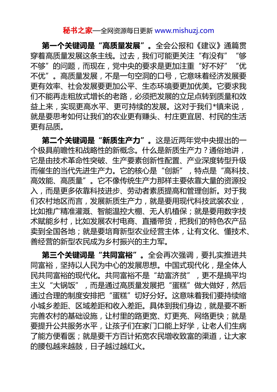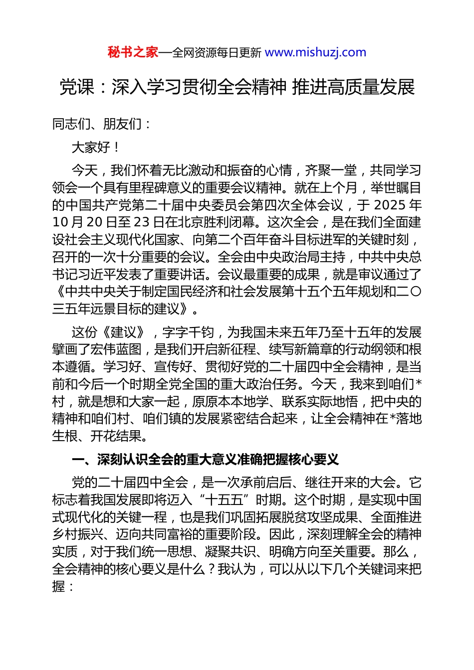秘书之家—全网资源每日更新 www.mishuzj.com党课:深入学习贯彻全会精神 推进高质量发展同志们、朋友们:大家好!今天,我们怀着无比激动和振奋的心情,齐聚一堂,共同学习领会一个具有里程碑意义的重要会议精神。就在上个月,举世瞩目的中国共产党第二十届中央委员会第四次全体会议,于 2025 年10 月 20 日至 23 日在北京胜利闭幕。这次全会,是在我们全面建设社会主义现代化国家、向第二个百年奋斗目标进军的关键时刻,召开的一次十分重要的会议。全会由中央政治局主持,中共中央总书记习近平发表了重要讲话。会议最重要的成果,就是审议通过了《中共中央关于制定国民经济和社会发展第十五个五年规划和二〇三五年远景目标的建议》。这份《建议》,字字千钧,为我国未来五年乃至十五年的发展擘画了宏伟蓝图,是我们开启新征程、续写新篇章的行动纲领和根本遵循。学习好、宣传好、贯彻好党的二十届四中全会精神,是当前和今后一个时期全党全国的重大政治任务。今天,我来到咱们*村,就是想和大家一起,原原本本地学、联系实际地悟,把中央的精神和咱们村、咱们镇的发展紧密结合起来,让全会精神在*落地生根、开花结果。一、深刻认识全会的重大意义准确把握核心要义党的二十届四中全会,是一次承前启后、继往开来的大会。它标志着我国发展即将迈入“十五五”时期。这个时期,是实现中国式现代化的关键一程,也是我们巩固拓展脱贫攻坚成果、全面推进乡村振兴、迈向共同富裕的重要阶段。因此,深刻理解全会的精神实质,对于我们统一思想、凝聚共识、明确方向至关重要。那么,全会精神的核心要义是什么?我认为,可以从以下几个关键词来把握:秘书之家—全网资源每日更新 www.mishuzj.com第一个关键词是“高质量发展”。全会公报和《建议》通篇贯穿着高质量发展这条主线。过去,我们可能更关注“有没有”“够不够”的问题,而现在,党中央的要求是更加注重“好不好”“优不优”。高质量发展,不是一句空洞的口号,它意味着经济发展要更有效率、社会发展要更加公平、生态环境要更加优美。它要求我们不能再走粗放式增长的老路,必须把发展的立足点转到质量和效益上来,实现更高水平、更可持续的发展。这对于我们*镇来说,就是要思考如何让我们的农业更有赚头、村庄更宜居、村民的生活更有品质。第二个关键词是“新质生产力”。这是近两年党中央提出的一个极具前瞻性和战略性的新概念。什么是新质生产力?通俗地讲,它是由技术革命性突破、生产要素创新性配置、产业深度转型升级而催生的当代先进生产力。它的核心是“创新”,特点是“高科技、高效能、高质量”。它不像传统生产力那样主要依靠大量的资源投入,而是更多依靠科技进步、劳动者素质提高和管理创新。对于我们农村地区而言,发展新质生产力,就是要用现代科技武装农业,比如推广精准灌溉、智能温控大棚、无人机植保;就是要用数字技术赋能乡村,比如发展农村电商、直播带货,把我们的特色农产品卖到全国各地;就是要培育新型农业经营主体,让有文化、懂技术、善经营的新型农民成为乡村振兴的主力军。第三个关键词是“共同富裕”。全会再次强调,要扎实推进共同富裕,坚持以人民为中心的发展思想。中国式现代化,是全体人民共同富裕的现代化。共同富裕不是“劫富济贫”,更不是搞平均主义“大锅饭”,而是通过高质量发展把“蛋糕”做大做好,然后通过合理的制度安排把“蛋糕”切好分好。这意味着我们要持续缩小城乡差距、区域差距和收入差距。具体到我们身边,就是要不断完善农村的基础设施,让村里的路更宽、灯更亮、网络更快;就是要提升公共服务水平,让孩子们在家门口能上好学,让老人们生病了能方便看医;就是要千方百计拓宽农民增收致富的渠道,让大家的腰包越来越鼓,日子越过越红火。秘书之家—全网资源每日更新 www.mishuzj.com第四个关键词是“安全与发展”。全会强调,要更好统筹发展和安全。安全是发展的前提,发展是安全的保障。这里的安全,是广义的安全,不仅包括国防安全、粮食安全,也包括生态安全、社会安全、生产安全。对我们基层来说,就是要守好粮食生产的底线,保障我们的“米袋子”“菜篮子”...