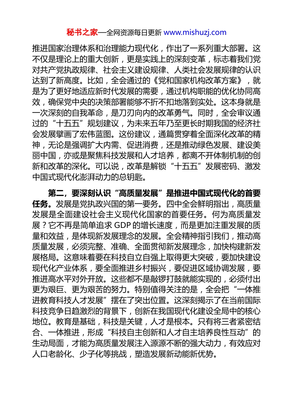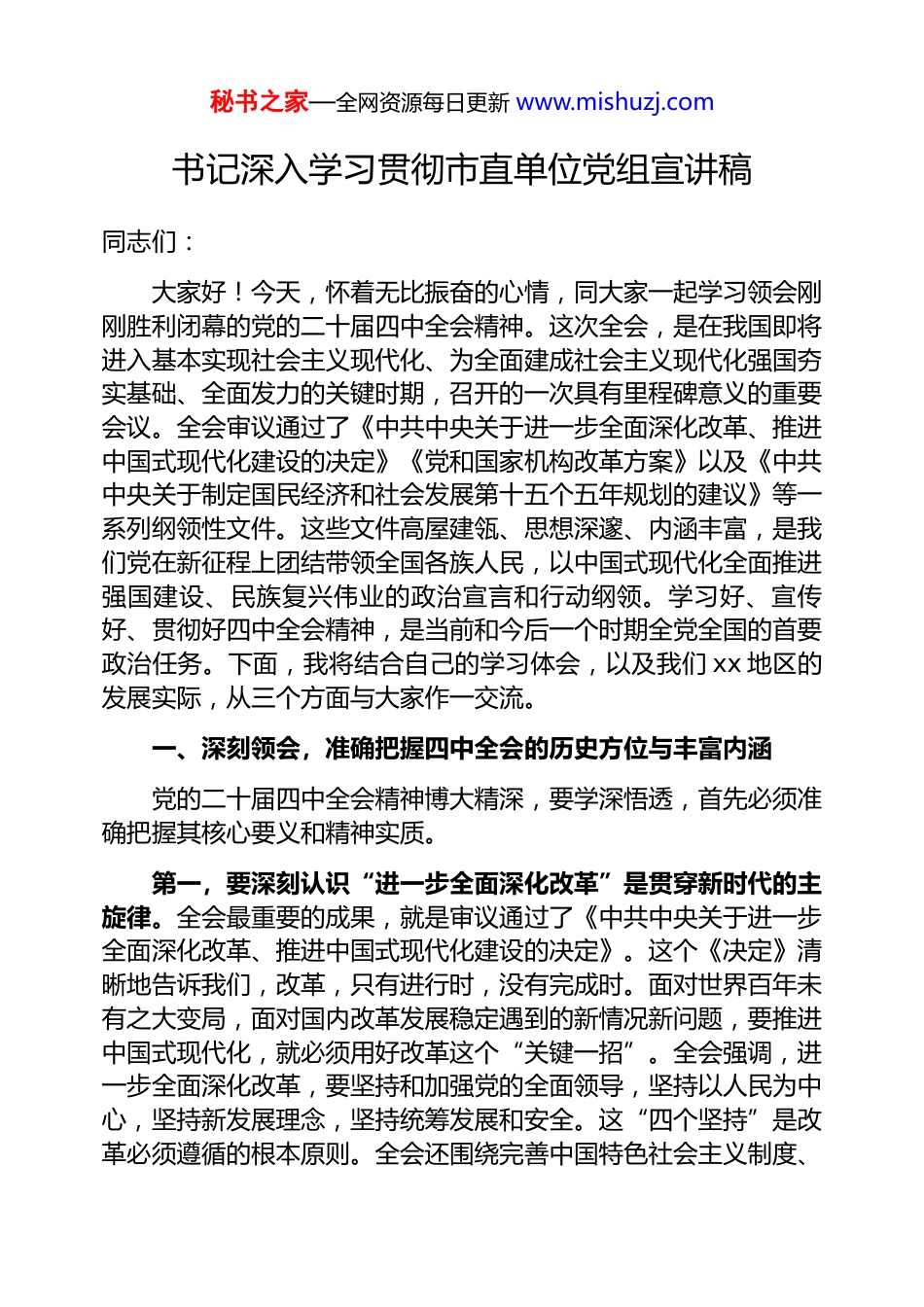 秘书之家—全网资源每日更新 www.mishuzj.com书记深入学习贯彻市直单位党组宣讲稿同志们:大家好!今天,怀着无比振奋的心情,同大家一起学习领会刚刚胜利闭幕的党的二十届四中全会精神。这次全会,是在我国即将进入基本实现社会主义现代化、为全面建成社会主义现代化强国夯实基础、全面发力的关键时期,召开的一次具有里程碑意义的重要会议。全会审议通过了《中共中央关于进一步全面深化改革、推进中国式现代化建设的决定》《党和国家机构改革方案》以及《中共中央关于制定国民经济和社会发展第十五个五年规划的建议》等一系列纲领性文件。这些文件高屋建瓴、思想深邃、内涵丰富,是我们党在新征程上团结带领全国各族人民,以中国式现代化全面推进强国建设、民族复兴伟业的政治宣言和行动纲领。学习好、宣传好、贯彻好四中全会精神,是当前和今后一个时期全党全国的首要政治任务。下面,我将结合自己的学习体会,以及我们 xx 地区的发展实际,从三个方面与大家作一交流。一、深刻领会,准确把握四中全会的历史方位与丰富内涵党的二十届四中全会精神博大精深,要学深悟透,首先必须准确把握其核心要义和精神实质。第一,要深刻认识“进一步全面深化改革”是贯穿新时代的主旋律。全会最重要的成果,就是审议通过了《中共中央关于进一步全面深化改革、推进中国式现代化建设的决定》。这个《决定》清晰地告诉我们,改革,只有进行时,没有完成时。面对世界百年未有之大变局,面对国内改革发展稳定遇到的新情况新问题,要推进中国式现代化,就必须用好改革这个“关键一招”。全会强调,进一步全面深化改革,要坚持和加强党的全面领导,坚持以人民为中心,坚持新发展理念,坚持统筹发展和安全。这“四个坚持”是改革必须遵循的根本原则。全会还围绕完善中国特色社会主义制度、秘书之家—全网资源每日更新 www.mishuzj.com推进国家治理体系和治理能力现代化,作出了一系列重大部署。这不仅是理论上的重大创新,更是实践上的深刻变革,标志着我们党对共产党执政规律、社会主义建设规律、人类社会发展规律的认识达到了新高度。比如,全会通过的《党和国家机构改革方案》,就是为了更好地适应新时代发展的需要,通过机构职能的优化协同高效,确保党中央的决策部署能够不折不扣地落到实处。这本身就是一次深刻的自我革命,是刀刃向内的改革勇气。同时,全会审议通过的“十五五”规划建议,为未来五年乃至更长时期我国的经济社会发展擘画了宏伟蓝图。这份建议,通篇贯穿着全面深化改革的精神,无论是强调扩大内需、促进消费,还是推动绿色发展、建设美丽中国,亦或是聚焦科技发展和人才培养,都离不开体制机制的创新和改革的深化。可以说,改革是解锁“十五五”发展密码、激发中国式现代化澎湃动力的总钥匙。第二,要深刻认识“高质量发展”是推进中国式现代化的首要任务。发展是党执政兴国的第一要务。四中全会鲜明指出,高质量发展是全面建设社会主义现代化国家的首要任务。何为高质量发展?它不再是简单追求 GDP 的增长速度,而是更加注重发展的质量和效益,是体现新发展理念的发展。全会精神指引我们,推动高质量发展,必须完整、准确、全面贯彻新发展理念,加快构建新发展格局。这意味着要在科技自立自强上取得更大突破,要加快建设现代化产业体系,要全面推进乡村振兴,要促进区域协调发展,要推进高水平对外开放。这些都不是敲锣打鼓就能实现的,必须付出更为艰巨、更为艰苦的努力。特别值得关注的是,全会把“一体推进教育科技人才发展”摆在了突出位置。这深刻揭示了在当前国际科技竞争日趋激烈的背景下,创新在我国现代化建设全局中的核心地位。教育是基础,科技是关键,人才是根本。只有将三者紧密结合、一体推进,形成“科技自主创新和人才自主培养良性互动”的生动局面,才能为高质量发展注入源源不断的强大动力,有效应对人口老龄化、少子化等挑战,塑造发展新动能新优势。秘书之家—全网资源每日更新 www.mishuzj.com第三,要深刻认识“统筹发展和安全”是行稳致远的根本保障。安全是发展的前提,发展是安全的保障。四中全会强调,要“统筹发展和安全,建设更高水平平安...