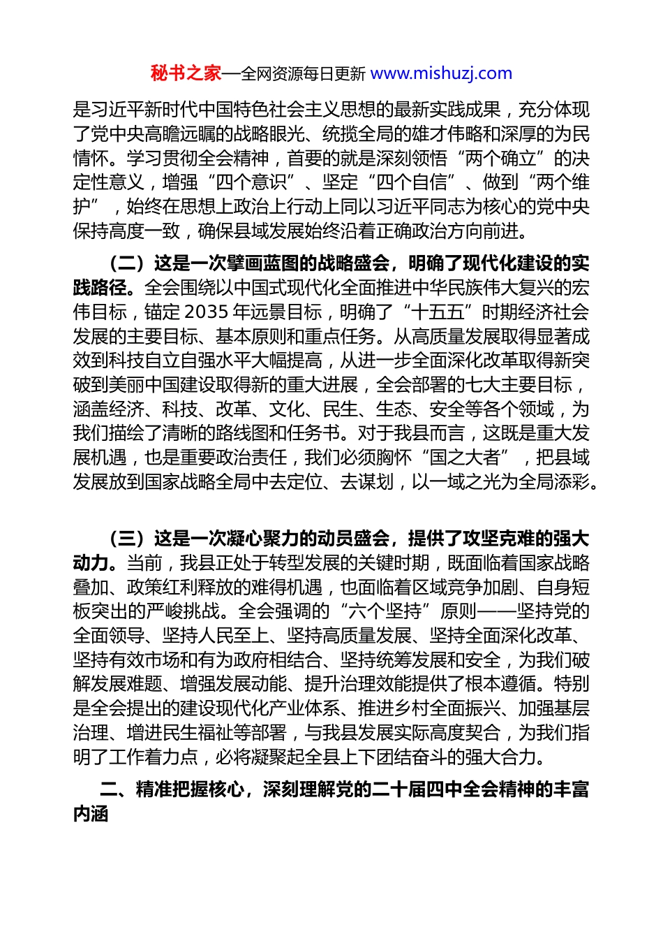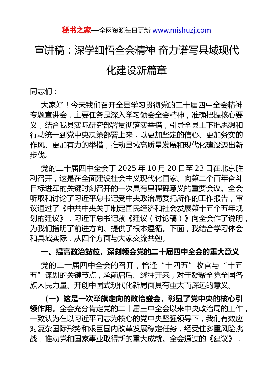 秘书之家—全网资源每日更新 www.mishuzj.com宣讲稿:深学细悟全会精神 奋力谱写县域现代化建设新篇章同志们:大家好!今天我们召开全县学习贯彻党的二十届四中全会精神专题宣讲会,主要任务是深入学习领会全会精神,准确把握核心要义,结合我县实际研究部署贯彻落实举措,引导全县上下把思想和行动统一到党中央决策部署上来,以更加坚定的信心、更加务实的作风、更加有力的举措,推动县域高质量发展和现代化建设迈出新步伐。党的二十届四中全会于 2025 年 10 月 20 日至 23 日在北京胜利召开,这是在全面建设社会主义现代化国家、向第二个百年奋斗目标进军的关键时刻召开的一次具有里程碑意义的重要会议。全会听取和讨论了习近平总书记受中央政治局委托所作的工作报告,审议通过了《中共中央关于制定国民经济和社会发展第十五个五年规划的建议》,习近平总书记就《建议(讨论稿)》向全会作了说明,为我们指明了前进方向、提供了根本遵循。下面,我结合学习体会和县域实际,从四个方面与大家交流共勉。一、提高政治站位,深刻领会党的二十届四中全会的重大意义党的二十届四中全会的召开,恰逢“十四五”收官与“十五五”谋划的关键节点,承前启后、继往开来,对于凝聚全党全国各族人民力量、开创中国式现代化新局面具有重大而深远的意义。(一)这是一次举旗定向的政治盛会,彰显了党中央的核心引领作用。全会充分肯定党的二十届三中全会以来中央政治局的工作,一致认为在以习近平同志为核心的党中央坚强领导下,我们有效应对复杂国际形势和艰巨国内改革发展稳定任务,经受住多重风险挑战,推动党和国家事业取得新的重大成就。全会通过的《建议》,秘书之家—全网资源每日更新 www.mishuzj.com是习近平新时代中国特色社会主义思想的最新实践成果,充分体现了党中央高瞻远瞩的战略眼光、统揽全局的雄才伟略和深厚的为民情怀。学习贯彻全会精神,首要的就是深刻领悟“两个确立”的决定性意义,增强“四个意识”、坚定“四个自信”、做到“两个维护”,始终在思想上政治上行动上同以习近平同志为核心的党中央保持高度一致,确保县域发展始终沿着正确政治方向前进。(二)这是一次擘画蓝图的战略盛会,明确了现代化建设的实践路径。全会围绕以中国式现代化全面推进中华民族伟大复兴的宏伟目标,锚定 2035 年远景目标,明确了“十五五”时期经济社会发展的主要目标、基本原则和重点任务。从高质量发展取得显著成效到科技自立自强水平大幅提高,从进一步全面深化改革取得新突破到美丽中国建设取得新的重大进展,全会部署的七大主要目标,涵盖经济、科技、改革、文化、民生、生态、安全等各个领域,为我们描绘了清晰的路线图和任务书。对于我县而言,这既是重大发展机遇,也是重要政治责任,我们必须胸怀“国之大者”,把县域发展放到国家战略全局中去定位、去谋划,以一域之光为全局添彩。(三)这是一次凝心聚力的动员盛会,提供了攻坚克难的强大动力。当前,我县正处于转型发展的关键时期,既面临着国家战略叠加、政策红利释放的难得机遇,也面临着区域竞争加剧、自身短板突出的严峻挑战。全会强调的“六个坚持”原则——坚持党的全面领导、坚持人民至上、坚持高质量发展、坚持全面深化改革、坚持有效市场和有为政府相结合、坚持统筹发展和安全,为我们破解发展难题、增强发展动能、提升治理效能提供了根本遵循。特别是全会提出的建设现代化产业体系、推进乡村全面振兴、加强基层治理、增进民生福祉等部署,与我县发展实际高度契合,为我们指明了工作着力点,必将凝聚起全县上下团结奋斗的强大合力。二、精准把握核心,深刻理解党的二十届四中全会精神的丰富内涵秘书之家—全网资源每日更新 www.mishuzj.com党的二十届四中全会精神内涵丰富、博大精深,我们要原原本本学、全面系统学、联系实际学,准确把握其核心要义和实践要求,真正做到学深悟透、融会贯通。(一)准确把握“十五五”时期的重大原则,筑牢发展根基。全会深刻总结五年规划编制实施的宝贵经验,提出的“六个坚持”重大原则,是新征程上谋划发展的重要遵循,必须贯穿县域发展全过程各方面。一是坚持党的...