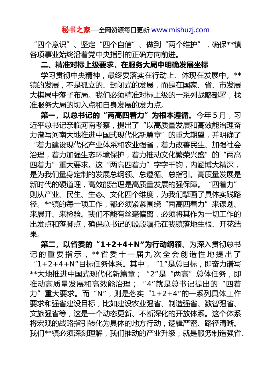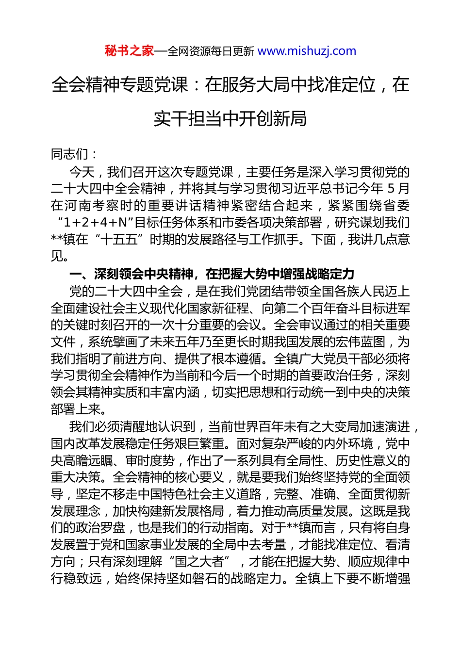 秘书之家—全网资源每日更新 www.mishuzj.com全会精神专题党课:在服务大局中找准定位,在实干担当中开创新局同志们:今天,我们召开这次专题党课,主要任务是深入学习贯彻党的二十大四中全会精神,并将其与学习贯彻习近平总书记今年 5 月在河南考察时的重要讲话精神紧密结合起来,紧紧围绕省委“1+2+4+N”目标任务体系和市委各项决策部署,研究谋划我们**镇在“十五五”时期的发展路径与工作抓手。下面,我讲几点意见。一、深刻领会中央精神,在把握大势中增强战略定力党的二十大四中全会,是在我们党团结带领全国各族人民迈上全面建设社会主义现代化国家新征程、向第二个百年奋斗目标进军的关键时刻召开的一次十分重要的会议。全会审议通过的相关重要文件,系统擘画了未来五年乃至更长时期我国发展的宏伟蓝图,为我们指明了前进方向、提供了根本遵循。全镇广大党员干部必须将学习贯彻全会精神作为当前和今后一个时期的首要政治任务,深刻领会其精神实质和丰富内涵,切实把思想和行动统一到中央的决策部署上来。我们必须清醒地认识到,当前世界百年未有之大变局加速演进,国内改革发展稳定任务艰巨繁重。面对复杂严峻的内外环境,党中央高瞻远瞩、审时度势,作出了一系列具有全局性、历史性意义的重大决策。全会精神的核心要义,就是要我们始终坚持党的全面领导,坚定不移走中国特色社会主义道路,完整、准确、全面贯彻新发展理念,加快构建新发展格局,着力推动高质量发展。这既是我们的政治罗盘,也是我们的行动指南。对于**镇而言,只有将自身发展置于党和国家事业发展的全局中去考量,才能找准定位、看清方向;只有深刻理解“国之大者”,才能在把握大势、顺应规律中行稳致远,始终保持坚如磐石的战略定力。全镇上下要不断增强秘书之家—全网资源每日更新 www.mishuzj.com“四个意识”、坚定“四个自信”、做到“两个维护”,确保**镇各项事业始终沿着党中央指引的正确方向前进。二、精准对标上级要求,在服务大局中明确发展坐标学习贯彻中央精神,最终要落实在行动上、体现在发展中。**镇的发展,不是孤立的、封闭式的发展,而是在国家、省、市发展大棋局中落子布局。我们必须精准对标上级的一系列战略部署,找准服务大局的切入点和自身发展的发力点。第一,以总书记的“两高四着力”为根本遵循。今年 5 月,习近平总书记亲临河南考察,提出了“以高质量发展和高效能治理奋力谱写河南大地推进中国式现代化新篇章”的重大期望,并明确了“着力建设现代化产业体系和农业强省,着力改善民生、加强社会治理,着力加强生态环境保护,着力推动文化繁荣兴盛”的“两高四着力”重大要求。这“两高四着力”字字千钧,内涵博大精深,是为我们量身定制的发展总纲领、总遵循、总指引。高质量发展是新时代的硬道理,高效能治理是高质量发展的强保障。“四着力”则从产业、民生、生态、文化四个维度,为我们擘画了具体实践路径。**镇的每一项工作,都必须紧紧围绕“两高四着力”来谋划、来展开、来检验。我们不能有丝毫偏离,必须将其作为一切工作的出发点和落脚点,确保总书记的殷殷嘱托在我镇落地生根、开花结果。第二,以省委的“1+2+4+N”为行动纲领。为深入贯彻总书记 的 重 要 指 示 , ** 省 委 十 一 届 九 次 全 会 创 造 性 地 提 出 了“1+2+4+N”目标任务体系。其中,“1”是总目标,即奋力谱写**大地推进中国式现代化新篇章;“2”是“两高”总体任务,即推动高质量发展和高效能治理;“4”就是总书记提出的“四着力”重大要求。而“N”,则是落实“1+2+4”的一系列具体工作要求和强省建设目标,比如建设农业强省、制造强省、数智强省、文旅强省等,这是一个动态更新、不断深化的开放体系。这个体系将宏观的战略指引转化为具体的地方行动,逻辑严密、路径清晰。我们**镇必须深刻理解,我们推动的产业升级,就是服务制造强省、秘书之家—全网资源每日更新 www.mishuzj.com数智强省建设的具体实践;我们抓的粮食生产和特色农业,就是助力农业强省建设的基层单元;我们推进的文旅融合,就是为文旅强省添砖加瓦。全镇各部门、各村居要主动对号入座...