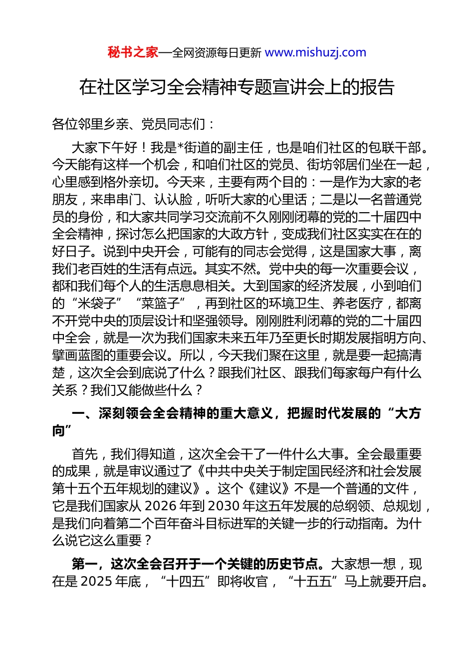 秘书之家—全网资源每日更新 www.mishuzj.com在社区学习全会精神专题宣讲会上的报告各位邻里乡亲、党员同志们:大家下午好!我是*街道的副主任,也是咱们社区的包联干部。今天能有这样一个机会,和咱们社区的党员、街坊邻居们坐在一起,心里感到格外亲切。今天来,主要有两个目的:一是作为大家的老朋友,来串串门、认认脸,听听大家的心里话;二是以一名普通党员的身份,和大家共同学习交流前不久刚刚闭幕的党的二十届四中全会精神,探讨怎么把国家的大政方针,变成我们社区实实在在的好日子。说到中央开会,可能有的同志会觉得,这是国家大事,离我们老百姓的生活有点远。其实不然。党中央的每一次重要会议,都和我们每个人的生活息息相关。大到国家的经济发展,小到咱们的“米袋子”“菜篮子”,再到社区的环境卫生、养老医疗,都离不开党中央的顶层设计和坚强领导。刚刚胜利闭幕的党的二十届四中全会,就是一次为我们国家未来五年乃至更长时期发展指明方向、擘画蓝图的重要会议。所以,今天我们聚在这里,就是要一起搞清楚,这次全会到底说了什么?跟我们社区、跟我们每家每户有什么关系?我们又能做些什么?一、深刻领会全会精神的重大意义,把握时代发展的“大方向”首先,我们得知道,这次全会干了一件什么大事。全会最重要的成果,就是审议通过了《中共中央关于制定国民经济和社会发展第十五个五年规划的建议》。这个《建议》不是一个普通的文件,它是我们国家从 2026 年到 2030 年这五年发展的总纲领、总规划,是我们向着第二个百年奋斗目标进军的关键一步的行动指南。为什么说它这么重要?第一,这次全会召开于一个关键的历史节点。大家想一想,现在是 2025 年底,“十四五”即将收官,“十五五”马上就要开启。秘书之家—全网资源每日更新 www.mishuzj.com我们正处在全面建设社会主义现代化国家、向第二个百年奋斗目标进军的新征程上。前面的路怎么走,发展的重点在哪里,面临的挑战怎么应对,都需要党中央给我们一个明确的指引。党的二十届四中全会就承担了这样一个“承前启后、继往开来”的重大历史使命。它为我们描绘了未来五年的发展蓝图,让我们每个人都对未来有了更清晰的预期和更坚定的信心。第二,这次全会的核心成果关系到我们每个人的切身利益。“五年规划”听起来宏大,但它最终要落实在一个个具体的项目、一项项具体的政策上。比如,未来五年国家要重点发展哪些产业,可能会影响到我们子女的就业选择;国家要在社会保障方面投入多少,直接关系到我们的养老金能不能涨、医保报销比例高不高;国家要如何推进城市更新和乡村振兴,决定了我们社区的环境会不会更美、生活会不会更便利。可以说,《建议》中的每一条,都与我们的衣食住行、安危冷暖紧密相连。第三,这次全会进一步彰显了我们制度的巨大优势。世界上很少有哪个国家、哪个政党能够像我们这样,制定出如此长远、系统、科学的发展规划,并且一茬接着一茬干,一张蓝图绘到底。这背后,就是中国特色社会主义制度的优越性,就是坚持党的全面领导这个“定海神针”。习近平总书记在全会上的重要讲话,高屋建瓴、思想深邃,是我们理解和把握全会精神的“纲”和“魂”为我们指明了前进的方向。正是因为有党的坚强领导,我们才能集中力量办大事,战胜各种风险挑战,推动经济社会持续健康发展。所以说,学习党的二十届四中全会精神,绝不是一句空话,而是帮助我们看清大势、明确方向,把我们个人的奋斗、社区的发展,融入国家发展的宏伟蓝图之中,让我们走得更稳、更有劲。二、深入解读全会精神的核心要义,明确未来发展的“路线图”搞清楚了全会的重大意义,我们再来一起看看,《建议》这份“路线图”里,到底画了些什么,和我们社区的发展有什么紧密的秘书之家—全网资源每日更新 www.mishuzj.com联系。虽然《建议》全文内容非常丰富,但我们可以从几个和我们基层感受最深的方面来理解。(一)高质量发展是首要任务,为社区繁荣注入新动能。全会《建议》肯定会继续强调,发展是硬道理,但新时代的发展,必须是高质量的发展。这意味着不能再走过去那种粗放式增长的老路,而是要依靠科技创新、绿色发展...