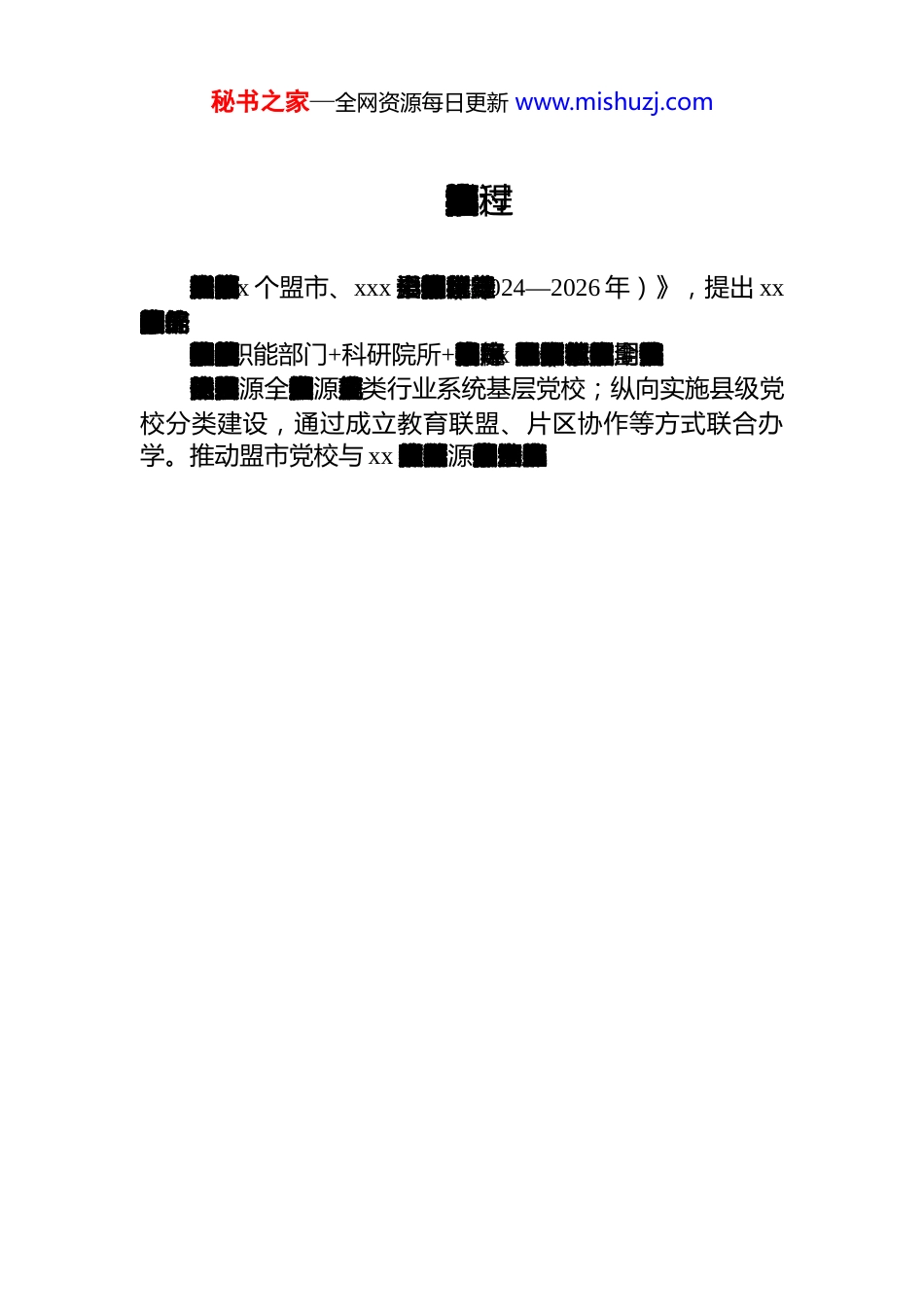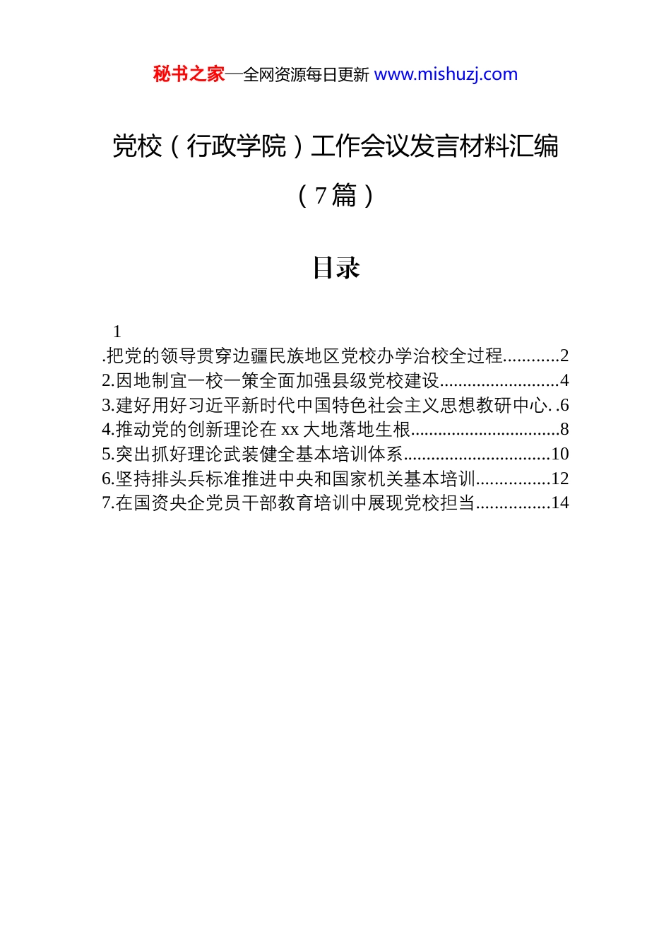 秘书之家—全网资源每日更新 www.mishuzj.com党校(行政学院)工作会议发言材料汇编(7 篇)目录1.把党的领导贯穿边疆民族地区党校办学治校全过程............22.因地制宜一校一策全面加强县级党校建设..........................43.建好用好习近平新时代中国特色社会主义思想教研中心. .64.推动党的创新理论在 xx 大地落地生根.................................85.突出抓好理论武装健全基本培训体系................................106.坚持排头兵标准推进中央和国家机关基本培训................127.在国资央企党员干部教育培训中展现党校担当................14秘书之家—全网资源每日更新 www.mishuzj.com把党的领导贯穿边疆民族地区党校办学治校全过程强化党委“办党校”的政治责任,旗帜鲜明加强对党校工作的全面领导。认真落实习近平总书记关于党校工作的要求,层压实各级党委抓党校工作的主体责任。一是推动各级“一把手”兼任党校长,带动xx 个盟市、xxx 个旗县委书记全部兼任党校长,组织部长协助分管党校工作。二是推动党校工作纳入党委部署,列入党建年度目标考核、党建述职评议重要内容,制定出台《全区党校(行政学院)创新提升三年行动方案(2024—2026 年)》,提出 xx项具体举措,分年度制定工作要点。三是推动三级党委贯通一体办党校,设立党校工作处,加强对市、县党委办党校的指导和帮扶,构建省、市、县三级党校业务一体共建、班次统筹安排、课程统一设置、师资统一培养的工作格局。强化党委“管党校”的改革责任,推动党校在服务办好两件大事中彰显独特价值。深化办学体制机制改革,推进从严治校和质量立校。一是健全基本培训机制,提升为党育才水平。实施基本培训扩面提质行动,启动“沿着总书记指引的方向”教育培训项目,统筹编制三级党校党性教育教学大纲。二是建设决策咨询智库,提升为党献策水平。推行“党校+职能部门+科研院所+高校”联合研究模式,成立边疆治理、中华民族共同体等研究中心,组建“祖国北疆安全稳定屏障”等xx 个专业研究团队。三是深化办学机制改革,提升从严治校水平。深入贯彻新修订的《中国共产党校(行政学院)工作条例》,健全学术标准、教学标准、管理标准,创新实施“招标竞课、择优主讲”的课程生成准入制度,制定学员全周期全链条党性教育办法,建设“智慧校园”,优化考评方式。强化党委“建党校”的保障责任,全面夯实边疆民族地区党校发展基础。整合各方资源,全力支持党校高质量发展。一是优化党校布局。横向统筹各领域教学资源,成立直属机关、高校、企业等x 类行业系统基层党校;纵向实施县级党校分类建设,通过成立教育联盟、片区协作等方式联合办学。推动盟市党校与 xx 区级党校结对共建。二是构建“双师”体系。建强专职教师队伍,实施党校系统教研新秀、社科英才、教学名师“三个一批”人才培养计划。用好兼职教师资源,建立领导干部、专家学者、优秀企业家等兼职教师人才库。三是改善办学条件。足额保障各级党校办学经费,调整党校事业序列人员绩效工资水平。推动各地盘活用好国有资产,有力保障边疆民族地区党校事业的长远发展。秘书之家—全网资源每日更新 www.mishuzj.com 因地制宜一校一策全面加强县级党校建设深化认识、提高站位,切实扛牢县级党校建设政治责任。省委认真落实《中国共产党党校(行政学院)工作条例》,把县级党校建设列入党委党建工作目标考核和书记党建工作责任制述职内容,进一步压实责任,加紧推动县级党校锻长补短、规范提升,以实际行动深刻领悟“两个确立”的决定性意义、坚决做到“两个维护”。省委主要负责同志今年以来先后 x 次召开省委常委会会议和若干次专题会,研究制定《关于加强县级党校建设提升基本培训质量的若干措施》,推动解决县级党校建设发展中存在的困难和问题。省委分管负责同志深入县级党校实地调研,指导推动各地研究制定解决问题的思路举措。市县党委书记履行属地责任,一线推动、全力落实,用心用情用力耕耘党校事业“责任田”。全省各级形成齐心合力办党校、管党校、建党校新格局,县级党校工作呈现新局面。摸清底数、精准施策,因地制...