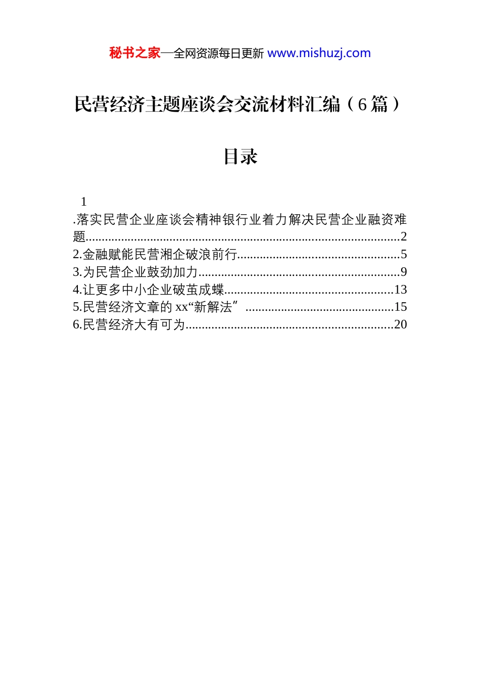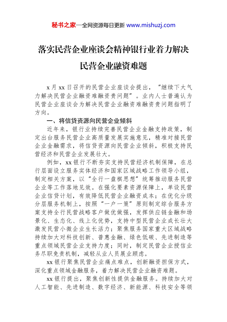 秘书之家—全网资源每日更新 www.mishuzj.com民营经济主题座谈会交流材料汇编(6 篇)目录1.落实民营企业座谈会精神银行业着力解决民营企业融资难题.................................................................................................22.金融赋能民营湘企破浪前行..................................................53.为民营企业鼓劲加力..............................................................94.让更多中小企业破茧成蝶....................................................135.民营经济文章的 xx“新解法”..............................................156.民营经济大有可为................................................................20秘书之家—全网资源每日更新 www.mishuzj.com落实民营企业座谈会精神银行业着力解决民营企业融资难题x 月 xx 日召开的民营企业座谈会提出,继续下大气“力解决民营企业融资难融资贵问题。业内人士普遍认为”民营企业座谈会为解决民营企业融资难融资贵问题指明了方向。一、将信贷资源向民营企业倾斜近年来,银行业持续完善民营企业金融支持政策,制定出台服务民营企业高质量发展实施意见,精准对接民营企业金融需求,将信贷资源向民营企业倾斜,积极支持民营经济和民营企业发展壮大。例如,xx 银行不断夯实支持民营经济机制保障,在总行层面设立服务实体经济和国家区域战略工作领导小组,制定相关方案,以全行一盘棋思想统筹推动服务民营“”企业等工作落地见效。在强化要素资源保障上,单设民营企业信贷计划,有效降低民营企业融资成本;在优化分级分层服务机制上,按照一户一策原则制定综合服务方“”案支持全行民营战略客户做优做强,发挥供应链金融和场景化、生态化、线上化优势,支持中型民营企业成长壮大激发民营小微企业生长活力;聚焦服务国家重大区域战略持续加大对科技创新、普惠金融、绿色低碳、先进制造等重点领域民营企业支持力度;同时,制定民营企业授信业务尽职免责机制,减轻从业人员展业顾虑。xx 银行聚焦民营企业痛点难点,创新融资担保方式,深化重点领域金融服务,着力解决民营企业融资难题。xx 银行提出,聚焦创新性提供金融服务。持续加大对人工智能、先进制造、数字经济、新能源、科技安全等领秘书之家—全网资源每日更新 www.mishuzj.com域民营企业支持力度,优化产品服务和信贷政策,因地制宜支持新质生产力发展。聚焦普惠性提供金融服务。推动普惠金融提质扩面,提高政策精准度,提升业务可得性、便利性,帮助民营企业务实解决融资难、融资贵问题。聚焦专业性提供金融服务。充分发挥中国银行全球化、综合化特色优势,持续完善民营企业出海服务体系,提升“”民营企业出海服务质效。强化综合金融服务能力,创“”新和丰富民营企业融资渠道。xx 银行相关负责人表示,将把金融支持民营经济发展作为当前工作重点,着力解决民营企业融资难融资贵问题推进支持民营经济各项举措落实见效,支持民营企业产业升级与自主创新,持续加大对现代化产业体系建设、乡村振兴、区域协调发展、保障和改善民生等重点领域民营企业金融资源投入,促进民营企业高质量发展。二、满足民营企业多元化资金需求对民营企业而言,良性持久的资金流是其健康、高质量发展的关键。面对民营企业多元化资金需求,xx 农商银行综合考量企业实际需求和发展情况,切实解决企业融资难融资贵问题。对民营首贷户,xx 农商银行加大政策支持力度,拓展新户新增首贷户,提升首贷户服务质量,降低民企融资成本。2024 年累计投放对公民营企业贷款超 xxxx 亿元,占当年新发放公司类贷款近七成,其中落地对公民营企业首贷户超 xxxx 户;当年累计发放对公民营企业贷款年化利率较年初下降 xx 个基点,有效降低企业融资成本。xx 银行则以全生命周期金融服务,助力民营企业发展壮大,实现银企协同发展、同频共振。xx 物联网产业联盟副秘书长 xx 对《xx》记者表示,银行应从如下方面满足民营企业多元化资金需求:一是持续完善金融支持政策。二是加强与各级政府、行业协会等合作,深入了解民营企业秘书...