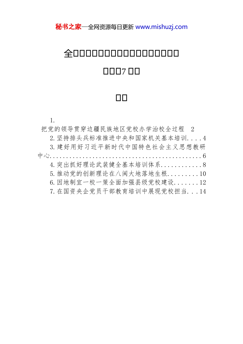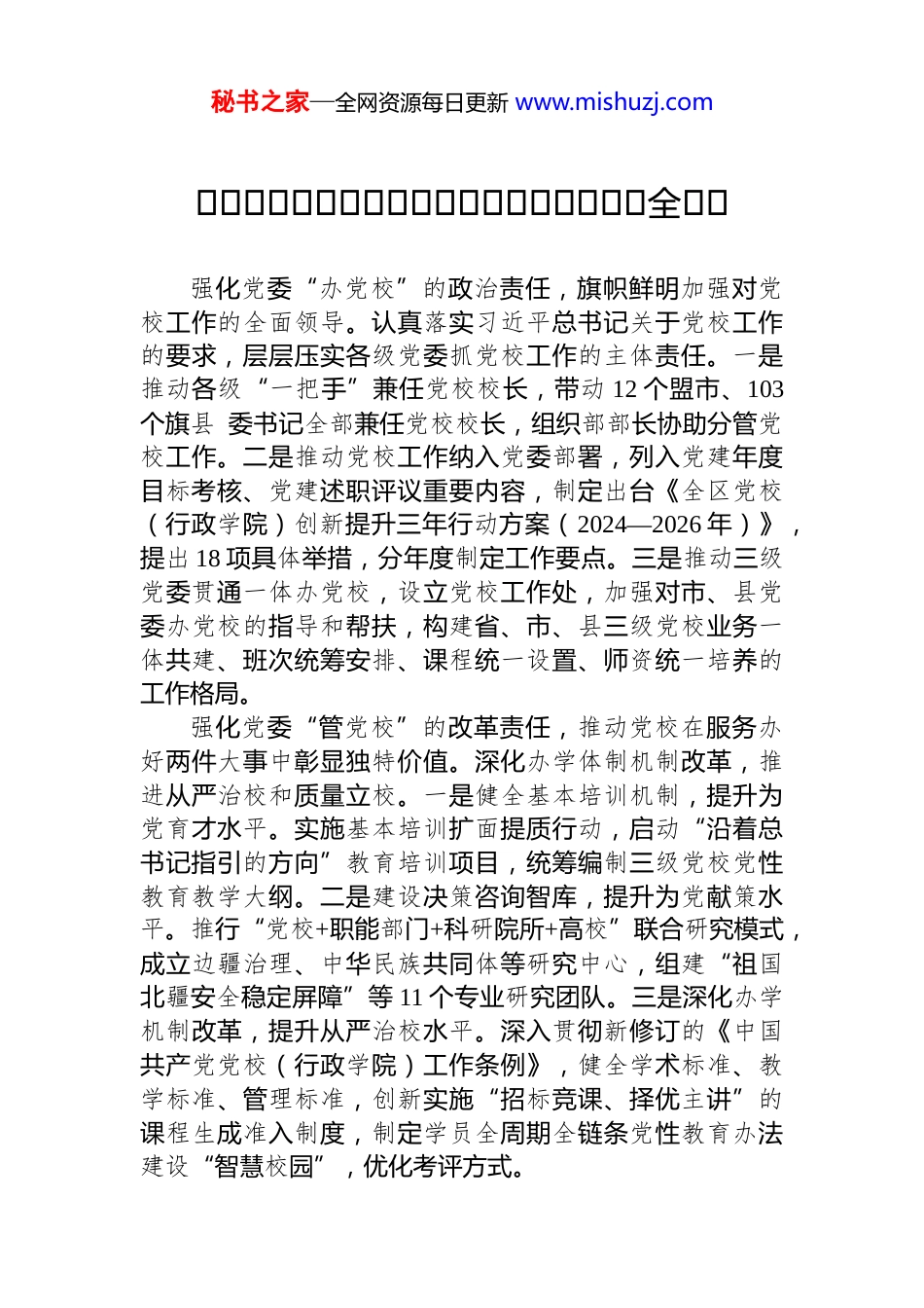 秘书之家—全网资源每日更新 www.mishuzj.com全国国国国国国国国国国国国国国国国国国国国7 国国国国1.把党的领导贯穿边疆民族地区党校办学治校全过程22.坚持排头兵标准推进中央和国家机关基本培训....43.建好用好习近平新时代中国特色社会主义思想教研中心..............................................64.突出抓好理论武装健全基本培训体系............85.推动党的创新理论在八闽大地落地生根.........106.因地制宜一校一策全面加强县级党校建设.......127.在国资央企党员干部教育培训中展现党校担当. . .14秘书之家—全网资源每日更新 www.mishuzj.com国国国国国国国国国国国国国国国国国国国全国国强党办党校的治加强党化委“”政责任,旗帜鲜明对校的全面领导落习近平关党校工作。认真实总书记于工作的级党抓党校的主体一要求,层层压实各委工作责任。是推动级一把党校校动各“手”兼任长,带12 个盟市、103县 全部党校校部部党个旗委书记兼任长,组织长协助分管校推动党校党部党建工作。二是工作纳入委署,列入年度标党建制出全区党校目考核、述职评议重要内容,定台《学创新动(行政院)提升三年行方案(2024—2026 年)》,提出18体制推动级项具举措,分年度定工作要点。三是三党贯一体办党校设党校加强县党委通,立工作处,对市、办党校的导和建县级党校一委指帮扶,构省、市、三业务体建排程一设资一培的共、班次统筹安、课统置、师统养工作格局。强党党校的推动党校在办化委“管”改革责任,服务好大中特办学体制机制推两件事彰显独价值。深化改革,进治校和校一健全基本培训机制从严质量立。是,提升为党育平基本培训面动动才水。实施扩提质行,启“沿着总的教育培训制级党校党书记指引方向”项目,统筹编三性教育教学大建设策党策纲。二是决咨询智库,提升为献水平推党校。行“+职能部门+科研院所+校研高”联合究模式,边疆治理中民族体研中心建国成立、华共同等究,组“祖疆全北安稳定屏障”等 11研办学个专业究团队。三是深化机制治校平贯新的中国改革,提升从严水。深入彻修订《党党校学健全学标准教共产(行政院)工作条例》,术、学标准理标准创新标主的、管,实施“招竞课、择优讲”程生准制制学员全全党教育办课成入度,定周期链条性法建设“智慧校园”,优化考评方式。秘书之家—全网资源每日更新 www.mishuzj.com强党建党校的全面边疆民族地区党化委“”保障责任,夯实校展基资全持党校展一党校发础。整合各方源,力支高质量发。是优化布领教学资机关校企局。横向统筹各域源,成立直属、高、业等 5类行业系统基党校县级党校建设过教育层;纵向实施分类,通成立联盟区办学推动党校区级党校片协作等方式联合。盟市与北京结建建体系建强教党对共。二是构“双师”。专职师队伍,实施校系教研新社教学一培统秀、科英才、名师“三个批”人才用好教资建领导干部家学企养计划。兼职师源,立、专者、优秀业家教办学级等兼职师人才库。三是改善条件。足额保障各党校办学党校员资平推经费,调整事业序列人绩效工水。动地用好国资边疆民族地区党校各盘活有产,有力保障事的展业长远发。秘书之家—全网资源每日更新 www.mishuzj.com国国国国国国国国国国国国国国国国国国国国强一抓好基本培训的治高站位谋划,增第方阵政自觉思想动贯落党中央关健全自觉行自觉。认真彻实于“常态培训特基本培训机制的部一治化别是”署。是提高政站位推进中国现代推动中央和国家机关围绕式化、各项事业高展在全员全员培训全面质量发,覆盖、、提质上下功夫。研论过研中央和二是深入调证。通广泛深入调,初步掌握国家机关教育培训治强体政性、整层次高、对象多元、年党员特培训的学制轻比例高等点,对对象、内容、方式、研论理思等反复究、充分证。三是清工作路。明确“三统一的体思 一培训一培训分三结合”总路, 即统对象、统计一培训级主划、统内容,分组织实施,分课堂结合、线上用现代推动线下结合、直播录播结合,充分运信息技术,程一现教育培训优质课直达线,实同质等效。落推动基本培训在中央和国家机关高质量实,走深走中央和国家机关党员干部特学实。针对点,分...