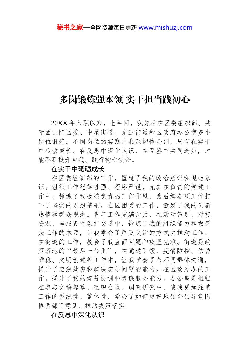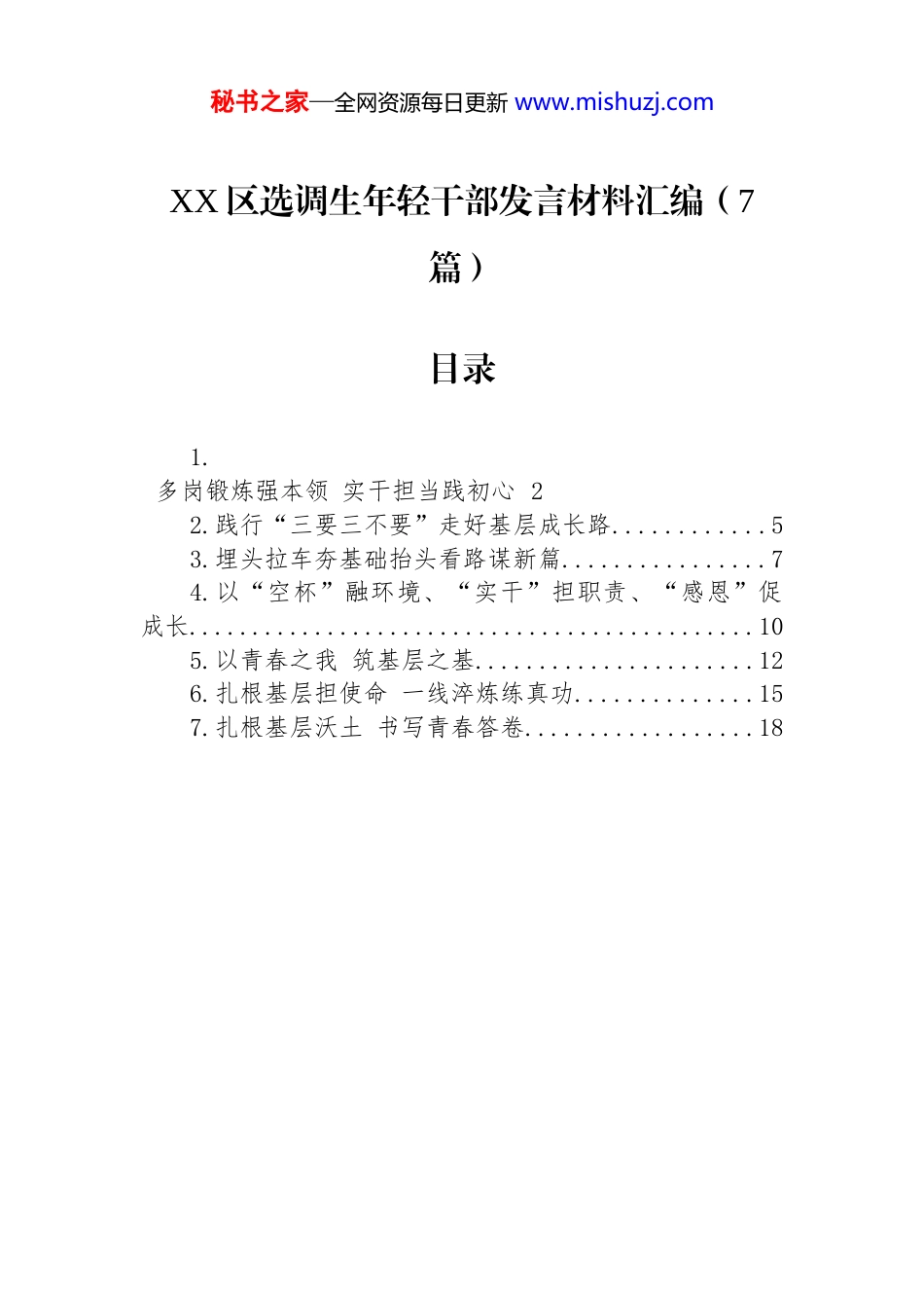 秘书之家—全网资源每日更新 www.mishuzj.comXX 区选调生年轻干部发言材料汇编(7篇)目录1.多岗锻炼强本领 实干担当践初心 22.践行“三要三不要”走好基层成长路............53.埋头拉车夯基础抬头看路谋新篇................74.以“空杯”融环境、“实干”担职责、“感恩”促成长.............................................105.以青春之我 筑基层之基......................126.扎根基层担使命 一线淬炼练真功..............157.扎根基层沃土 书写青春答卷..................18秘书之家—全网资源每日更新 www.mishuzj.com多岗锻炼强本领 实干担当践初心20XX 年入职以来,七年间,我先后在区委组织部、共青团山阳区委、中星街道、光亚街道和区政府办公室多个岗位锻炼。不同岗位的实践让我深切体会到,只有在实干中砥砺成长、在反思中深化认识、在互鉴中共同进步,才能不断提升自我、践行初心使命。在实干中砥砺成长在区委组织部的工作,塑造了我的政治意识和规矩意识。组织工作纪律性强、程序严谨,尤其在负责的党建工作中,锤炼了我极端负责的工作作风,为后续各项工作打下了坚实的思想基础。在区团委的工作,激发了我的创新热情和群众观念。青年工作充满活力,在活动策划、对接资源、与服务对象打交道中,锻炼了我的组织能力和做群众工作的本领,让我学会了用更灵活的方式去推动工作。在街道的工作,教会了我直面问题和攻坚克难。街道是政策落地的“最后一公里”,在党建引领、疫情防控、信访维稳、文明创建等工作中,让我学会了与不同群体沟通,提升了应急处突和解决实际问题的能力。在区政府办的工作,提升了我的统筹协调和参谋服务能力。办公室是枢纽在参与文稿起草、组织会议、调查研究中,使我更加注重工作的系统性、整体性,学会了如何更好地领会领导意图协调部门意见、推动决策落实。在反思中深化认识秘书之家—全网资源每日更新 www.mishuzj.com一是“学习”是永恒的主题。随着岗位和形势的变化,只有不断扩充和更新知识库才能克服“本领恐慌”。在推进支部“三化”过程中,对支部组织体系设置、支部班子建设、党员教育管理等工作都进行了认真的学习研究,主导了山阳区党支部“三化”二维码的制作;在“五星”支部创建过程中,学习每颗星的创星规则,指导好辖区各社区争星进星;深入研究学习经济工作,参与《关于调整现行财政管理体制的请示》《风神轮胎股份有限公司高质量发展调研报告》《焦作市山阳区互联网服务外包产业调研报告》等文稿起草,得到领导的肯定。二是“实干”是成事的基石。任何工作最怕眼高手低,都不能只空想,必须要从干开始,沿着既定方向在干的过程中不断调整才能取得好的效果。比如文稿起草工作,提前构思写作思路很重要,但是只空想不动笔就会耽误工期,一切都要从动笔开始,按照定好的写作提纲完善内容,在写作过程中不断进行调整和修改才能达到更好的效果。三是“心态”是成长的关键。从党建到群团,从基层到机关,工作中有顺境也有逆境,有表扬也有批评。重要的是保持积极的心态,胜不骄、败不馁,专注于事、内省于己,才能行稳致远。在互鉴中共同进步一是善总结、多积累。无论是工作还是材料,都要定期梳理、定期总结, 只有脑中有思路、手中有素材,才能在下次工作中更得心应手。二是多走一步、深挖一层。面对工作中领导的要求和群众的诉求,要多往前一步了解情况,多往深一层挖掘实情,不要怕“麻烦”,这些“麻烦”正是成长的“阶梯”。三是守住初心、保持热情。工作难免有“疲惫期”,但请记住我们的初心——为群众办实事、为基层作贡献。组织的肯定和群众满意的笑容是我们继续前行的“不竭动力”。秘书之家—全网资源每日更新 www.mishuzj.com秘书之家—全网资源每日更新 www.mishuzj.com践行“三要三不要”走好基层成长路习近平总书记勉励年轻干部要“做起而行之的行动者、不做坐而论道的清谈客,要当攻坚克难的奋斗者、不当怕见风雨的泥菩萨,在摸爬滚打中增长才干,在层层历练中积累经验”。对照这份殷切期望,结合基层实践,我有三点深刻体会。一要勇于创新求变,不做因循守旧的“保守派”。初到定和街道分管社...