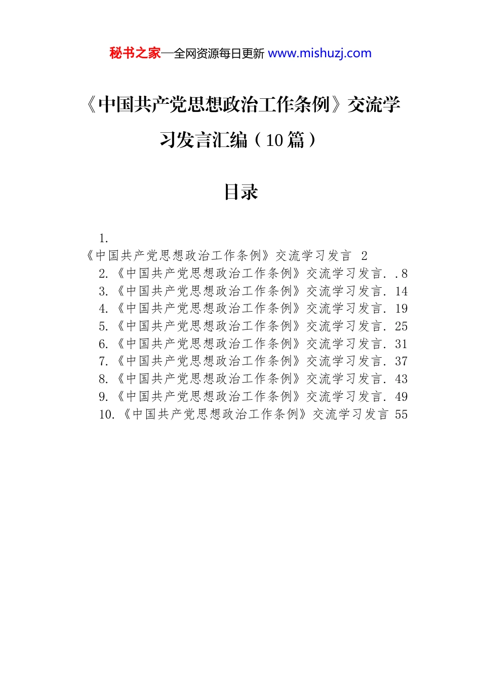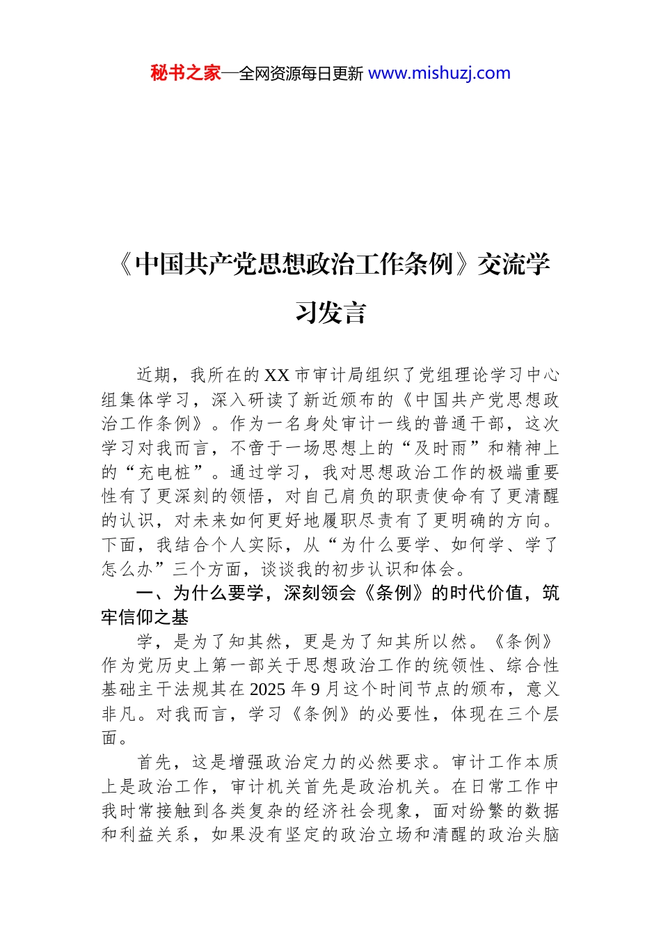 秘书之家—全网资源每日更新 www.mishuzj.com《中国共产党思想政治工作条例》交流学习发言汇编(10 篇)目录1.《中国共产党思想政治工作条例》交流学习发言 22.《中国共产党思想政治工作条例》交流学习发言. .83.《中国共产党思想政治工作条例》交流学习发言. 144.《中国共产党思想政治工作条例》交流学习发言. 195.《中国共产党思想政治工作条例》交流学习发言. 256.《中国共产党思想政治工作条例》交流学习发言. 317.《中国共产党思想政治工作条例》交流学习发言. 378.《中国共产党思想政治工作条例》交流学习发言. 439.《中国共产党思想政治工作条例》交流学习发言. 4910.《中国共产党思想政治工作条例》交流学习发言 55秘书之家—全网资源每日更新 www.mishuzj.com《中国共产党思想政治工作条例》交流学习发言近期,我所在的 XX 市审计局组织了党组理论学习中心组集体学习,深入研读了新近颁布的《中国共产党思想政治工作条例》。作为一名身处审计一线的普通干部,这次学习对我而言,不啻于一场思想上的“及时雨”和精神上的“充电桩”。通过学习,我对思想政治工作的极端重要性有了更深刻的领悟,对自己肩负的职责使命有了更清醒的认识,对未来如何更好地履职尽责有了更明确的方向。下面,我结合个人实际,从“为什么要学、如何学、学了怎么办”三个方面,谈谈我的初步认识和体会。一、为什么要学,深刻领会《条例》的时代价值,筑牢信仰之基学,是为了知其然,更是为了知其所以然。《条例》作为党历史上第一部关于思想政治工作的统领性、综合性基础主干法规其在 2025 年 9 月这个时间节点的颁布,意义非凡。对我而言,学习《条例》的必要性,体现在三个层面。首先,这是增强政治定力的必然要求。审计工作本质上是政治工作,审计机关首先是政治机关。在日常工作中我时常接触到各类复杂的经济社会现象,面对纷繁的数据和利益关系,如果没有坚定的政治立场和清醒的政治头脑秘书之家—全网资源每日更新 www.mishuzj.com很容易“只见树木,不见森林”,甚至迷失方向。学习《条例》,就是要深刻领会坚持和加强党对思想政治工作全面领导的核心要义,不断提高自己的政治判断力、政治领悟力、政治执行力。这能帮助我始终从“国之大者”的全局视野去把握审计任务,确保我的每一份审计报告、每一条审计建议,都与党中央的改革决策同频共振。其次,这是应对新时代挑战的现实需要。当前,社会思想观念日益多元,各种思潮交锋激荡,信息传播方式也发生了深刻变革。思想政治工作面临的环境、对象、方式都发生了很大变化。《条例》的制定,正是为了应对这些新形势新挑战,推动思想政治工作方法从过去的“大水漫灌”向“精准滴灌”转变。作为一名审计人员,我不仅是经济活动的“体检医生”,也是政策落实的“监督员”,更是与被审计单位干部群众打交道的一线人员。学习《条例》,能帮助我更好地理解不同群体的思想动态,以更加灵活、更具人情味的方式开展沟通,真正做到以理服人、以情动人,在监督中体现服务,在服务中强化监督。最后,这是提升个人修养的内在驱动。思想是行动的先导。一名审计人员的职业操守、专业能力固然重要,但思想根基是否牢固,直接决定了其职业生涯能走多远、走多稳。《条例》系统阐述了思想政治工作的主要内容,涵盖了理论武装、理想信念、价值引领、道德培育等方方面面。深入学习这些内容,对我来说是一次全面的精神洗礼它像一面镜子,让我时常对照检视自己的思想言行,及时清除思想上的“灰尘”和“微生物”,把稳思想之舵,绷紧纪律之弦,从而在各种诱惑和考验面前站得稳、行得正守住作为一名审计干部的初心和底线。二、如何学,坚持学思用贯通,做到入脑入心“为学之实,固在践履。”学习《条例》,不能停留在听听报告、读读文件的浅层表面,而必须下一番“真功夫”“苦功夫”,真正实现从“学过”到“学会”,再到秘书之家—全网资源每日更新 www.mishuzj.com“会用”的升华。一方面,我计划坚持原原本本“精学”。《条例》共14 章 58 条,内容博大精深。我为自己制定了一个个人学习计划打算利用业余时间,每周安排固定时段,逐章逐条...