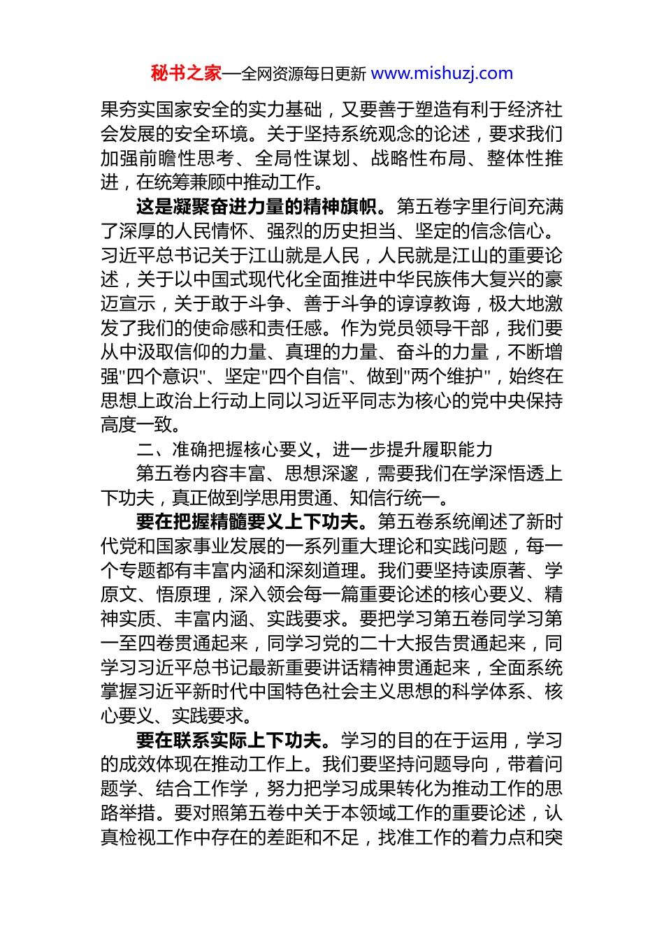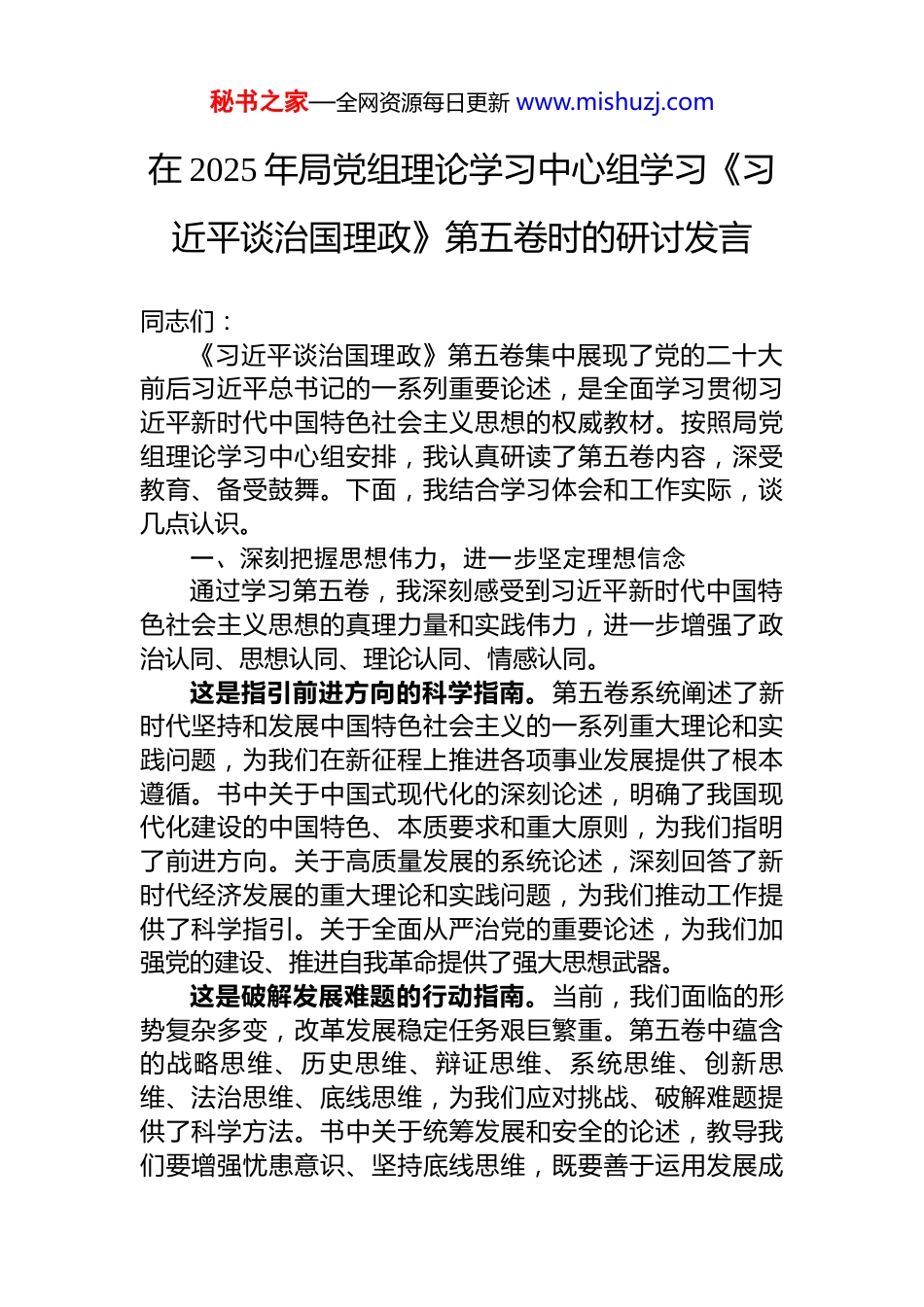 秘书之家—全网资源每日更新 www.mishuzj.com在 2025 年局党组理论学习中心组学习《习近平谈治国理政》第五卷时的研讨发言同志们:《习近平谈治国理政》第五卷集中展现了党的二十大前后习近平总书记的一系列重要论述,是全面学习贯彻习近平新时代中国特色社会主义思想的权威教材。按照局党组理论学习中心组安排,我认真研读了第五卷内容,深受教育、备受鼓舞。下面,我结合学习体会和工作实际,谈几点认识。 一、深刻把握思想伟力,进一步坚定理想信念通过学习第五卷,我深刻感受到习近平新时代中国特色社会主义思想的真理力量和实践伟力,进一步增强了政治认同、思想认同、理论认同、情感认同。这是指引前进方向的科学指南。第五卷系统阐述了新时代坚持和发展中国特色社会主义的一系列重大理论和实践问题,为我们在新征程上推进各项事业发展提供了根本遵循。书中关于中国式现代化的深刻论述,明确了我国现代化建设的中国特色、本质要求和重大原则,为我们指明了前进方向。关于高质量发展的系统论述,深刻回答了新时代经济发展的重大理论和实践问题,为我们推动工作提供了科学指引。关于全面从严治党的重要论述,为我们加强党的建设、推进自我革命提供了强大思想武器。这是破解发展难题的行动指南。当前,我们面临的形势复杂多变,改革发展稳定任务艰巨繁重。第五卷中蕴含的战略思维、历史思维、辩证思维、系统思维、创新思维、法治思维、底线思维,为我们应对挑战、破解难题提供了科学方法。书中关于统筹发展和安全的论述,教导我们要增强忧患意识、坚持底线思维,既要善于运用发展成秘书之家—全网资源每日更新 www.mishuzj.com果夯实国家安全的实力基础,又要善于塑造有利于经济社会发展的安全环境。关于坚持系统观念的论述,要求我们加强前瞻性思考、全局性谋划、战略性布局、整体性推进,在统筹兼顾中推动工作。这是凝聚奋进力量的精神旗帜。第五卷字里行间充满了深厚的人民情怀、强烈的历史担当、坚定的信念信心。习近平总书记关于江山就是人民,人民就是江山的重要论述,关于以中国式现代化全面推进中华民族伟大复兴的豪迈宣示,关于敢于斗争、善于斗争的谆谆教诲,极大地激发了我们的使命感和责任感。作为党员领导干部,我们要从中汲取信仰的力量、真理的力量、奋斗的力量,不断增强"四个意识"、坚定"四个自信"、做到"两个维护",始终在思想上政治上行动上同以习近平同志为核心的党中央保持高度一致。二、准确把握核心要义,进一步提升履职能力第五卷内容丰富、思想深邃,需要我们在学深悟透上下功夫,真正做到学思用贯通、知信行统一。要在把握精髓要义上下功夫。第五卷系统阐述了新时代党和国家事业发展的一系列重大理论和实践问题,每一个专题都有丰富内涵和深刻道理。我们要坚持读原著、学原文、悟原理,深入领会每一篇重要论述的核心要义、精神实质、丰富内涵、实践要求。要把学习第五卷同学习第一至四卷贯通起来,同学习党的二十大报告贯通起来,同学习习近平总书记最新重要讲话精神贯通起来,全面系统掌握习近平新时代中国特色社会主义思想的科学体系、核心要义、实践要求。要在联系实际上下功夫。学习的目的在于运用,学习的成效体现在推动工作上。我们要坚持问题导向,带着问题学、结合工作学,努力把学习成果转化为推动工作的思路举措。要对照第五卷中关于本领域工作的重要论述,认真检视工作中存在的差距和不足,找准工作的着力点和突秘书之家—全网资源每日更新 www.mishuzj.com破口。要善于运用书中蕴含的立场观点方法分析解决实际问题,提高战略思维、创新思维、辩证思维、法治思维、底线思维能力,不断增强工作的系统性、预见性、创造性。要在转化运用上下功夫。理论学习不能停留在纸面上、口头上,必须落实到行动上、体现在工作中。当前,我局面临的改革发展任务十分繁重,既有 XX 方面的重点工作需要突破,又有 XX 领域的短板弱项需要补齐,还有 XX方面的风险隐患需要防范化解。我们要把学习第五卷同谋划推进本单位工作结合起来,同完成年度目标任务结合起来,同解决群众急难愁盼问题结合起来,真正把学习成效转化为推动高质量发展的实际行动...